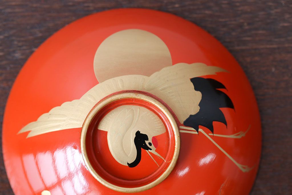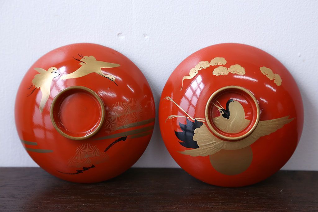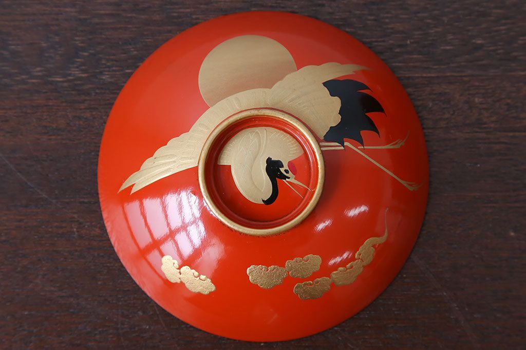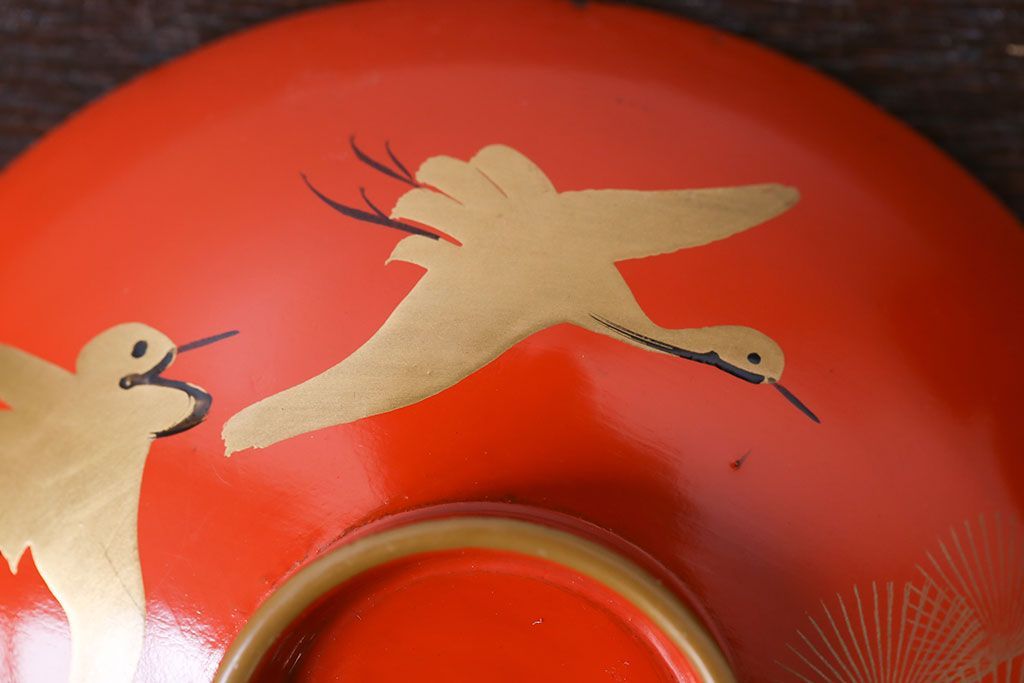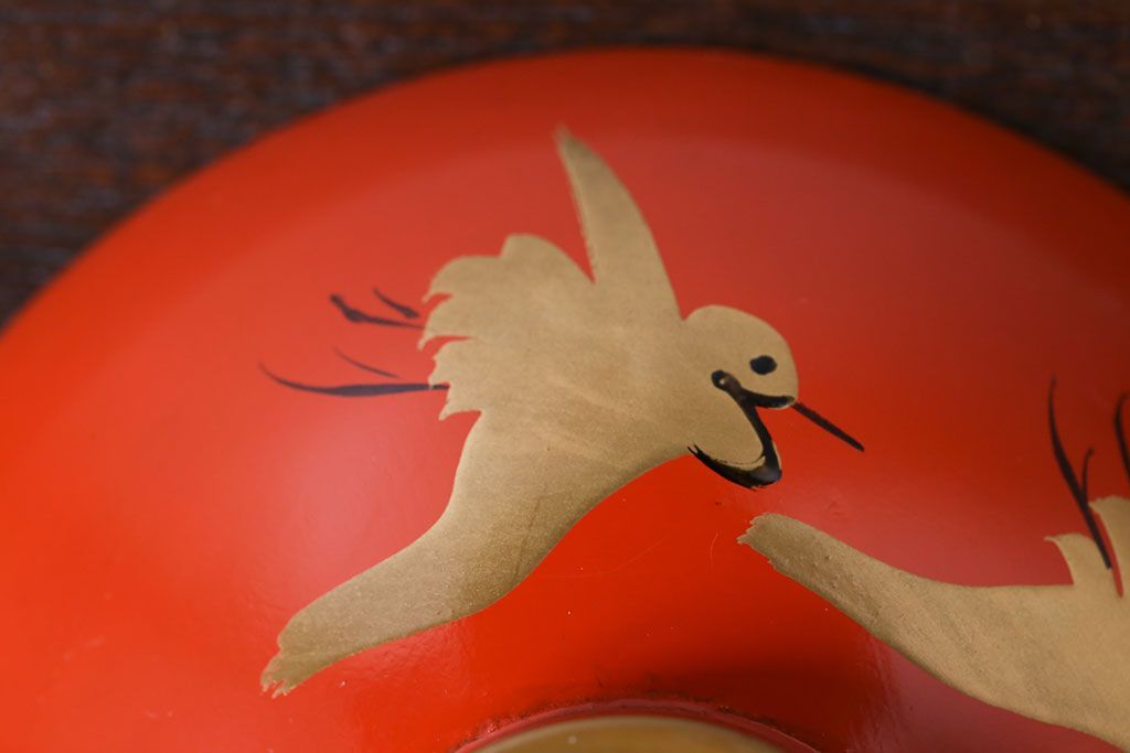 蒔絵は2種あり、鶴が2羽の物が15客、鶴1羽の物が5客です。