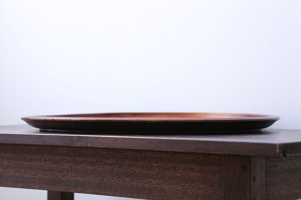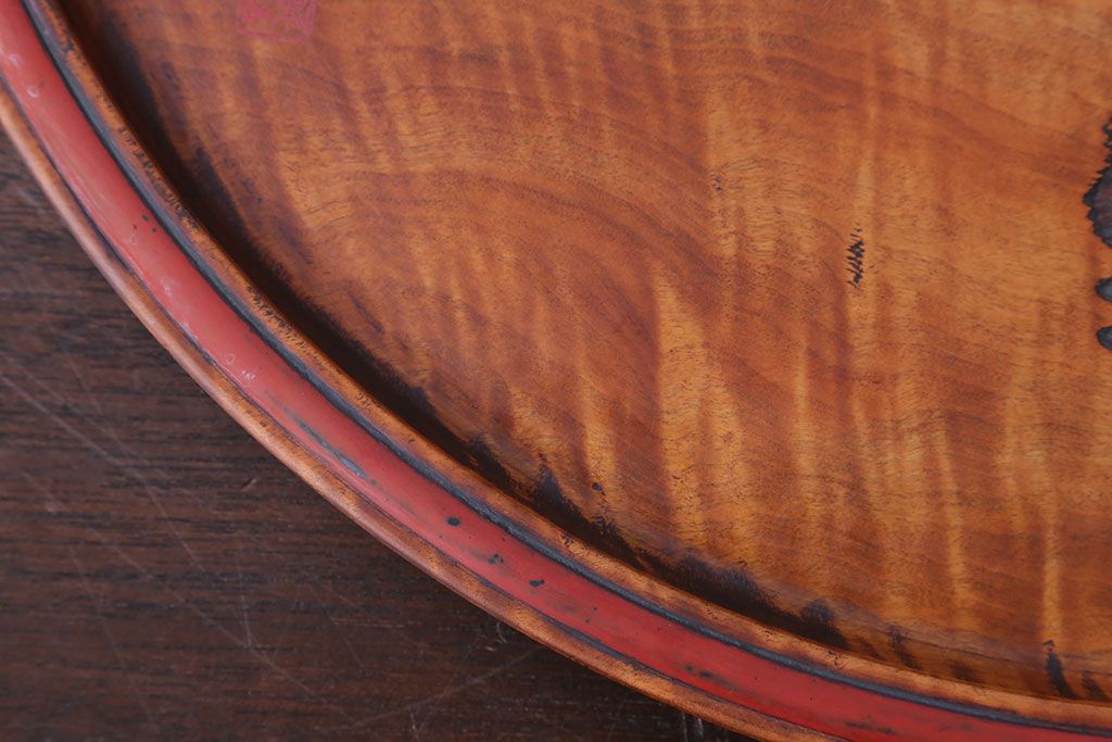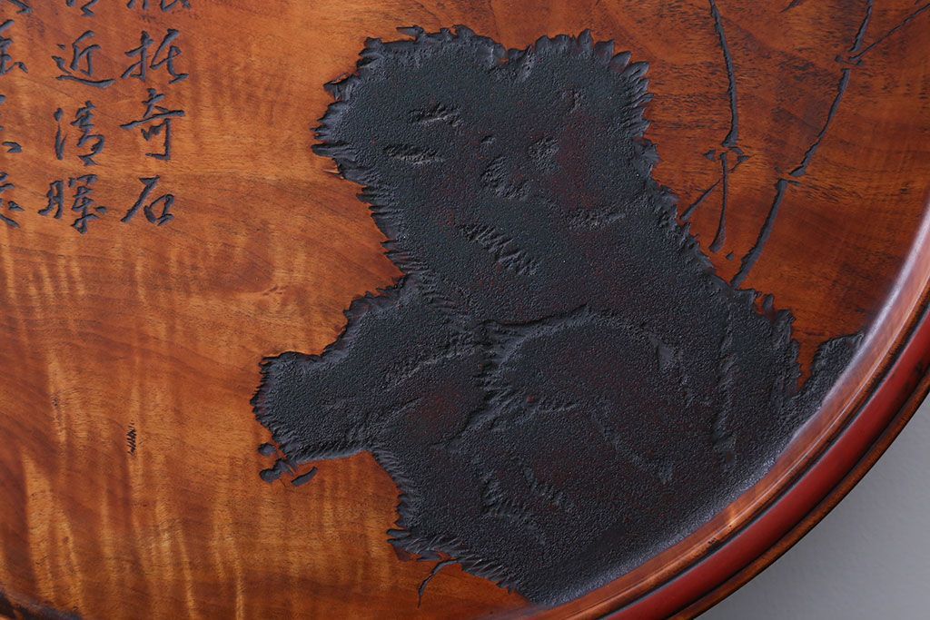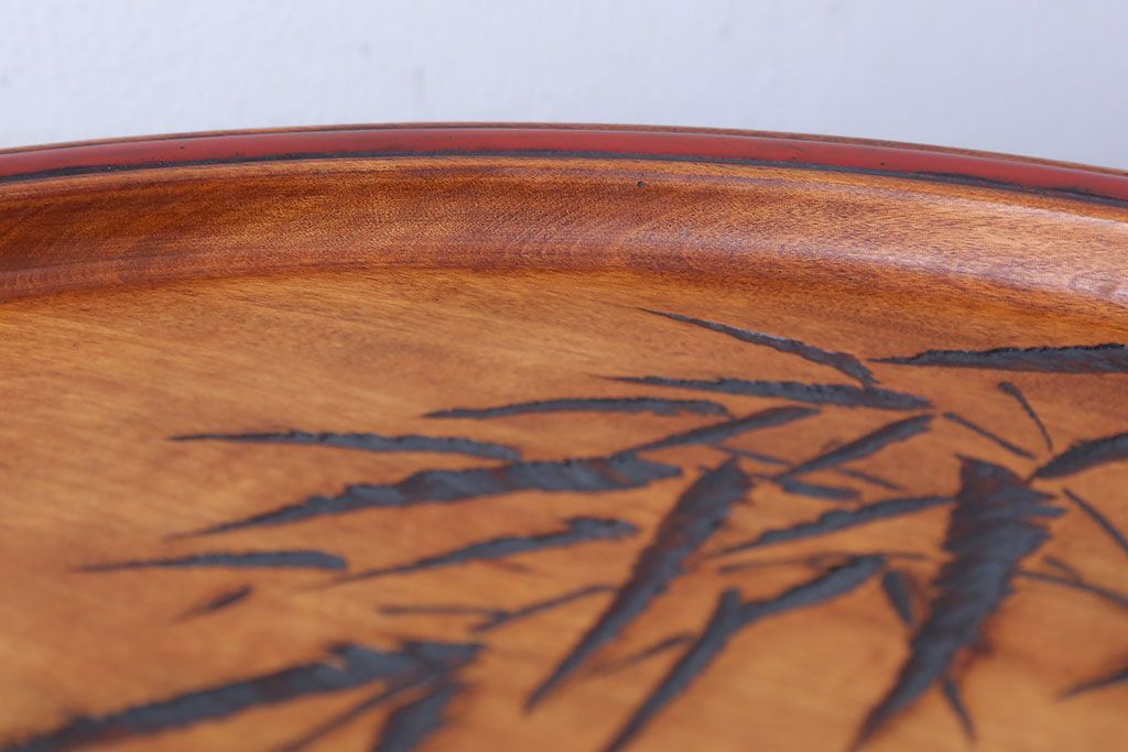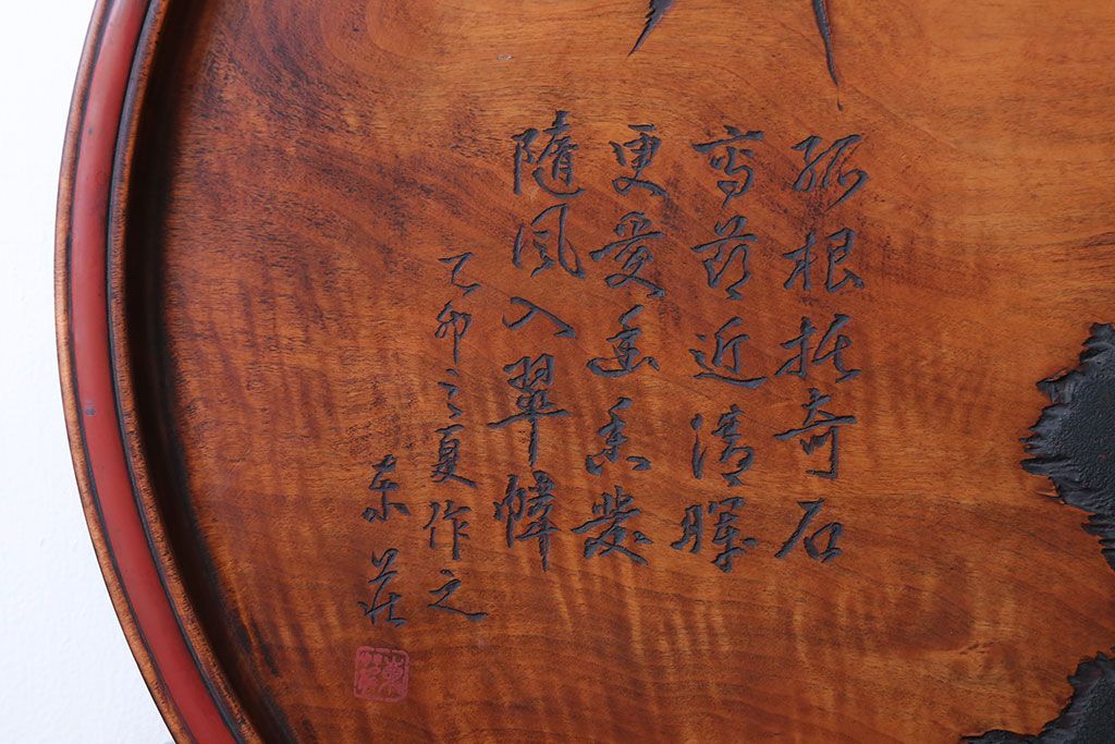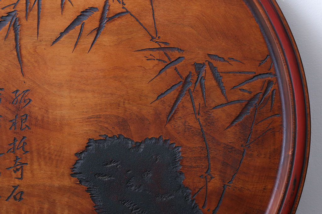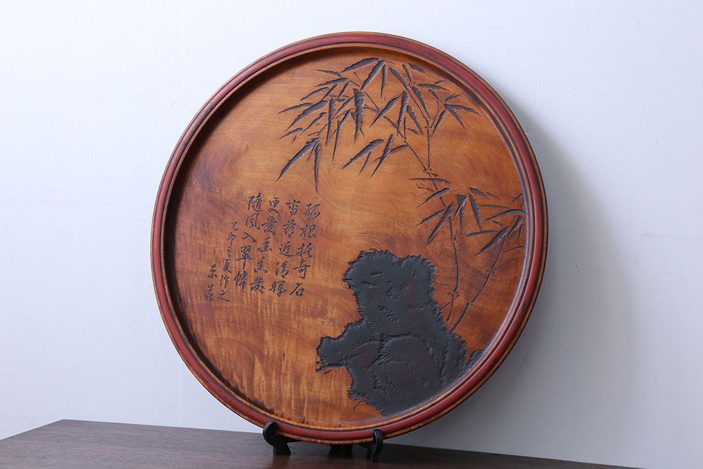アンティーク雑貨 古い彫刻漢詩入り丸盆(中国?)(漆器)