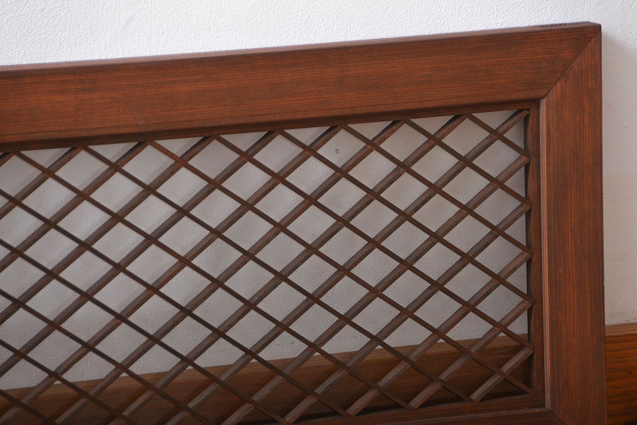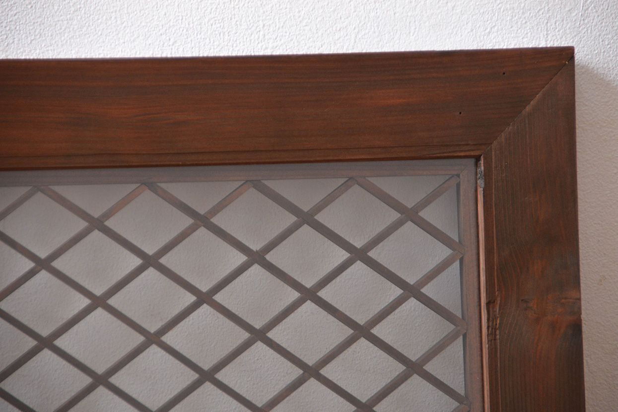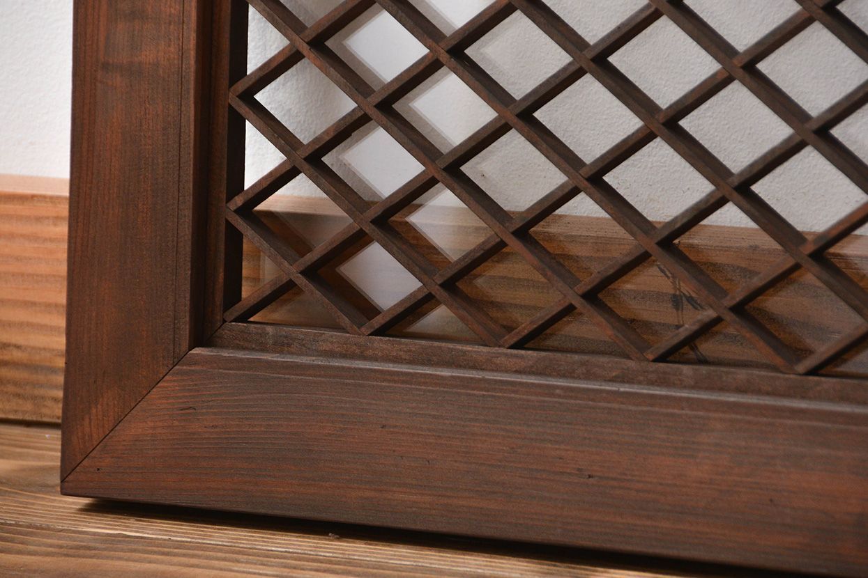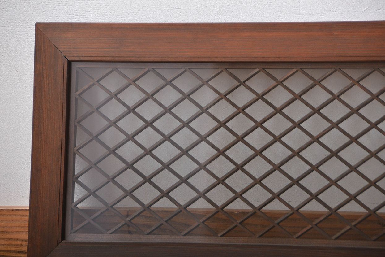 ----※ご注意ください※-------------------------------------- こちらの商品は、玄関先でのお渡しとなります。 また、お届けの際のお日にち指定・お時間指定・代金引換(コレクト)にも対応しておりません。 予めご了承ください。 ----------------------------------------------------------- 古民具・骨董 ガラス入り欄間(2)です。 細かなデザインが美しいガラス入りの欄間です。 組子意匠の基本である、菱組子の一品です。 シンプルで美しく、モダンな雰囲気があるので、 現代の家具やインテリアとも相性抜群です。 パーテーションとしてもご使用いただけます。 使用上問題のあるダメージはありません。 ■框サイズ 上下各55mm/左右各50mm ■重量 約6kg