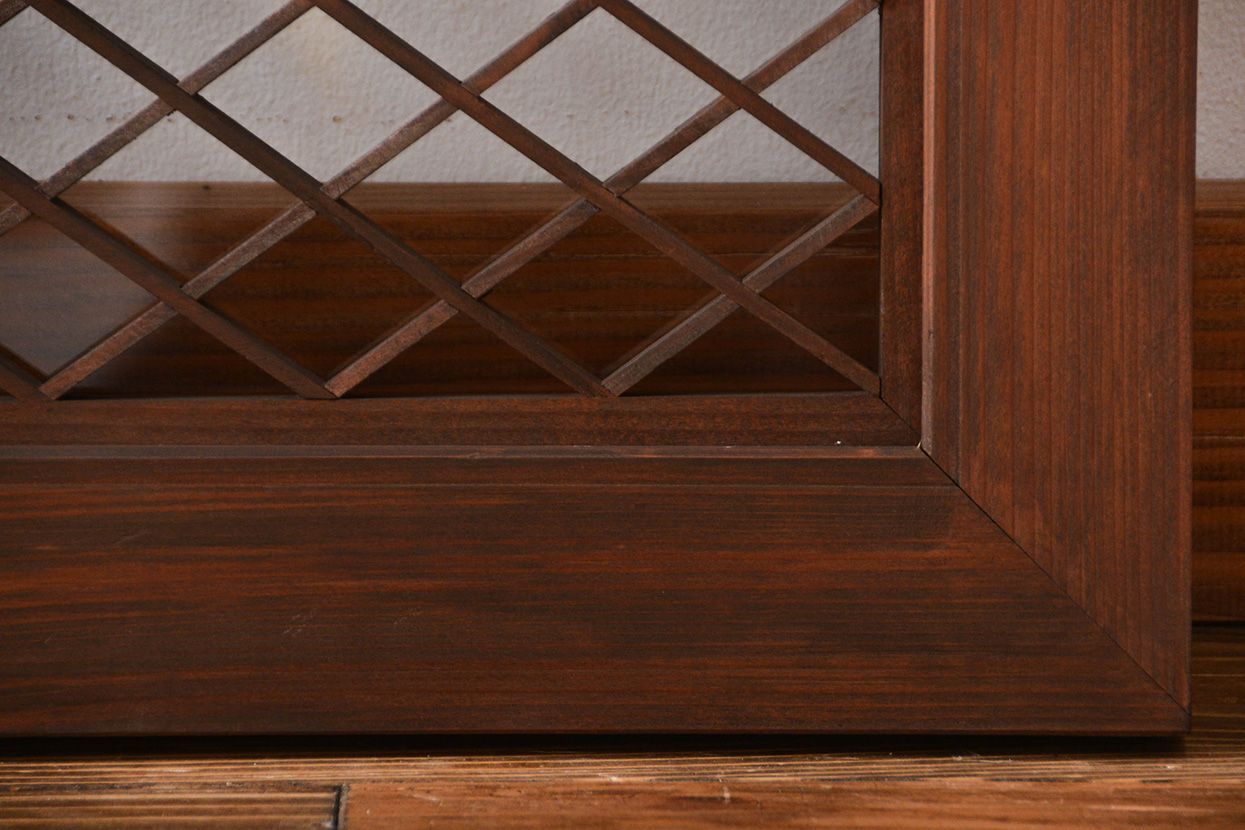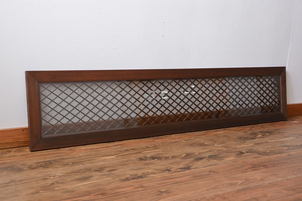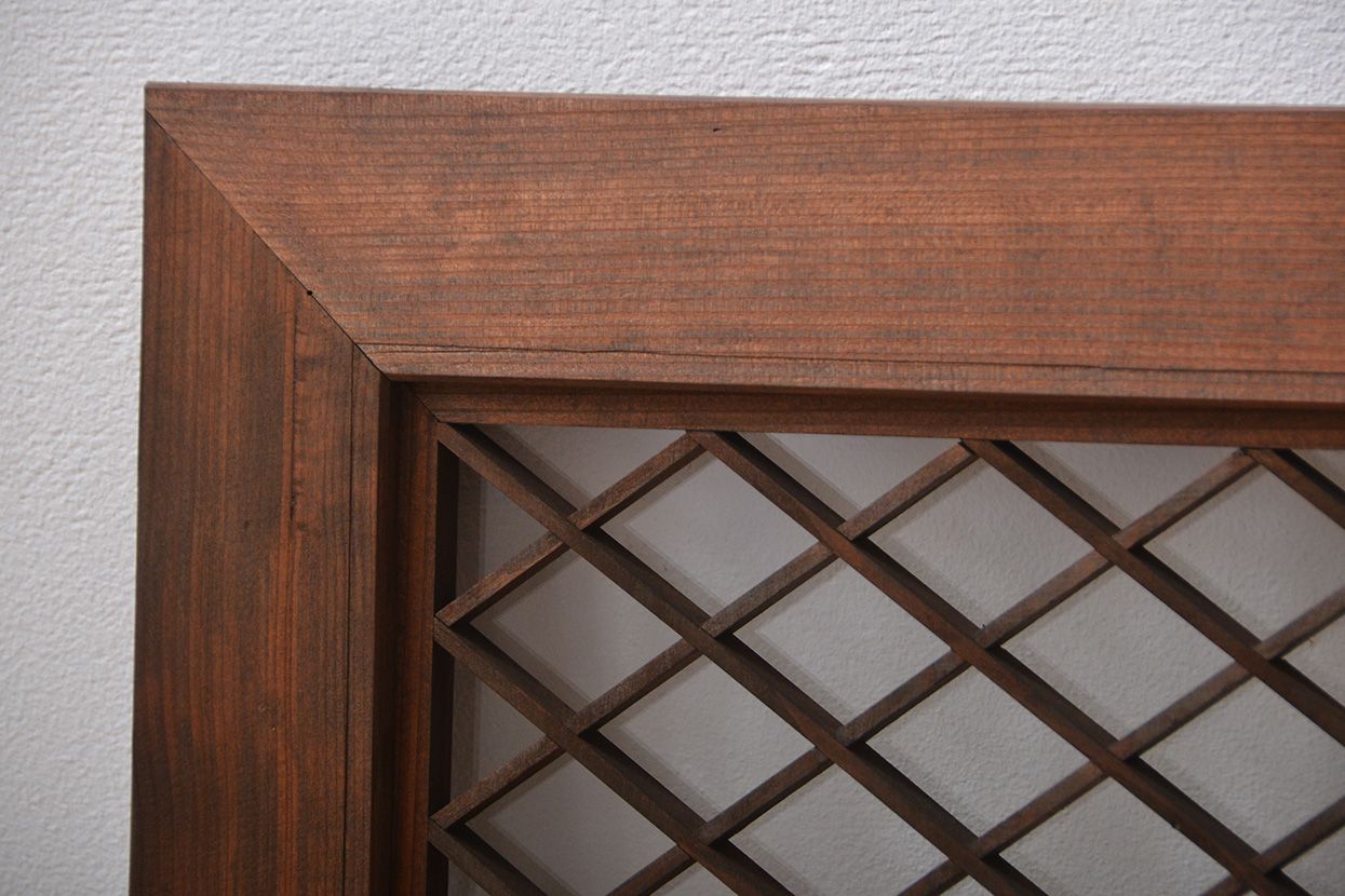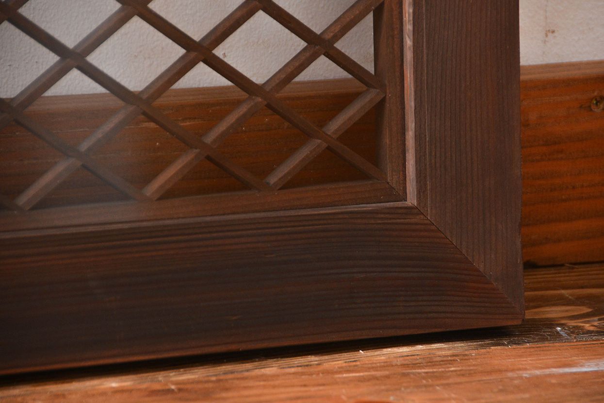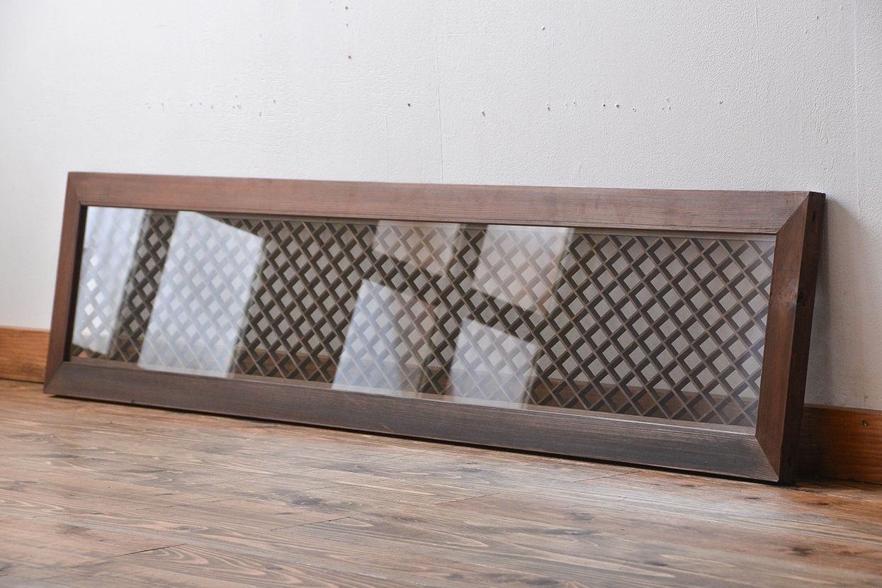 ----※ご注意ください※-------------------------------------- こちらの商品は、玄関先でのお渡しとなります。 また、お届けの際のお日にち指定・お時間指定・代金引換(コレクト)にも対応しておりません。 予めご了承ください。 ----------------------------------------------------------- 古民具・骨董 ガラス入り欄間(2)です。 細かなデザインが美しいガラス入りの欄間です。 組子意匠の基本である、菱組子の一品です。 シンプルで美しく、モダンな雰囲気があるので、 現代の家具やインテリアとも相性抜群です。 パーテーションとしてもご使用いただけます。 使用上問題のあるダメージはありません。 ■框サイズ 上下各55mm/左右各50mm ■重量 約6kg