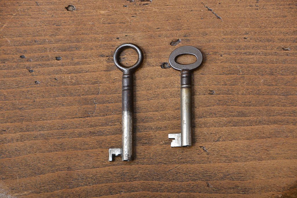 鍵は付属します。画像にありますように、袋に入れお付けします。スムーズに動くように調整していますが、あくまでも古いものや中古品ですので、長期の使用保証は出来かねます。ご購入後不具合が発生した場合は、当店でサポートさせていただきますので、お気軽にご相談くださいませ。
