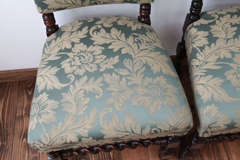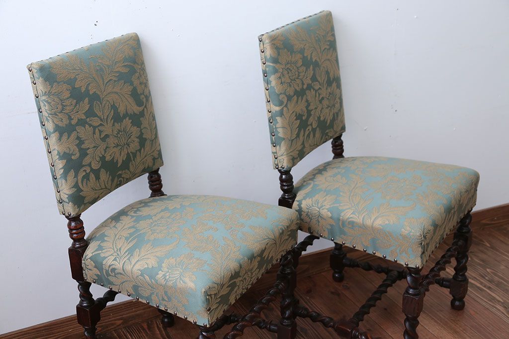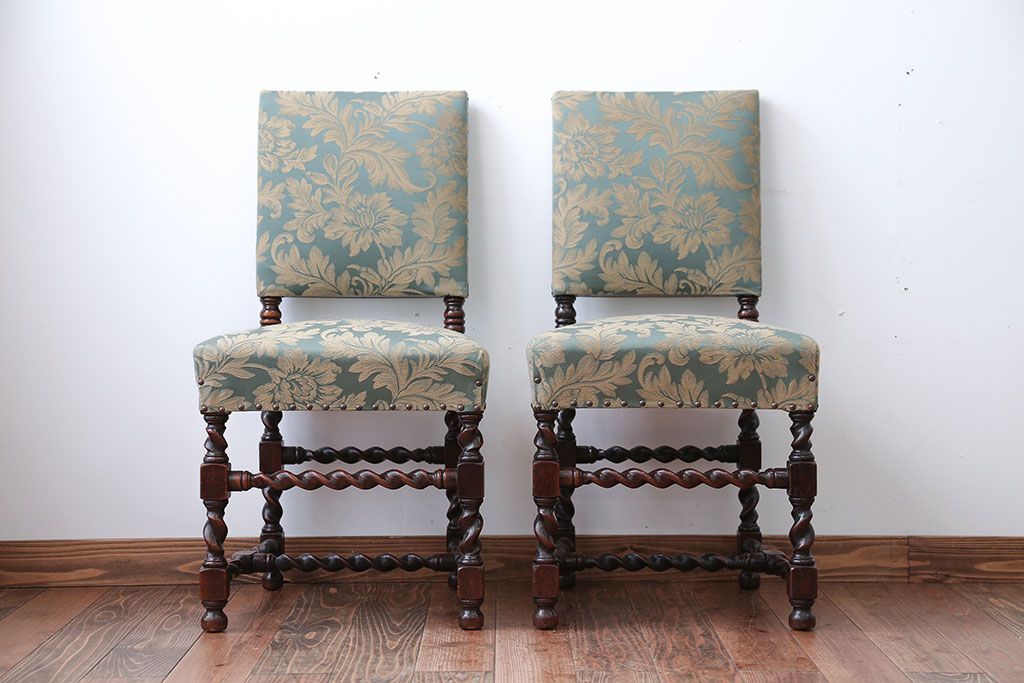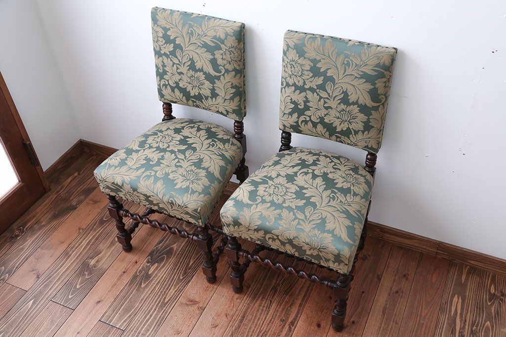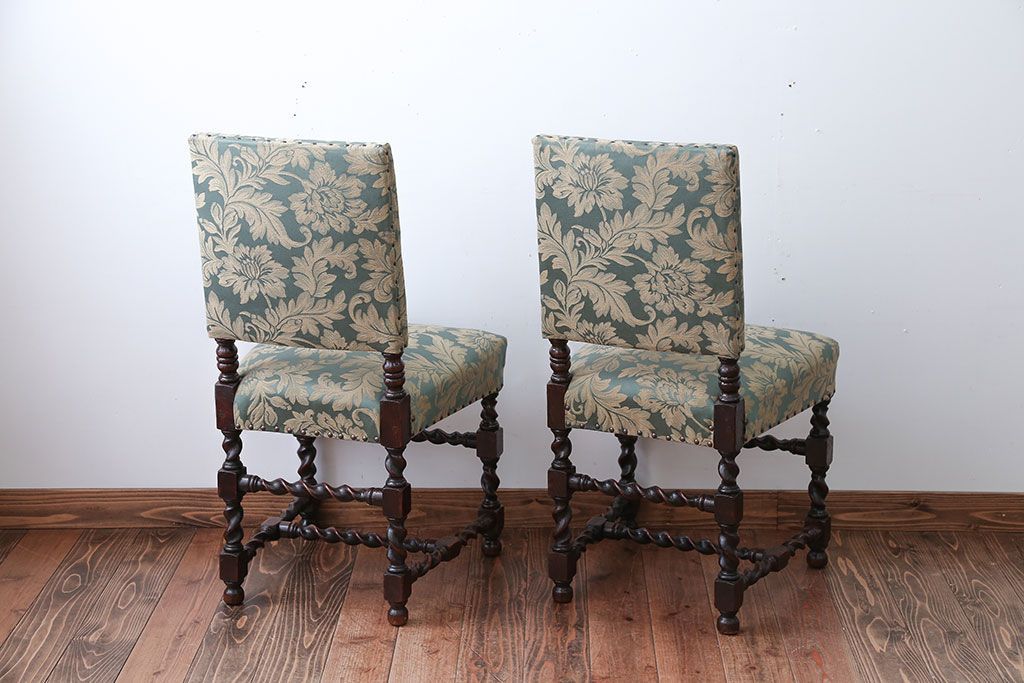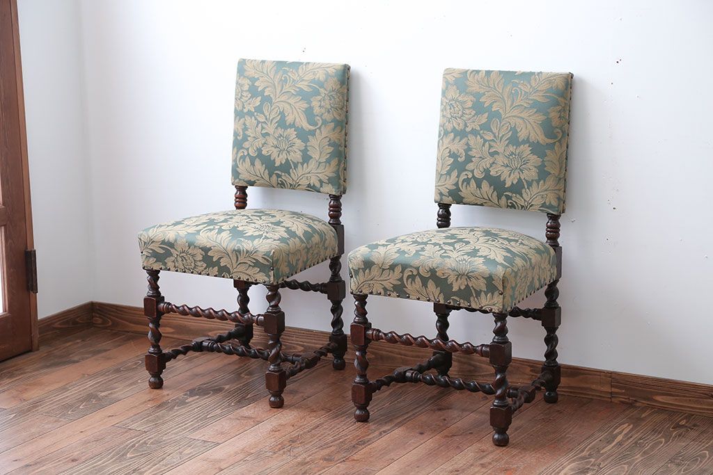 中古 イギリス製 オーク材の優雅なツイストレッグダイニングチェア2脚セット(1)です。