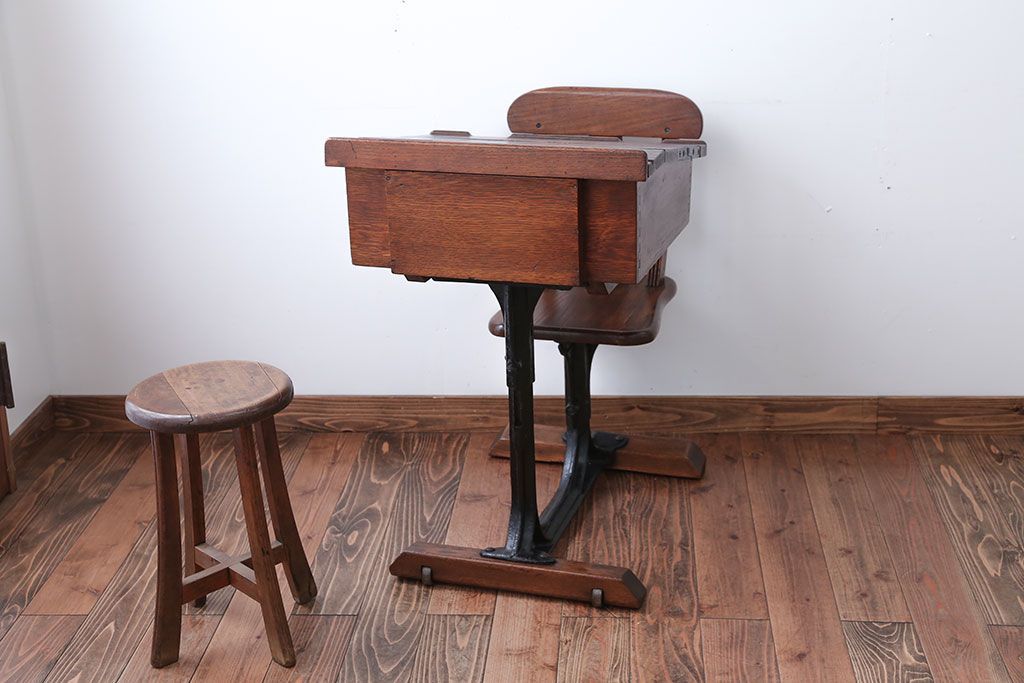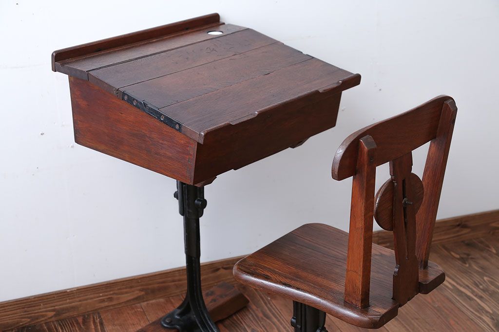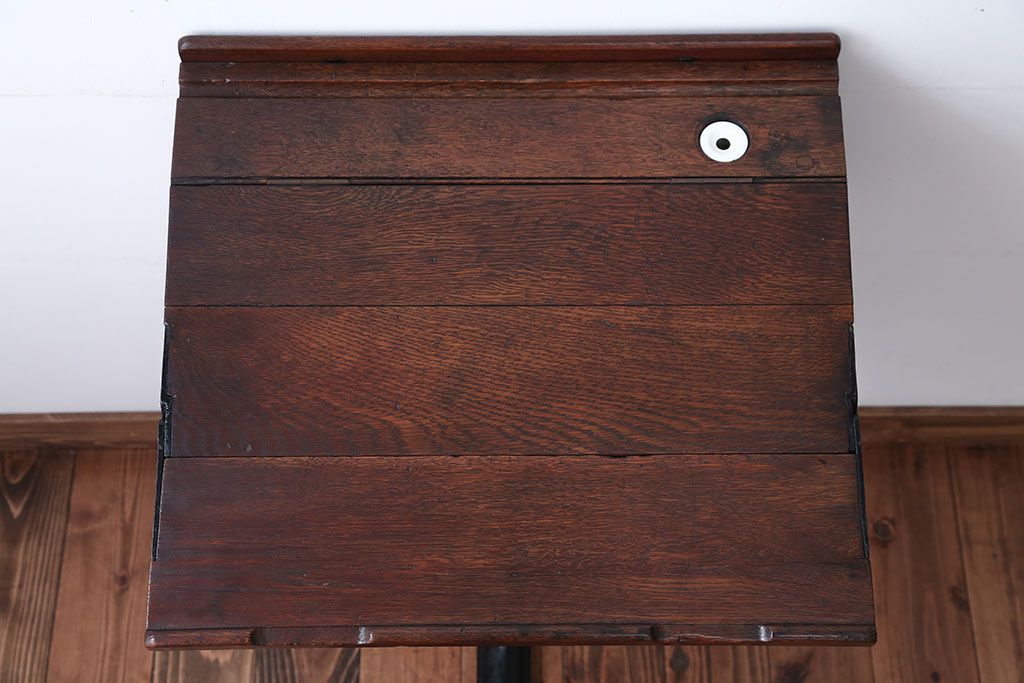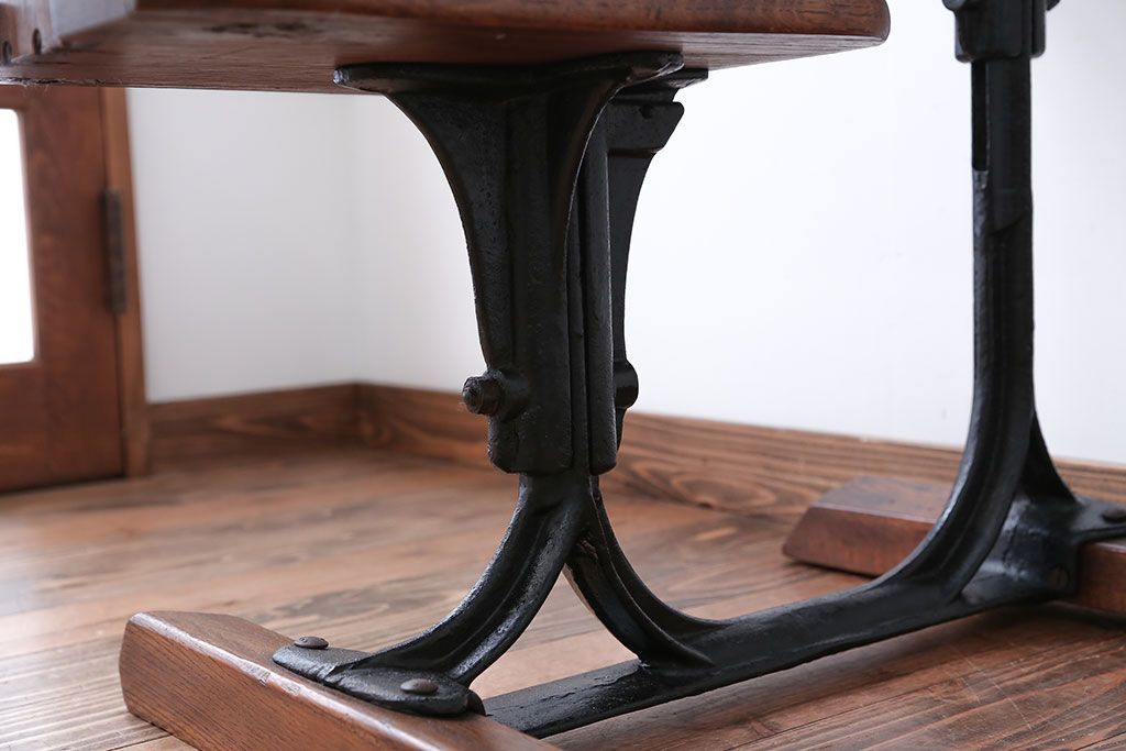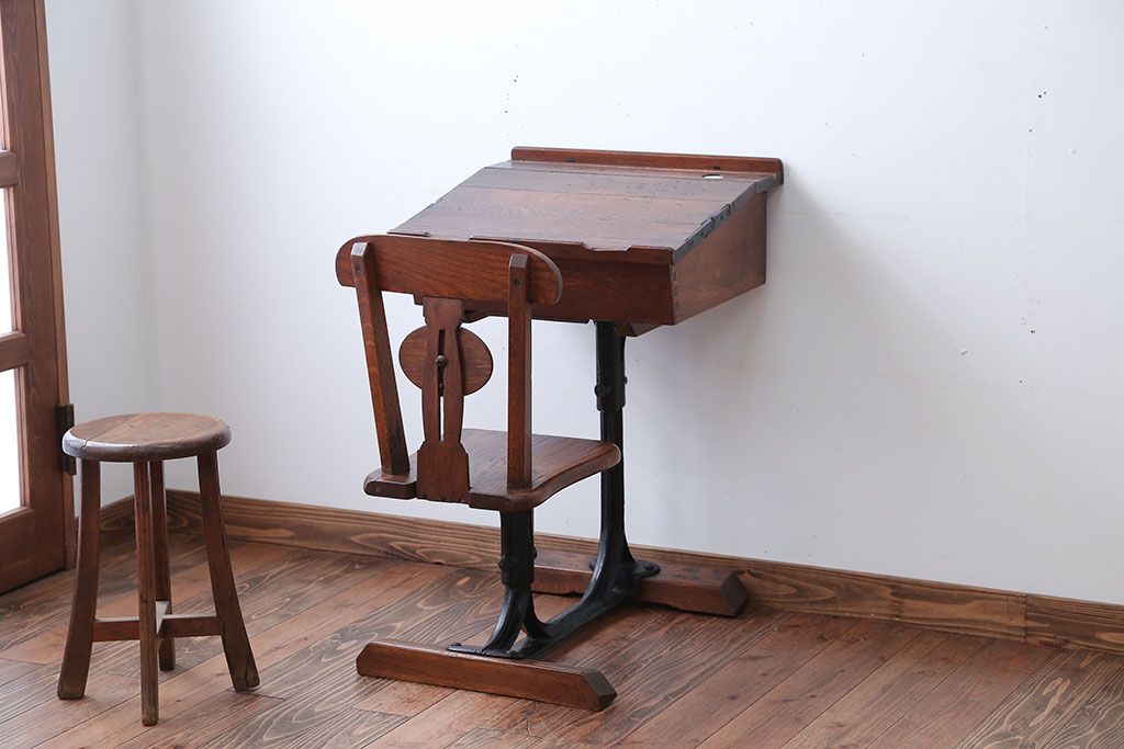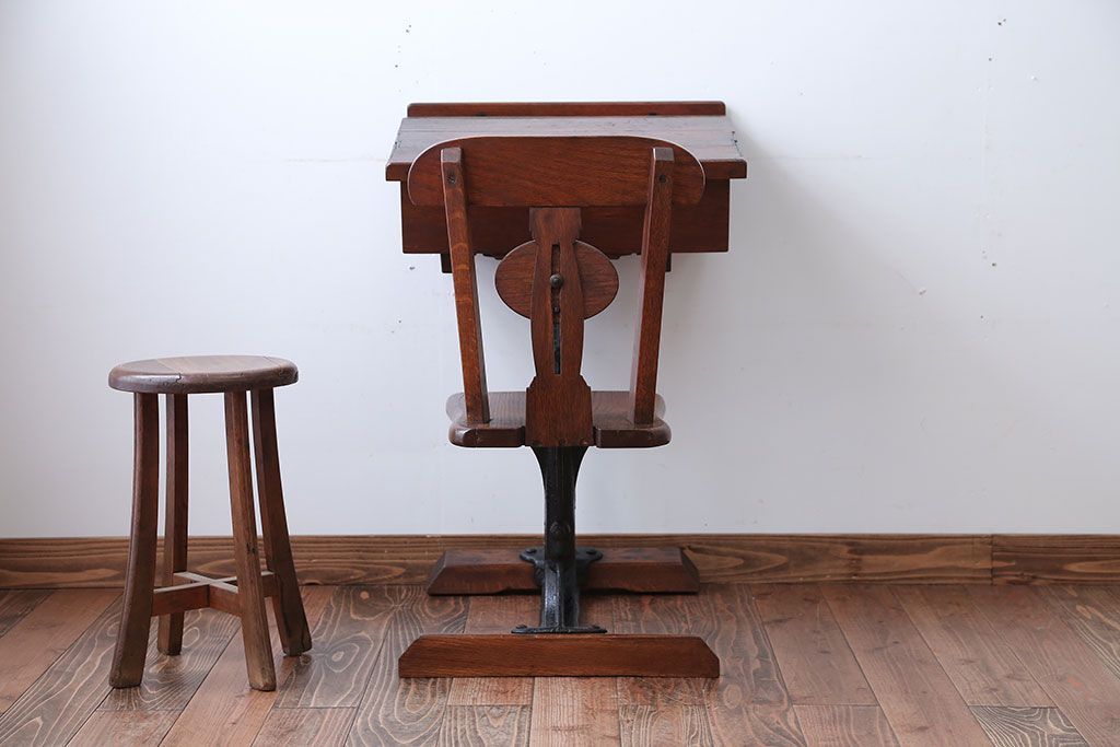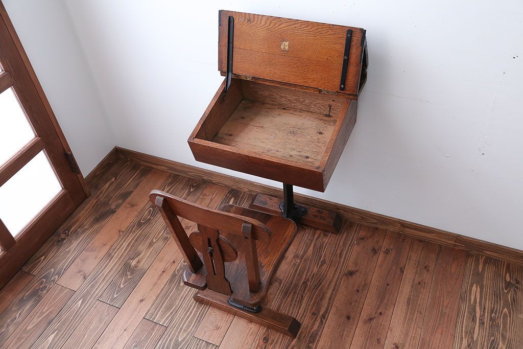 アンティーク家具 イギリスアンティーク オーク材!チェア付き鉄脚スクールデスク