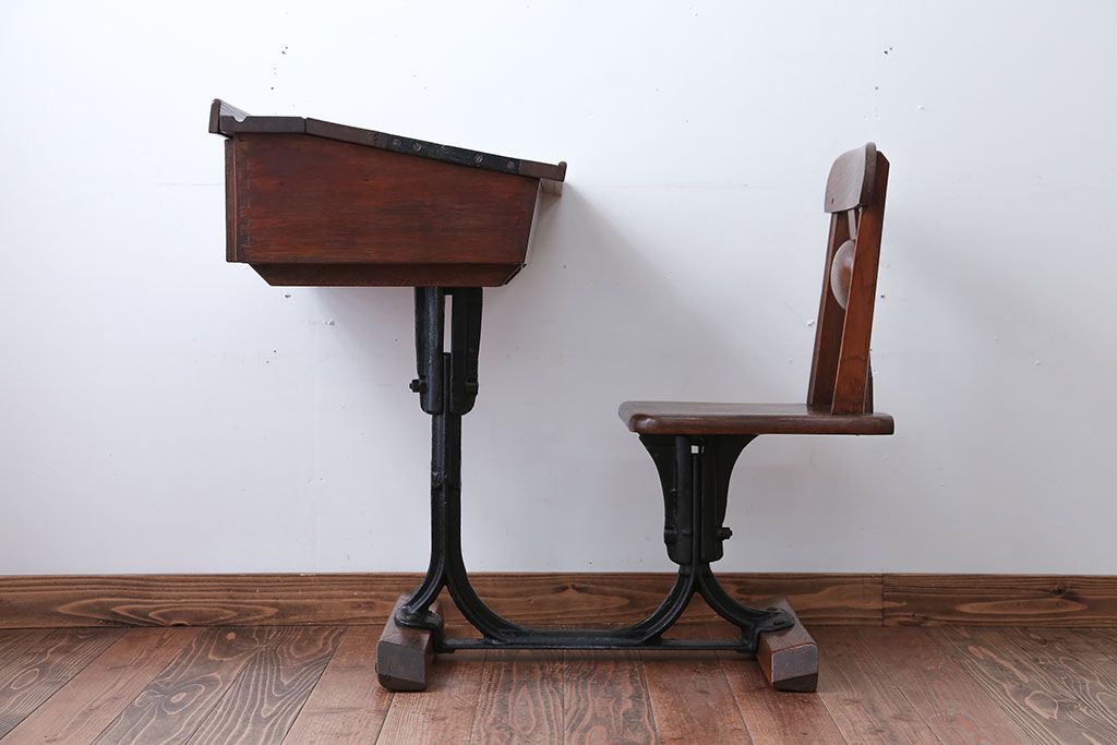 イギリスアンティークのチェア付き鉄脚スクールデスクです。