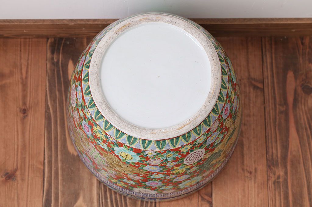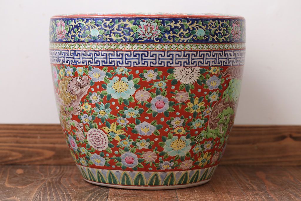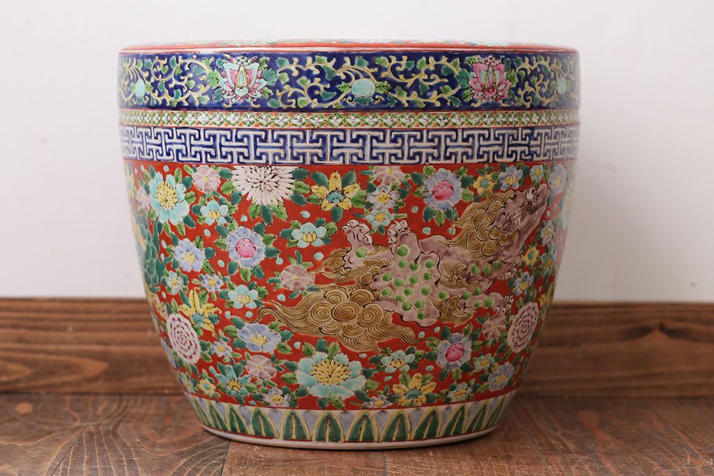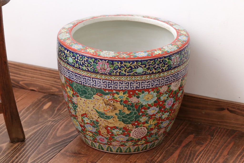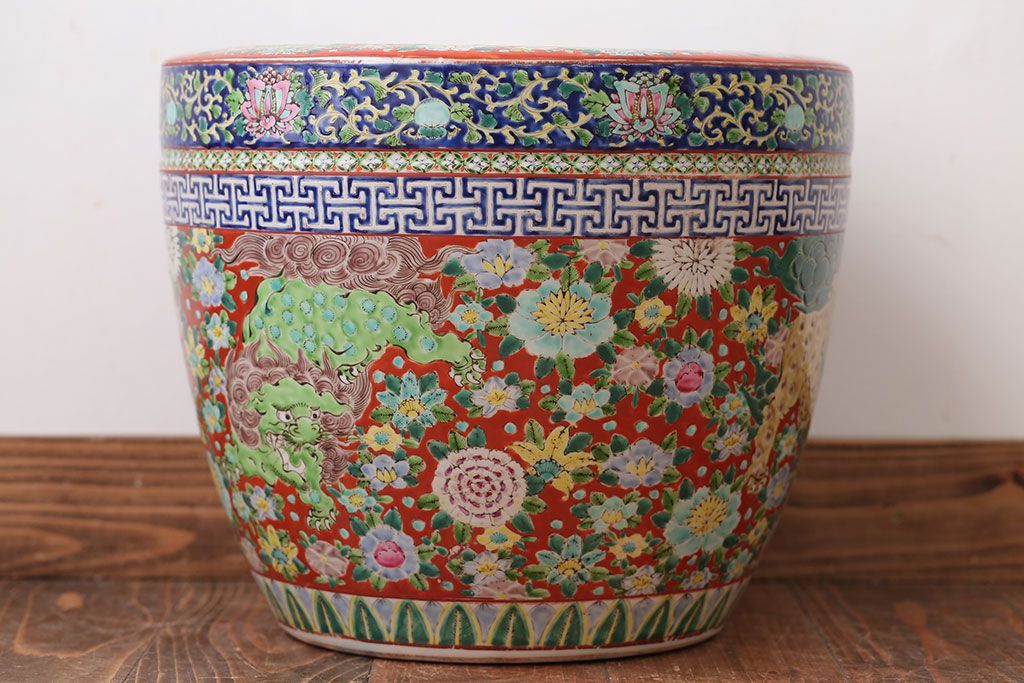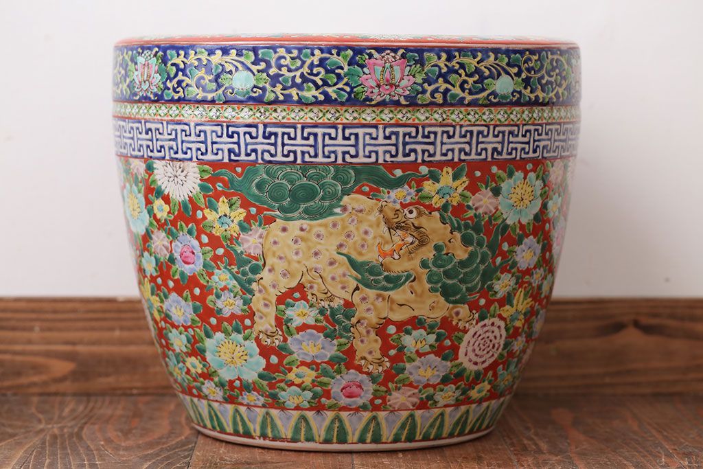 アンティーク雑貨 古民具・骨董 獅子の図 色絵火鉢 (十錦手)
