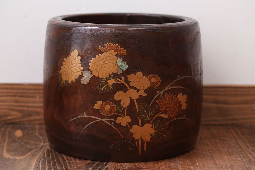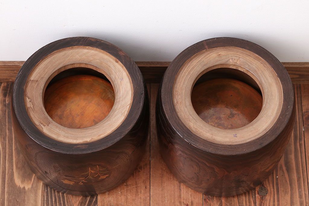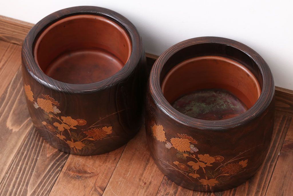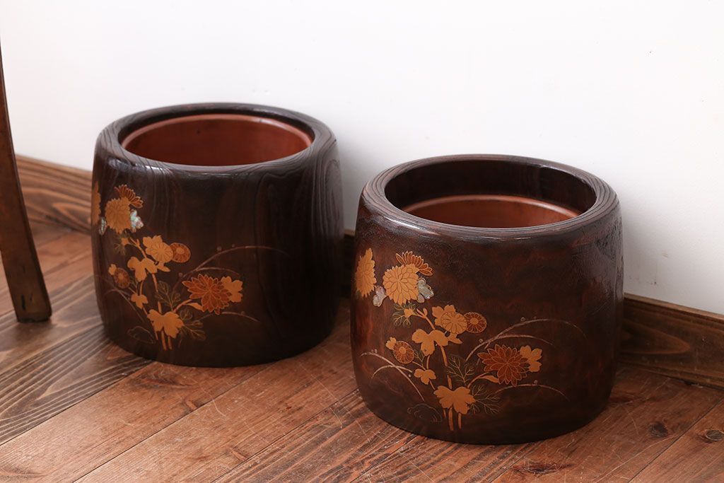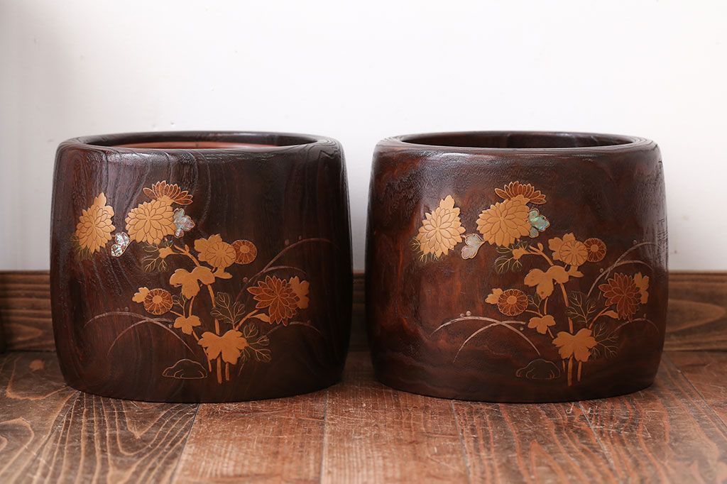 アンティーク雑貨 古民具・骨董 古い螺鈿金蒔絵桐火鉢一対
