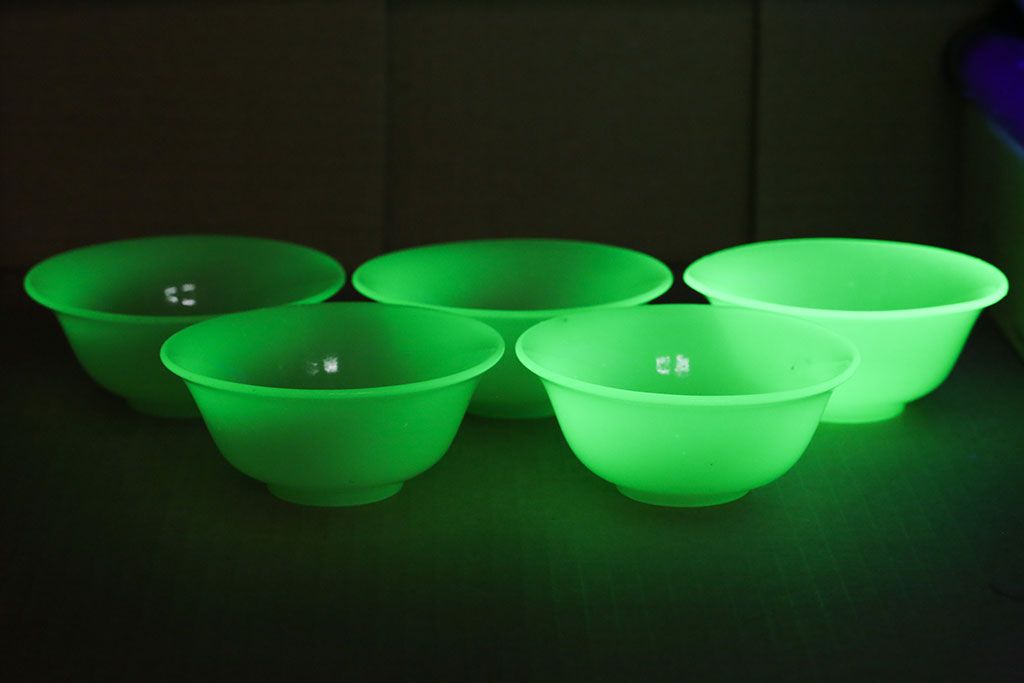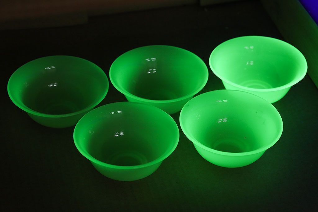 ラフジュ工房> 骨董・美術品> 骨董-ガラス食器 > アンティーク雑貨 アンティーク 大正〜昭和初期・ウランガラス小鉢5個セット(氷コップ)(2)