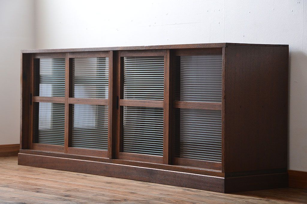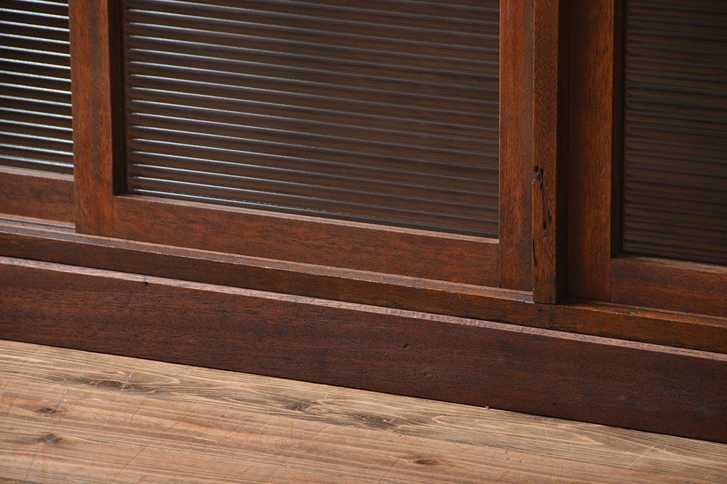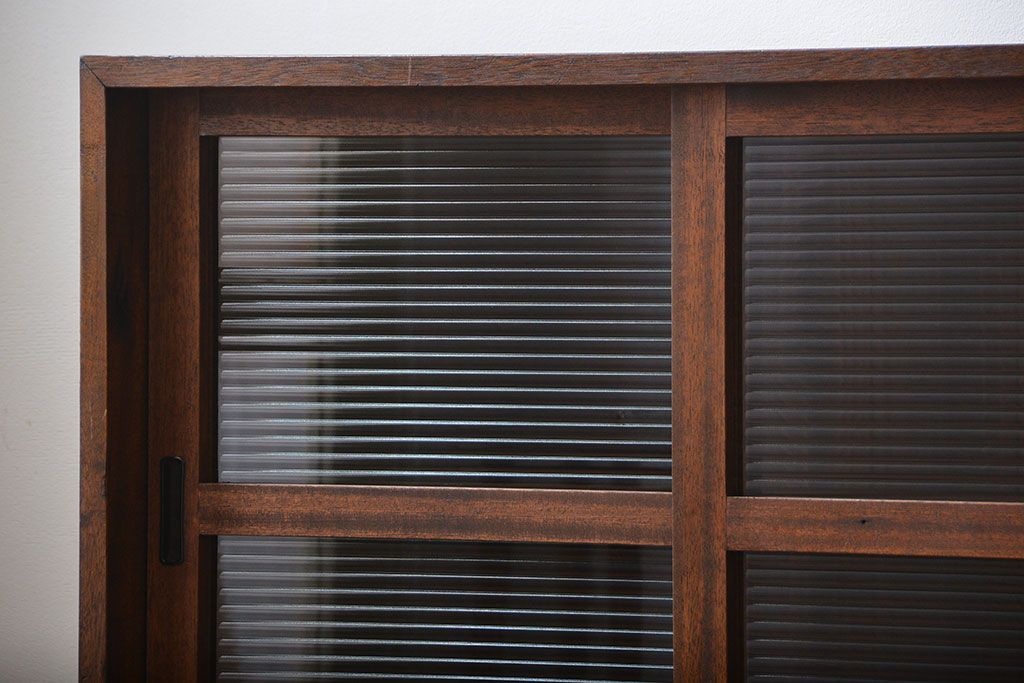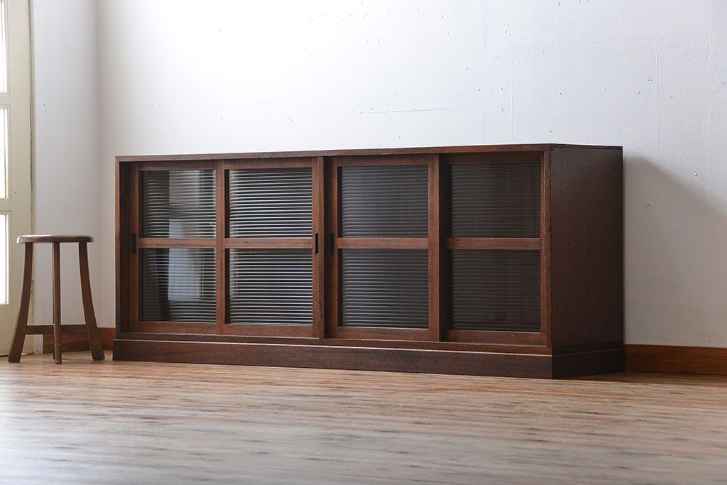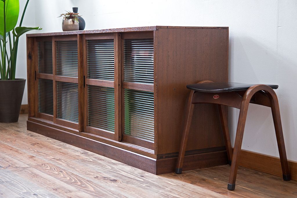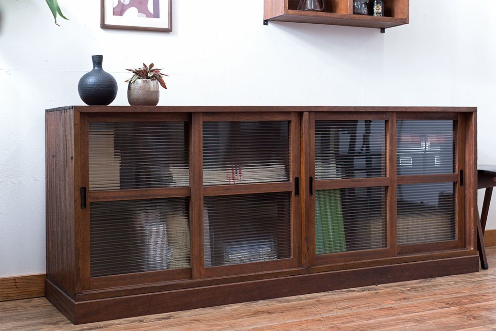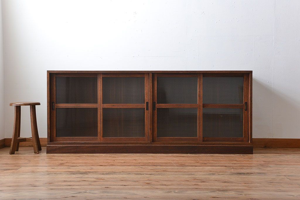 レトロ家具 昭和レトロ モールガラス入り!4枚引き戸のアンティーク収納棚