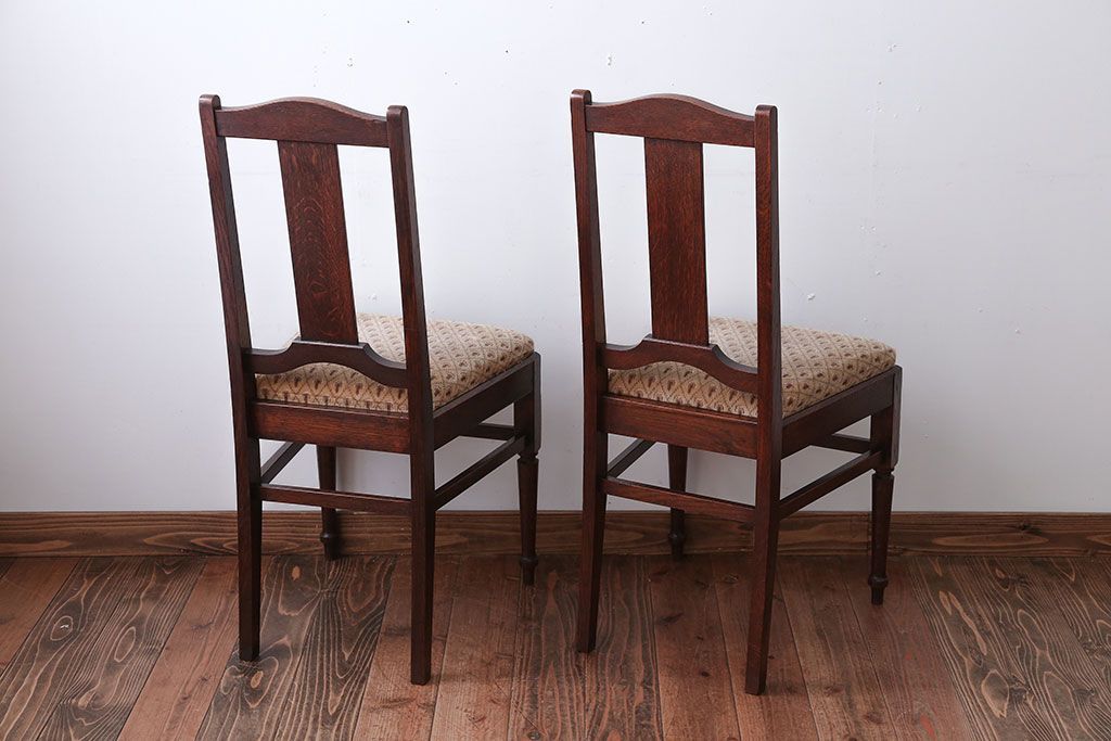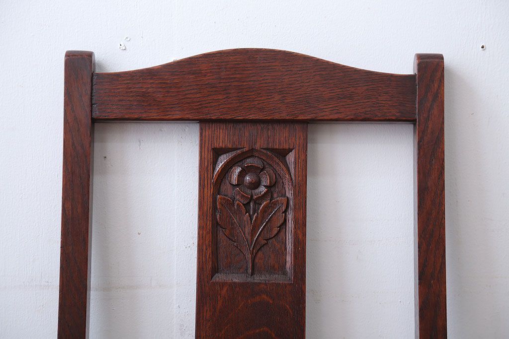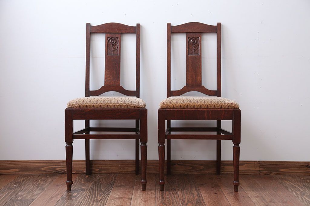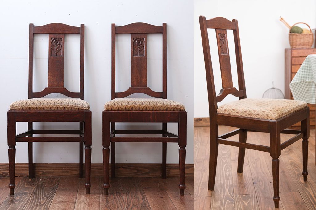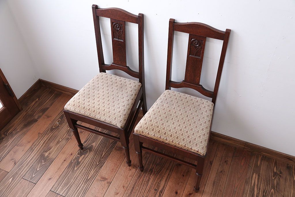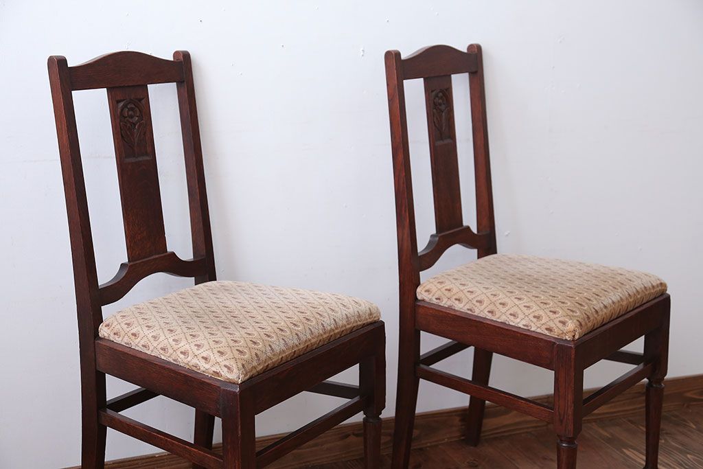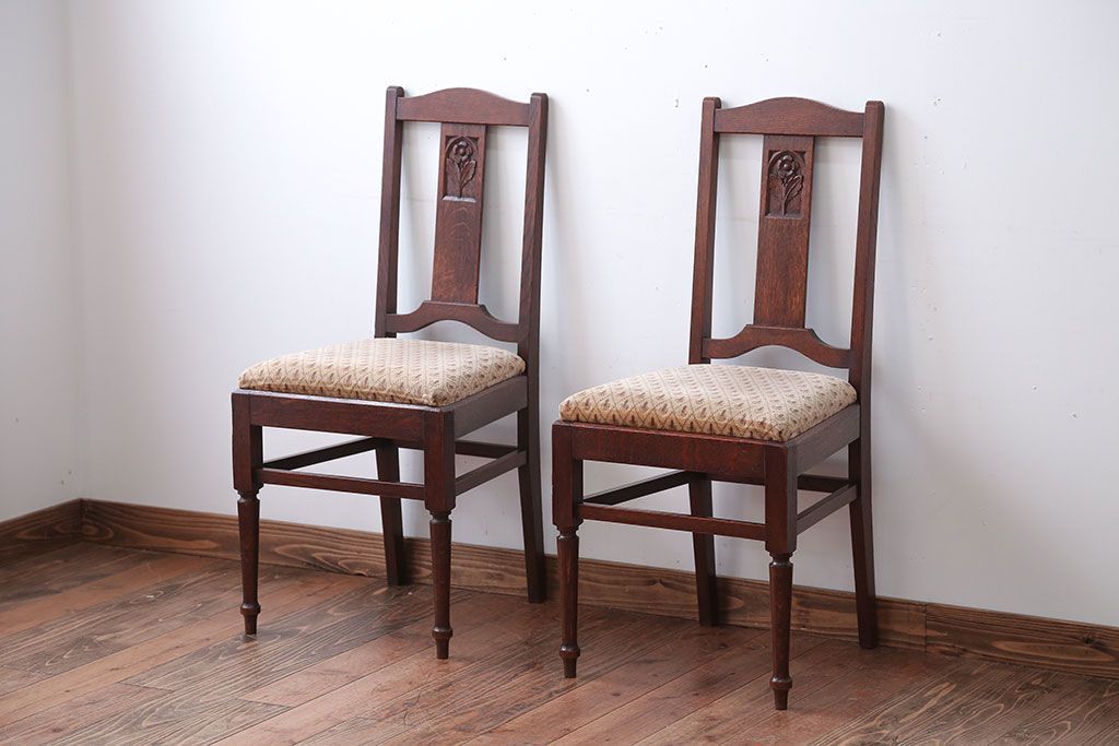 アンティーク家具 イギリスアンティーク 彫刻が美しいオーク材の大ぶりなダイニングチェア2脚セット