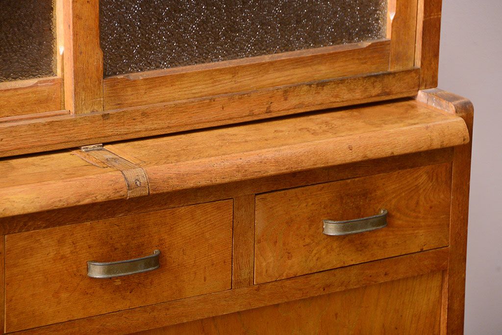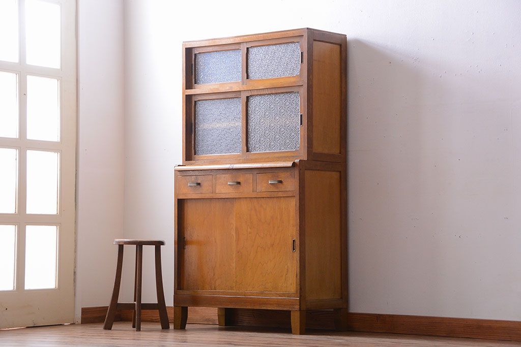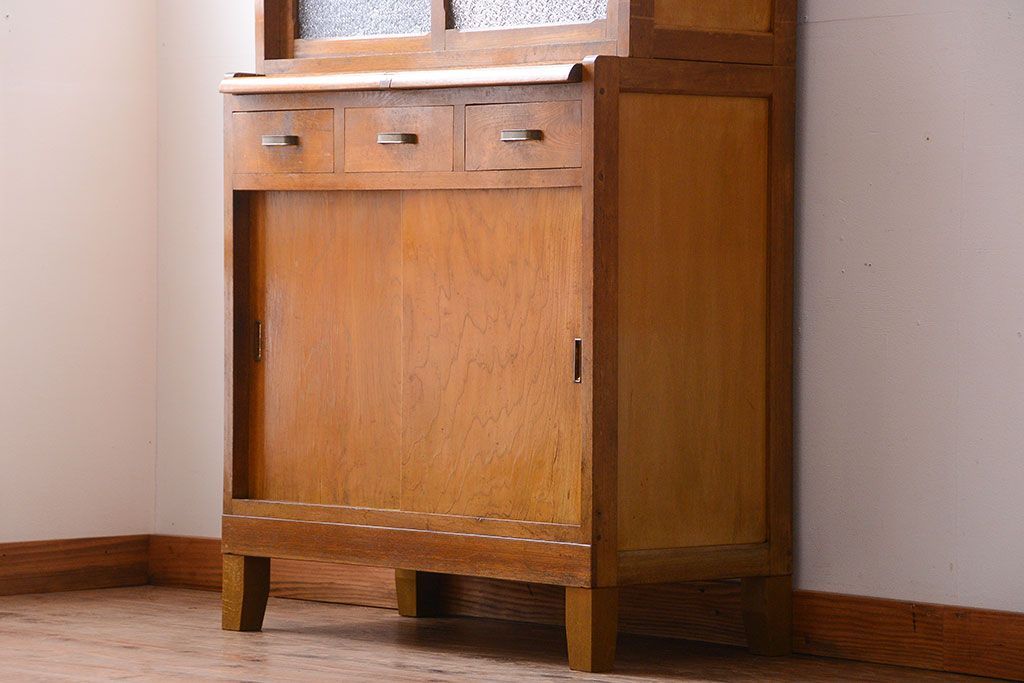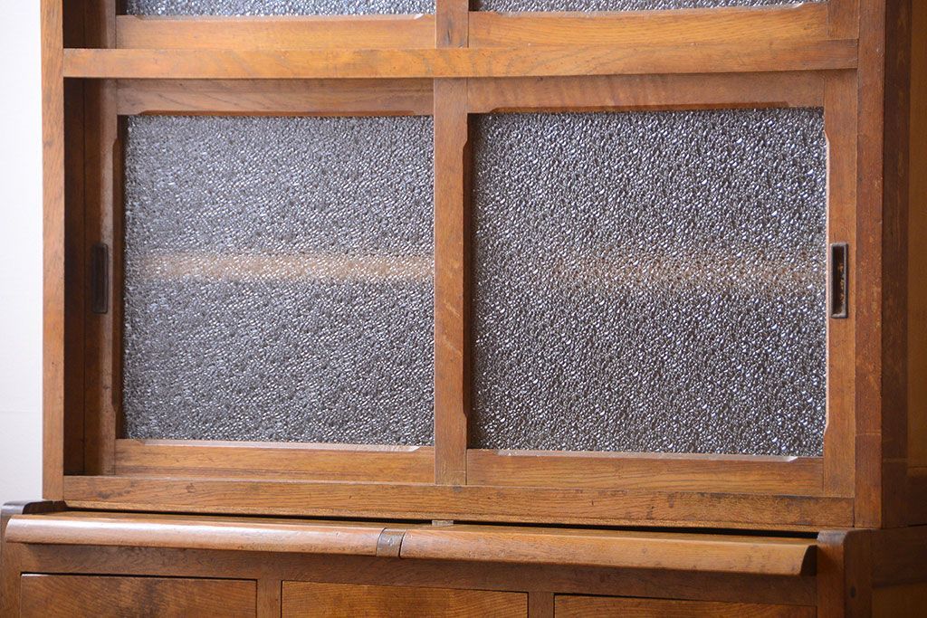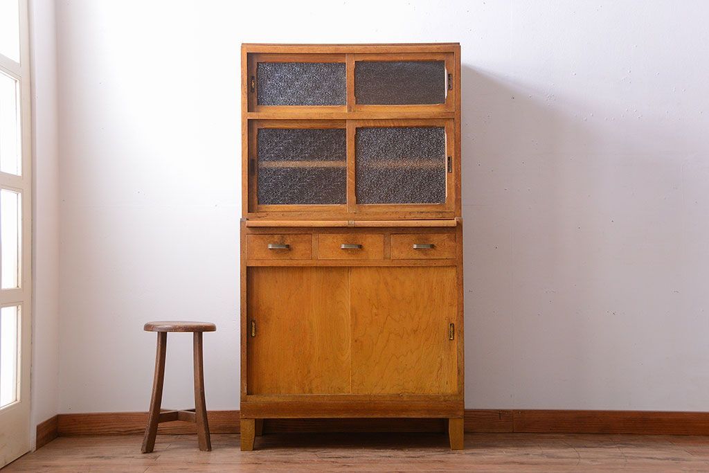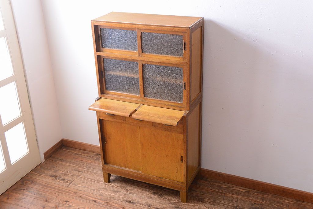 昭和レトロ ダイヤガラス入り!古い木製の脚付き食器棚(カップボード)です。