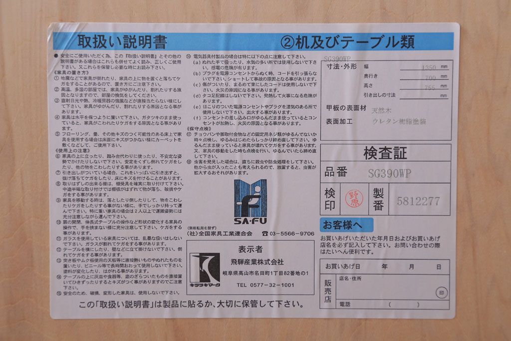 中古 キツツキマーク 飛騨産業 SG-390WP デスク C4色(定価約16万円)です。
