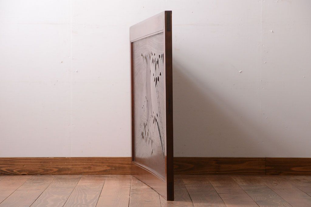 ----※ご注意ください※-------------------------------------- こちらの商品は、玄関先でのお渡しとなります。 また、お届けの際のお日にち指定・お時間指定・代金引換(コレクト)にも対応しておりません。 予めご了承ください。 ----------------------------------------------------------- 古民具・骨董 最高級品!漆が美しい欅一枚板の欄間(2)です。 はっきりとした豊かな木目が美しい、 高級素材であるケヤキ材の一枚板を鏡板に使用した、 和製アンティークの欄間です。 美しい漆塗りで仕上げられた最高級品です。 サイズも大きく存在感も抜群です。 このように上質なお品は、 もう2度と出会えないといっても過言ではない逸品です。 風情溢れる美しい透かし彫りが、 和風のインテリアに極上の高級感をもたらす、 旅館や料亭などにもおすすめの逸品です。 画像にありますように鏡板に反り・僅かに割れがありますが、使用上、強度上に問題はありません。 使用上問題のあるダメージはありません。 ■重量 約7kg ■框サイズ 上下各70mm/左右各60mm