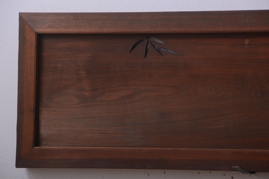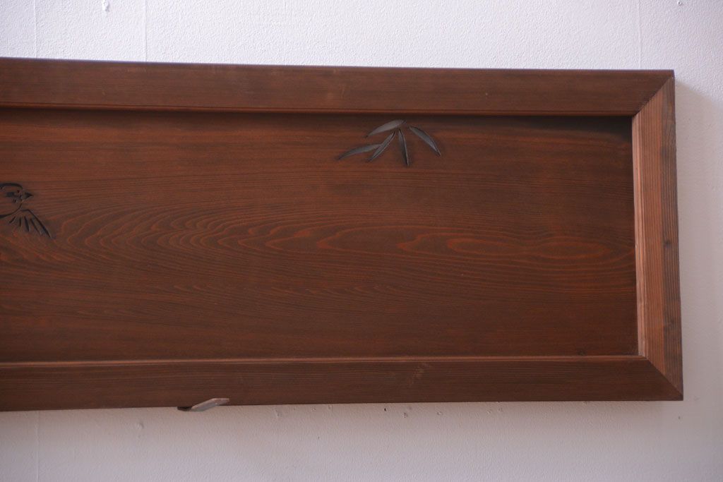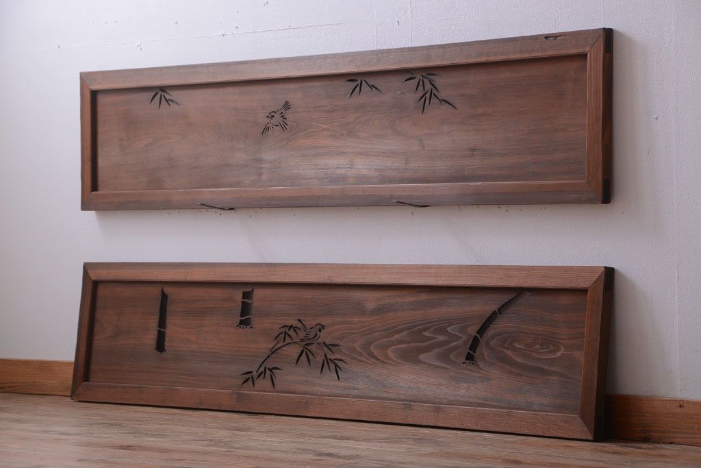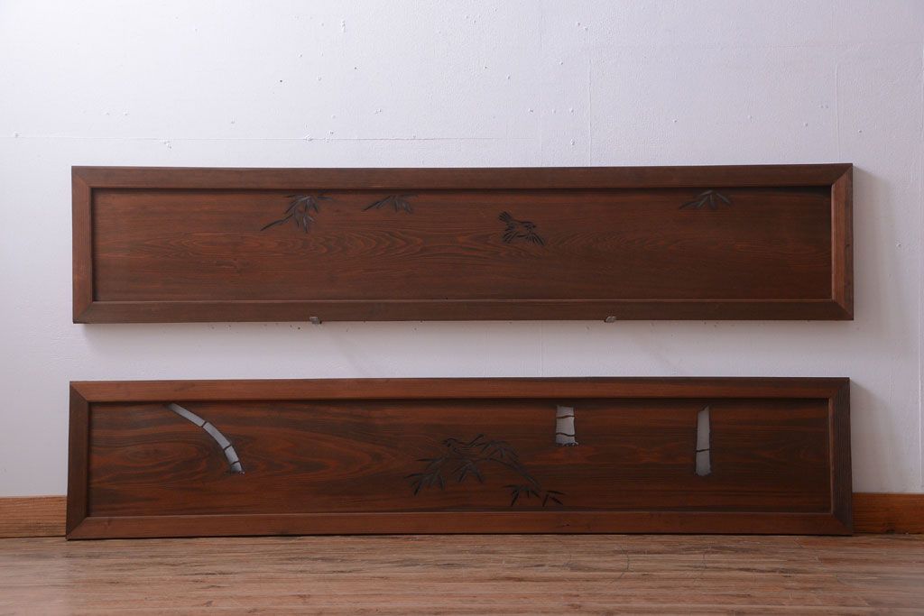 ----※ご注意ください※-------------------------------------- こちらの商品は、玄関先でのお渡しとなります。 また、お届けの際のお日にち指定・お時間指定・代金引換(コレクト)にも対応しておりません。 予めご了承ください。 ----------------------------------------------------------- 古民具・骨董 趣溢れる透かし彫りのアンティーク欄間2枚セットです。 竹と雀の透かし彫りが風情を感じさせる、 和製アンティークの欄間です。 古い木の質感が味わい深い、 和風インテリアにぴったりのお品です。 壁掛けのディスプレイとしてもおすすめです。 画像にありますように透かしの一部に欠けがありますが、使用上、強度上に問題はありません。 使用上問題のあるダメージはありません。 ■重量 約2kg ■框サイズ 上45mm/下45mm/左40mm/右40mm