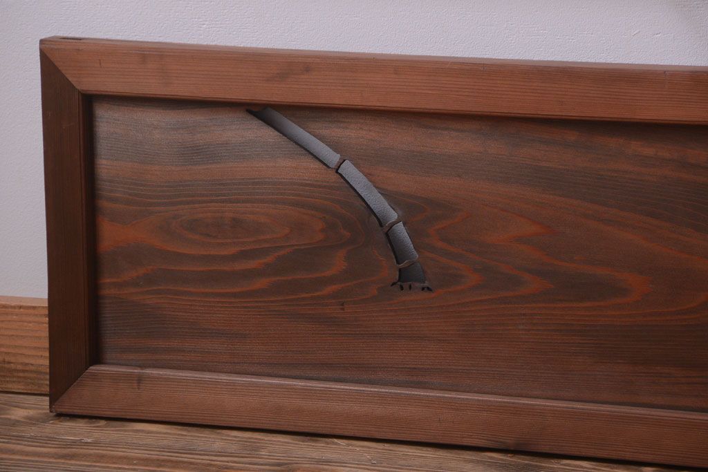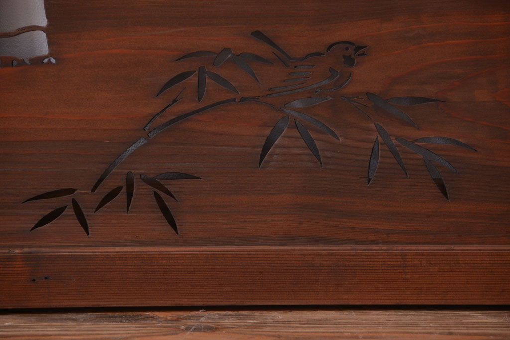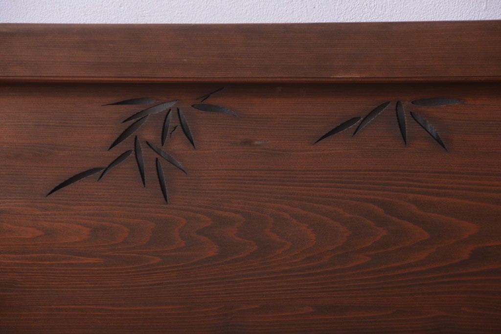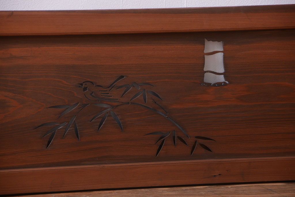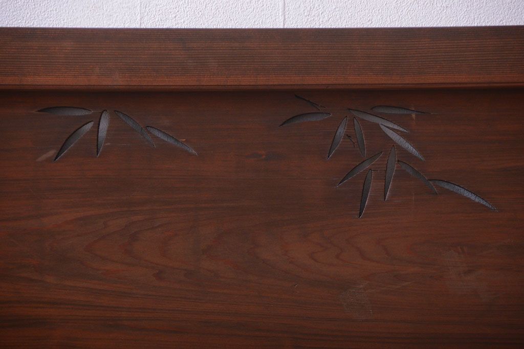 ----※ご注意ください※-------------------------------------- こちらの商品は、玄関先でのお渡しとなります。 また、お届けの際のお日にち指定・お時間指定・代金引換(コレクト)にも対応しておりません。 予めご了承ください。 ----------------------------------------------------------- 古民具・骨董 趣溢れる透かし彫りのアンティーク欄間2枚セットです。 竹と雀の透かし彫りが風情を感じさせる、 和製アンティークの欄間です。 古い木の質感が味わい深い、 和風インテリアにぴったりのお品です。 壁掛けのディスプレイとしてもおすすめです。 画像にありますように透かしの一部に欠けがありますが、使用上、強度上に問題はありません。 使用上問題のあるダメージはありません。 ■重量 約2kg ■框サイズ 上45mm/下45mm/左40mm/右40mm