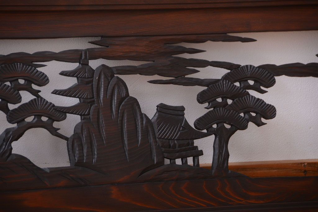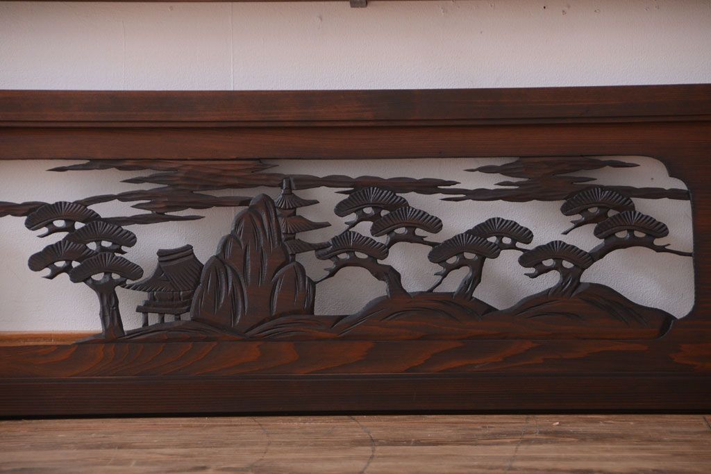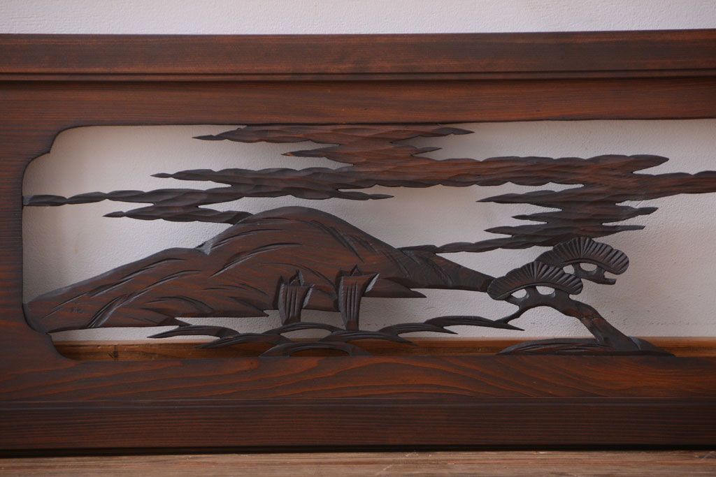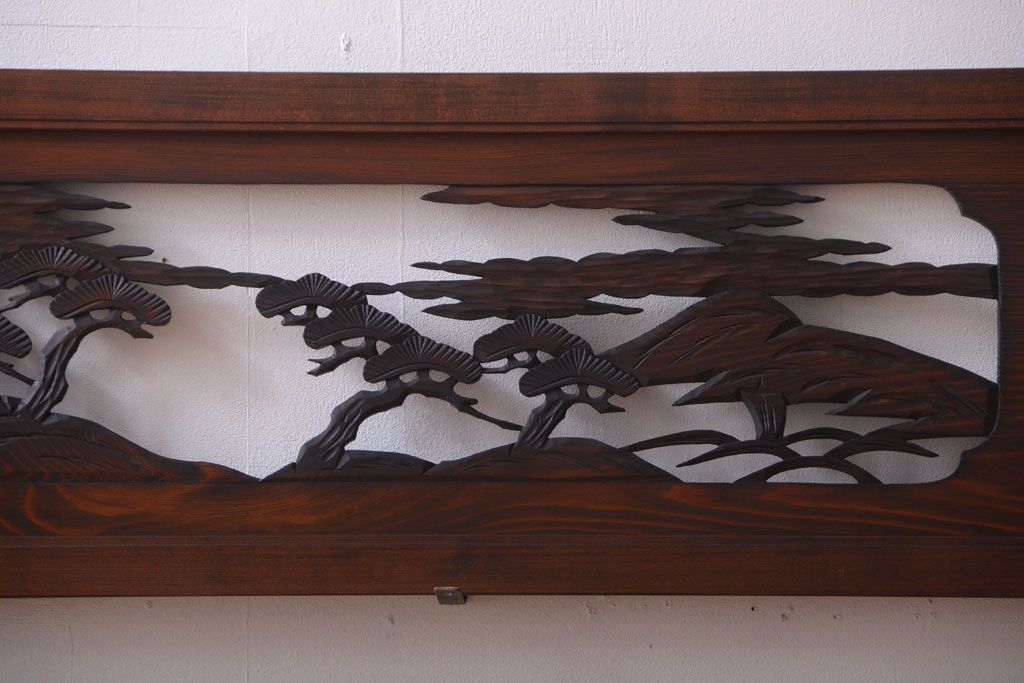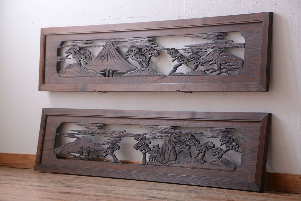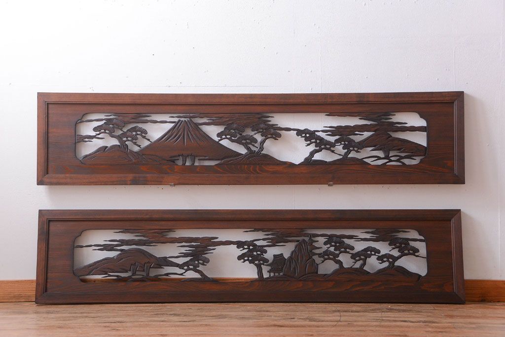 ----※ご注意ください※-------------------------------------- こちらの商品は、玄関先でのお渡しとなります。 また、お届けの際のお日にち指定・お時間指定・代金引換(コレクト)にも対応しておりません。 予めご了承ください。 ----------------------------------------------------------- 和製アンティーク 透かし彫りの欄間2枚セット(2)です。 和風なモチーフがふんだんに盛り込まれた、 透かし彫りが美しい、欄間2枚セットです。 和モダンスタイルのインテリアの、 壁掛けディスプレイとしてもおすすめの一品です。 本体の幅がわずかに違います。 使用上問題のあるダメージはありません。 ■本体の幅 1705〜1715mm ■重量 約3kg ■框サイズ 上40mm/下40mm/左40mm/右40mm