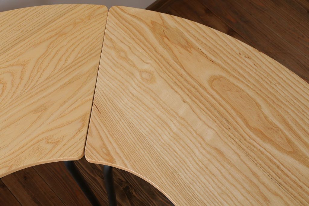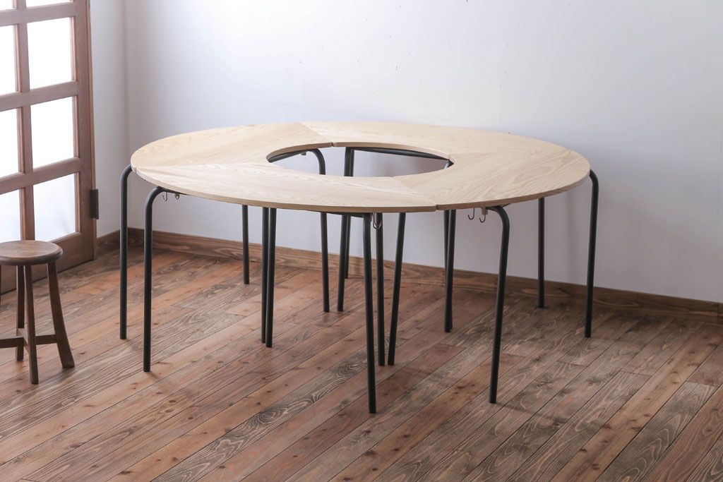 ラフジュ工房> テーブル> 丸テーブル > アンティーク家具 天板無垢材のバッグホルダー付きドーナツ型テーブル(4台セット、丸テーブル、円テーブル、鉄脚テーブル)