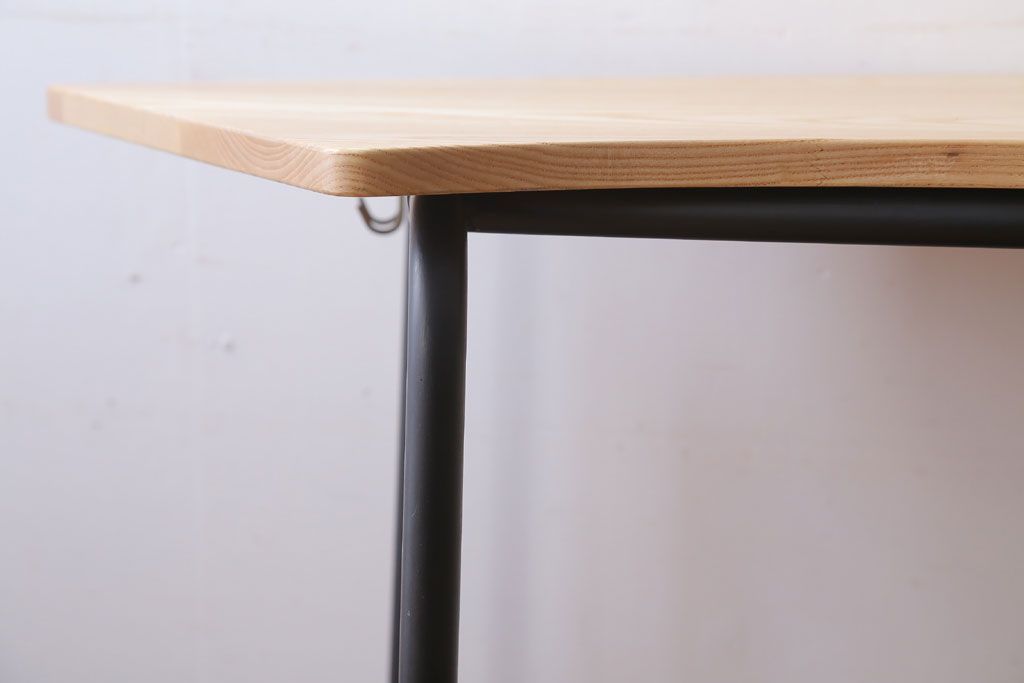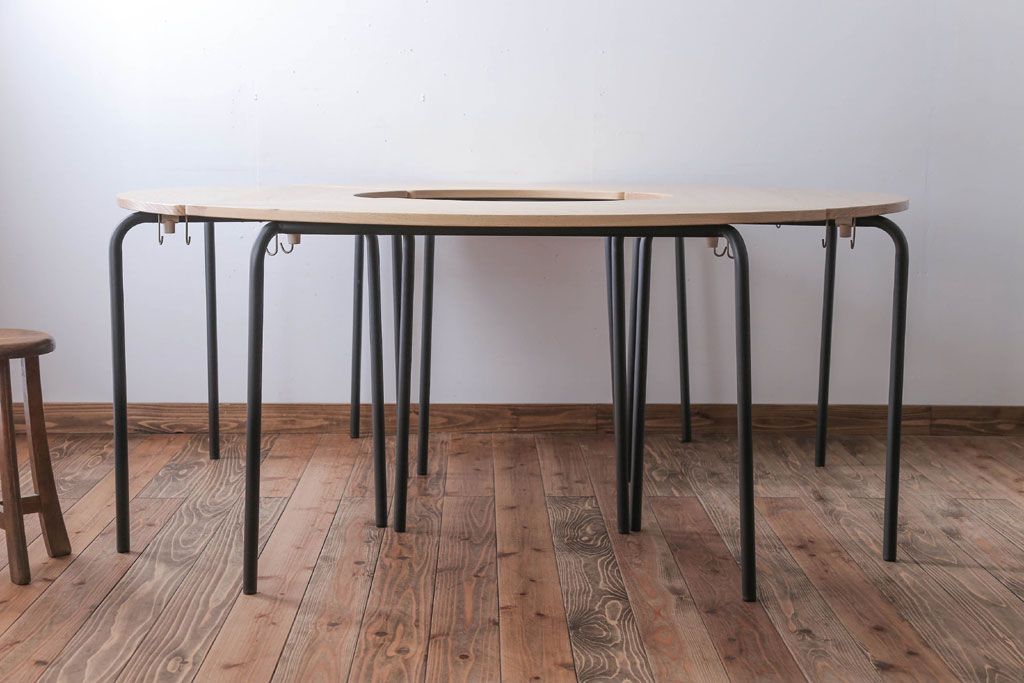 ラフジュ工房> テーブル> 作業台 > アンティーク家具 天板無垢材のバッグホルダー付きドーナツ型テーブル(4台セット、丸テーブル、円テーブル、鉄脚テーブル)