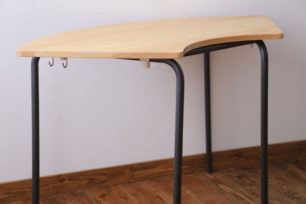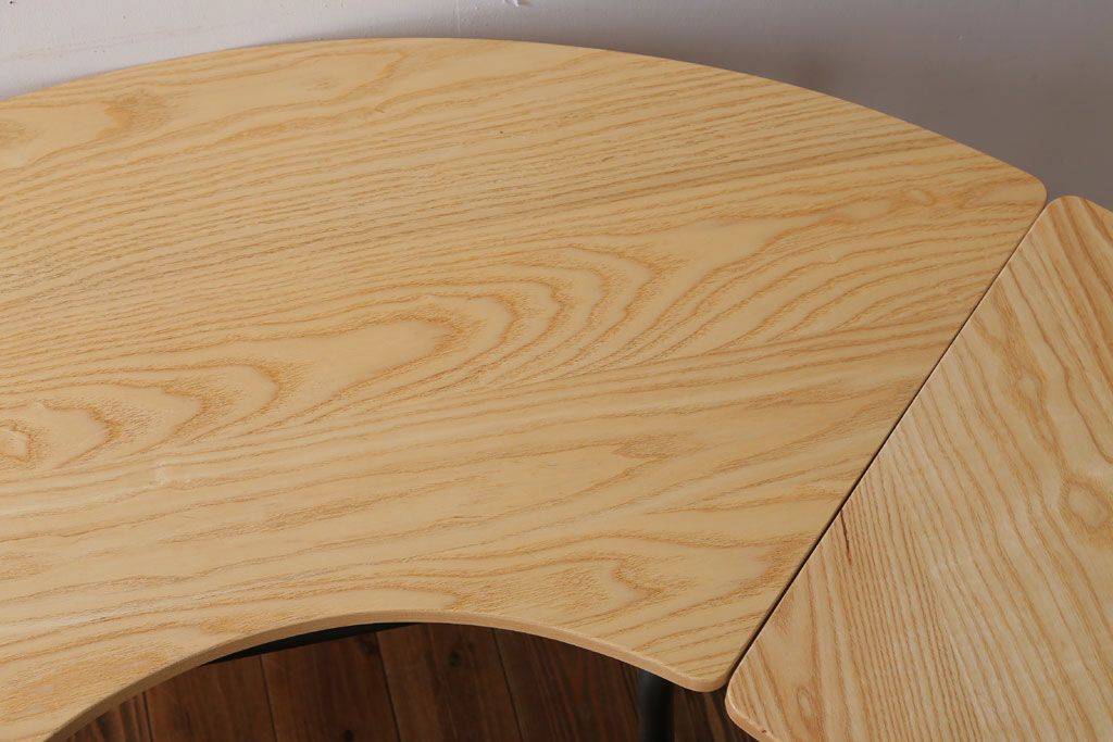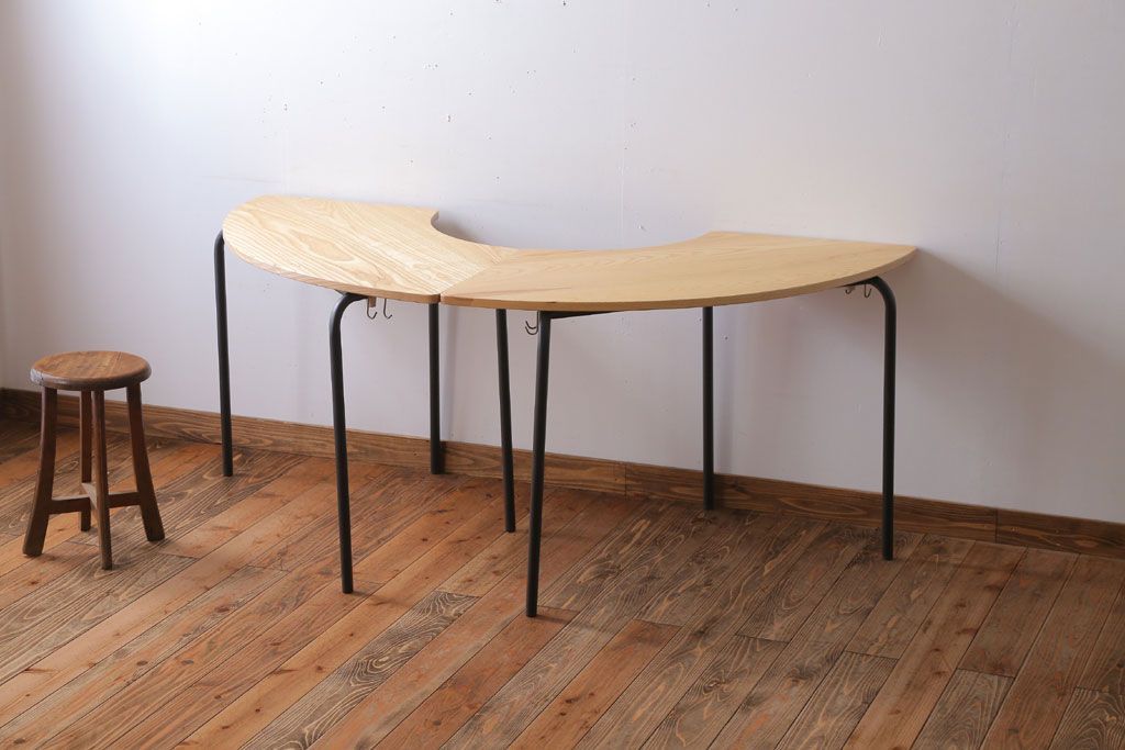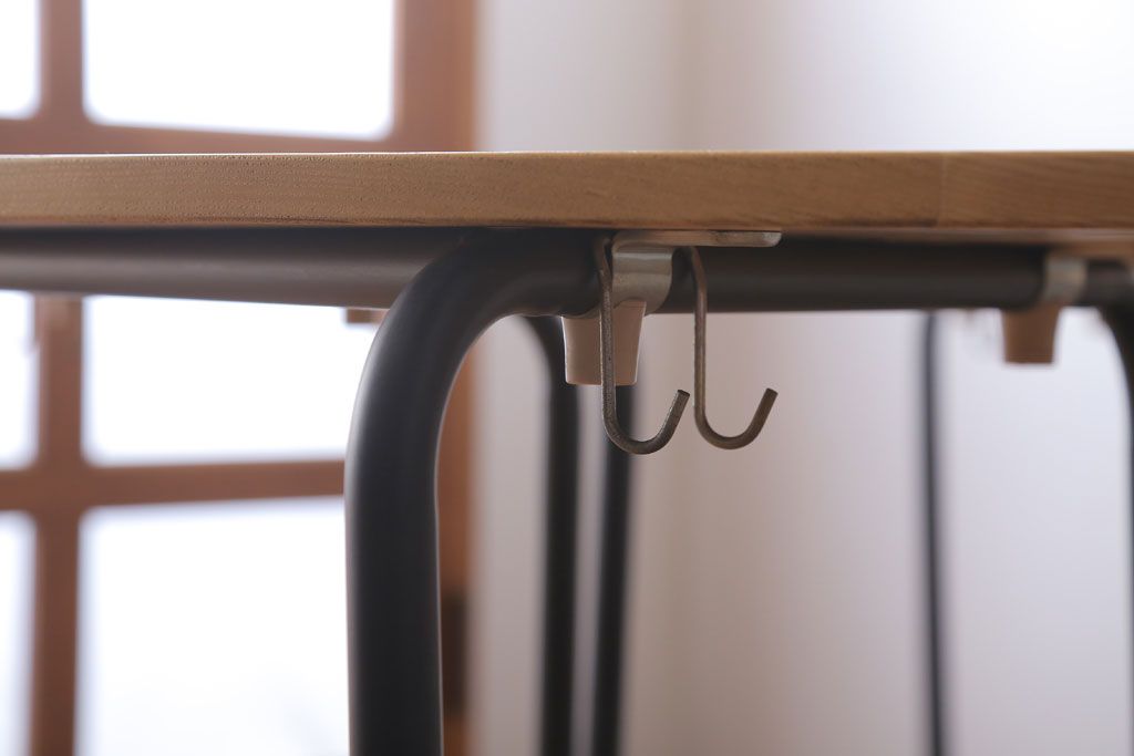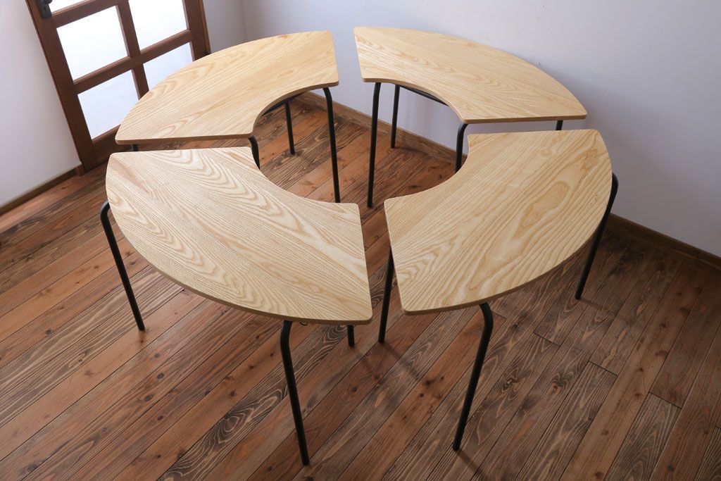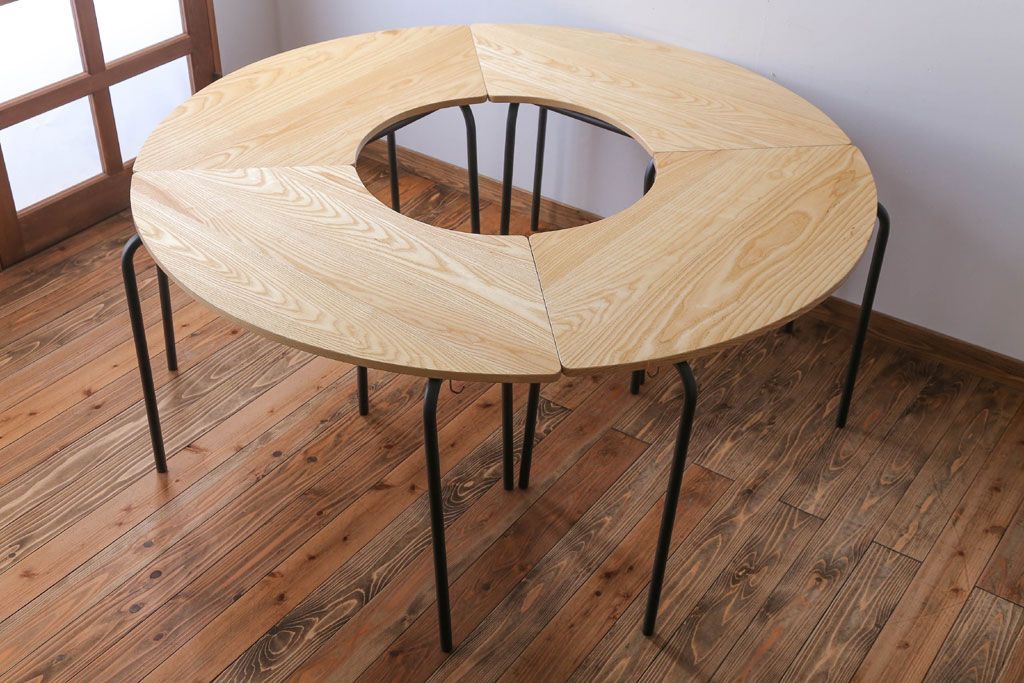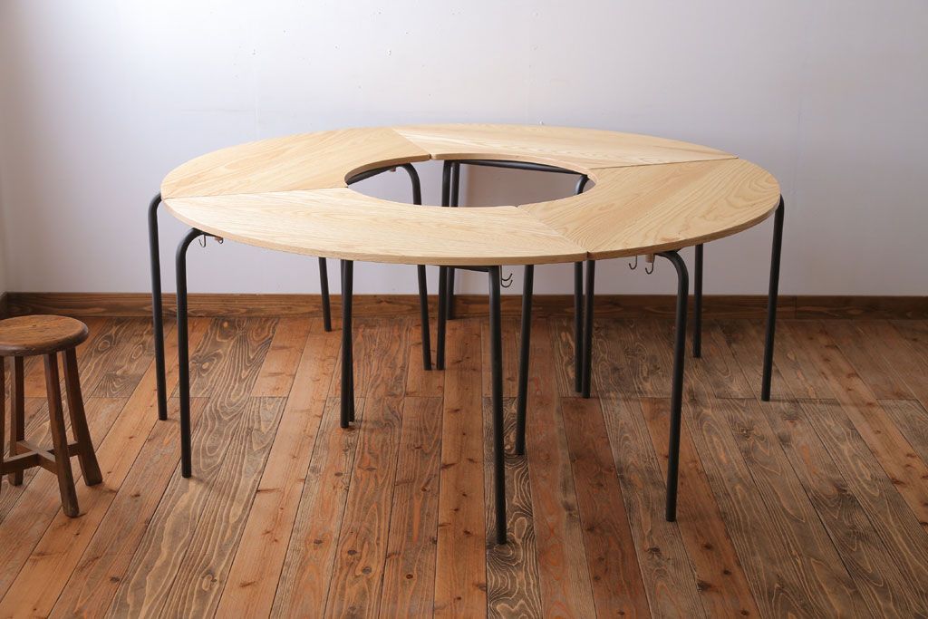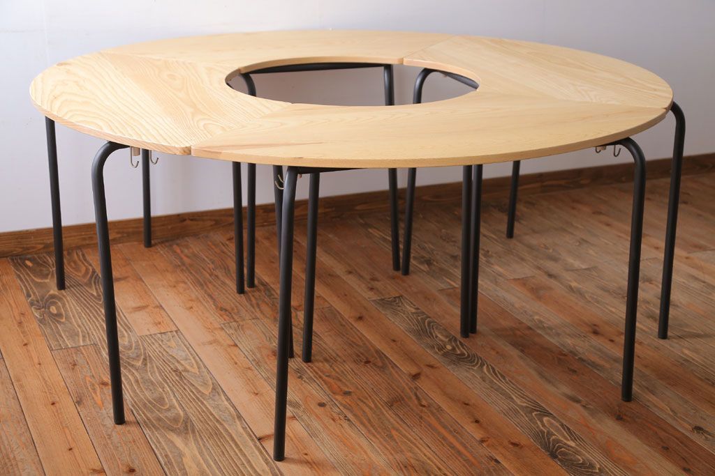ラフジュ工房> デスク> ワークデスク > アンティーク家具 天板無垢材のバッグホルダー付きドーナツ型テーブル(4台セット、丸テーブル、円テーブル、鉄脚テーブル)