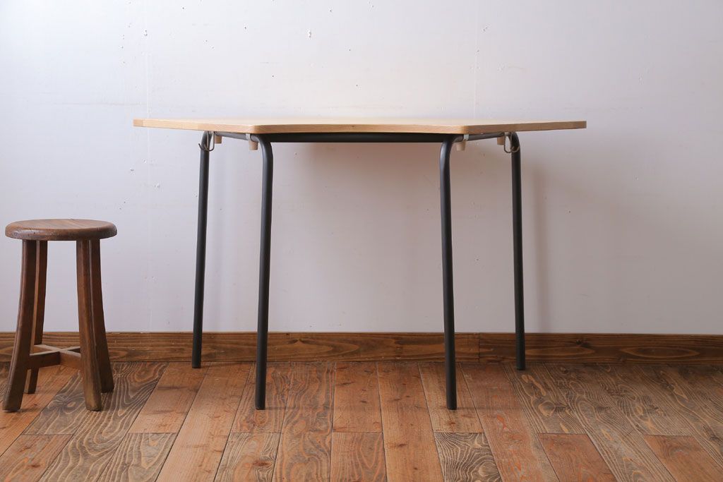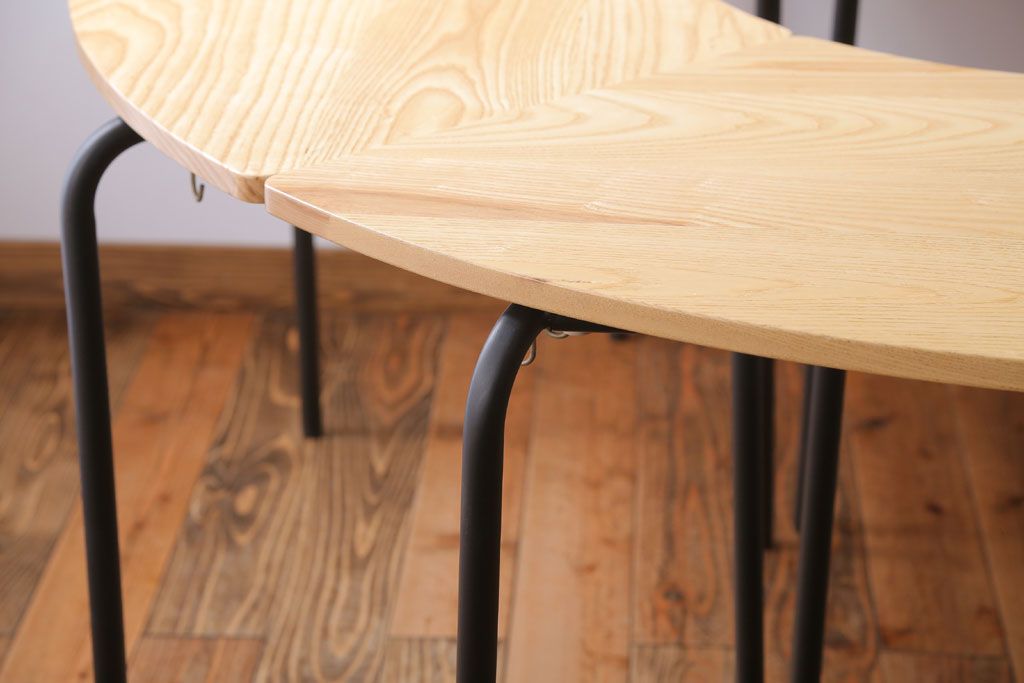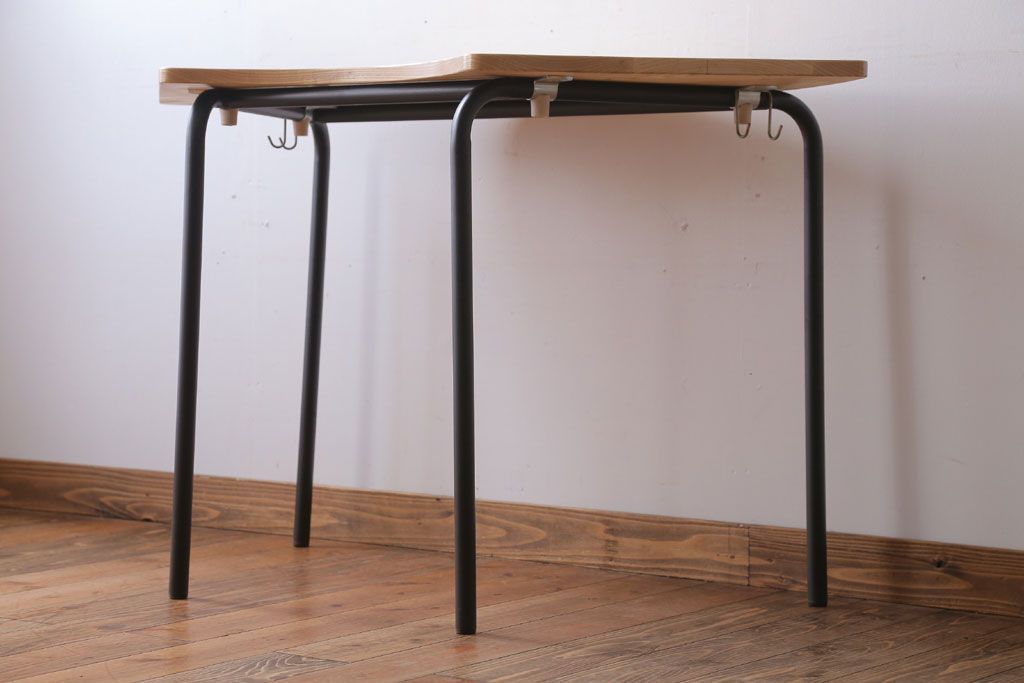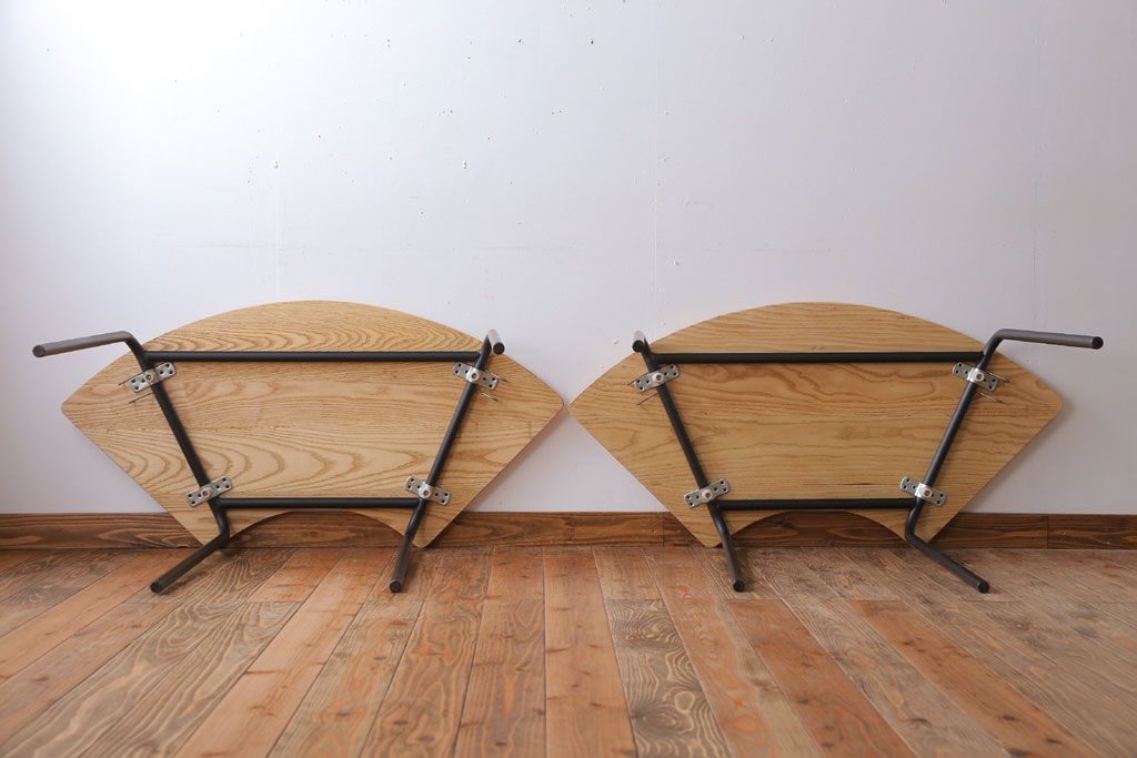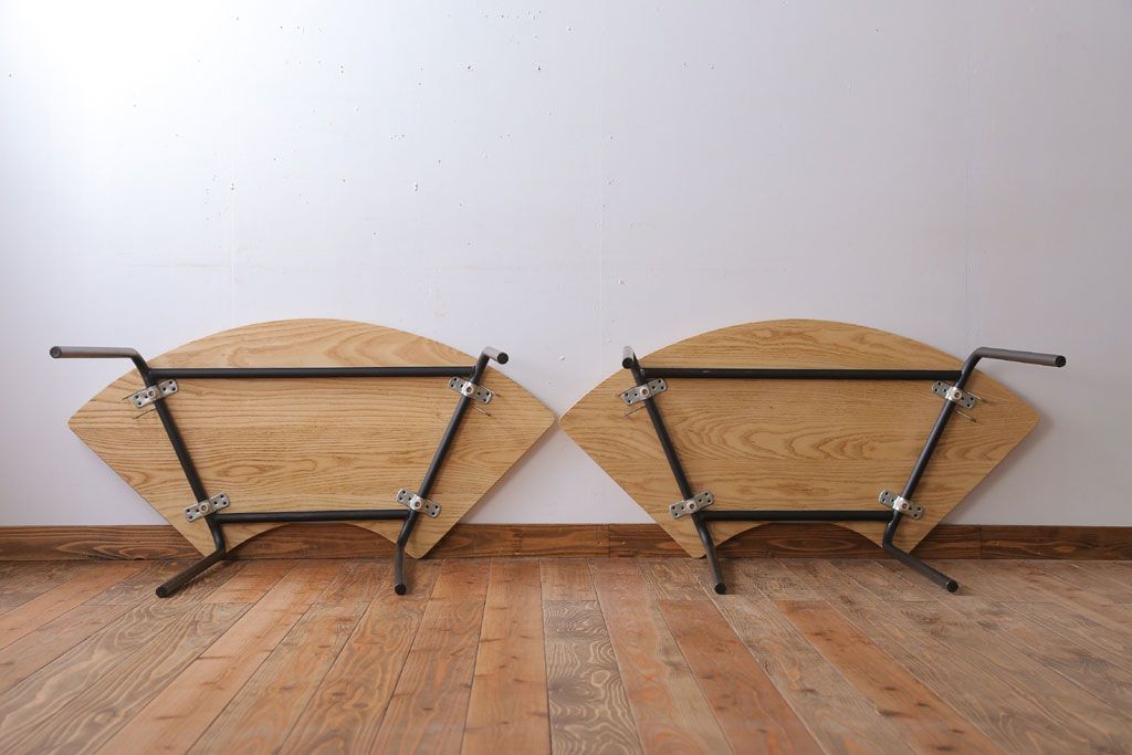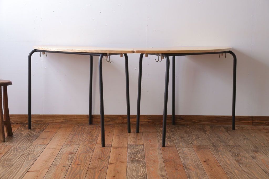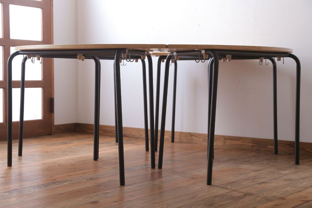 アンティーク家具 天板無垢材のバッグホルダー付きドーナツ型テーブル(4台セット、丸テーブル、円テーブル、鉄脚テーブル)