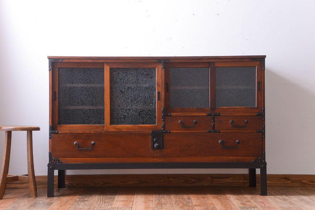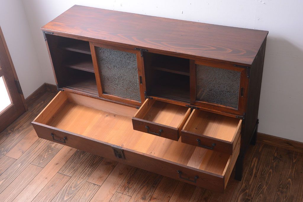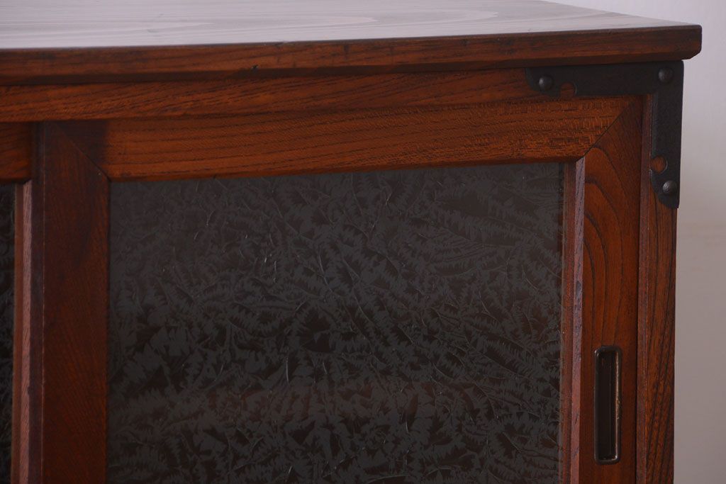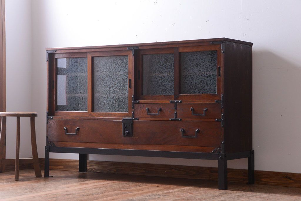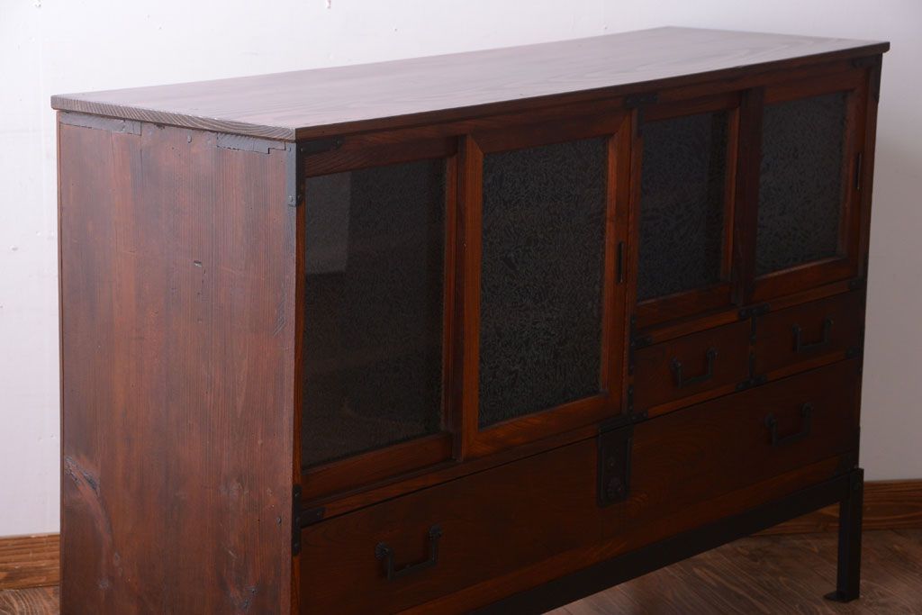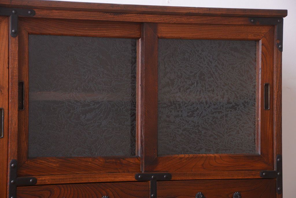 アンティーク家具 古民具・骨董 結霜ガラス入り!前面欅材の時代箪笥ローボード