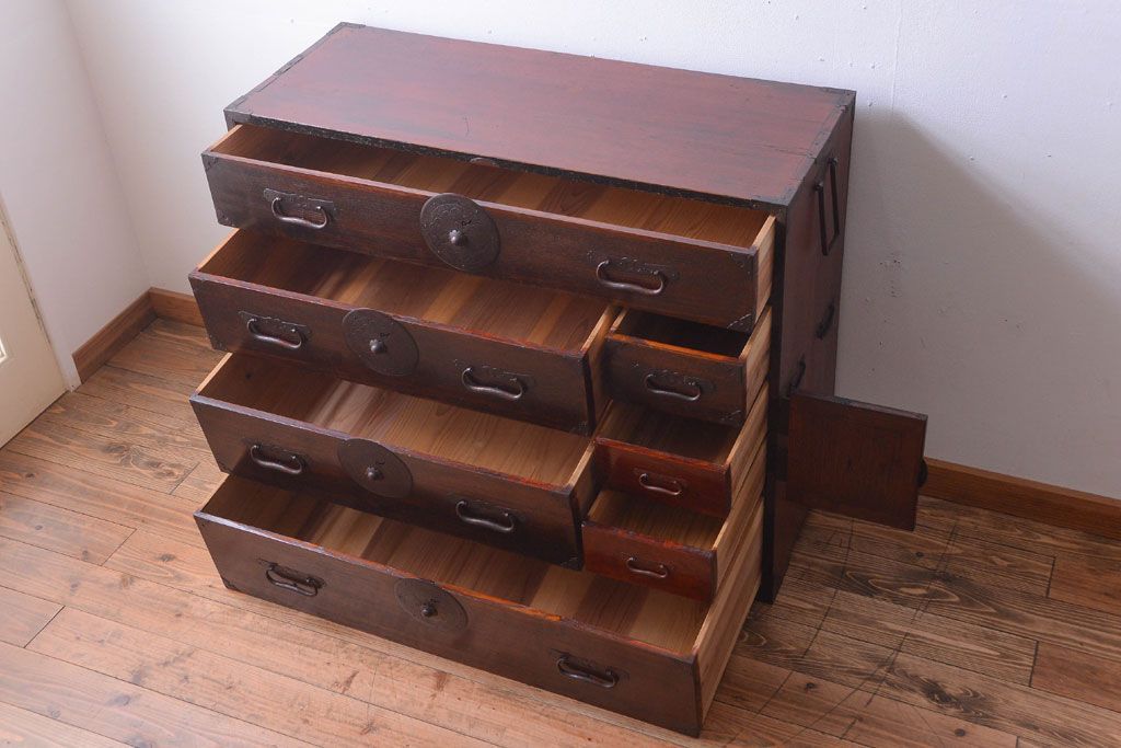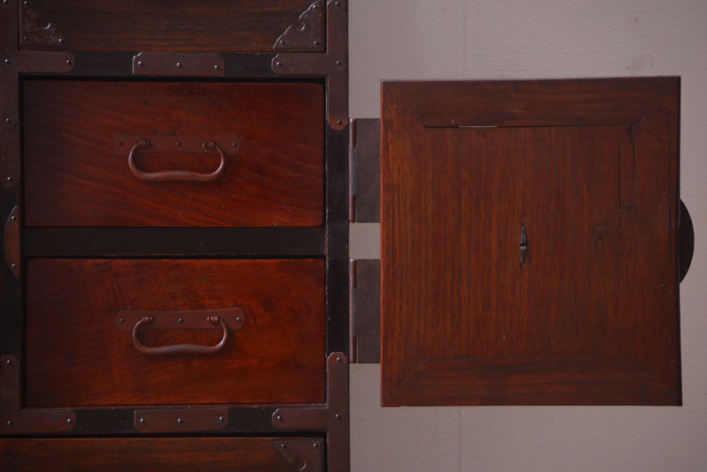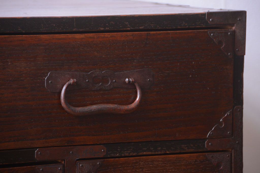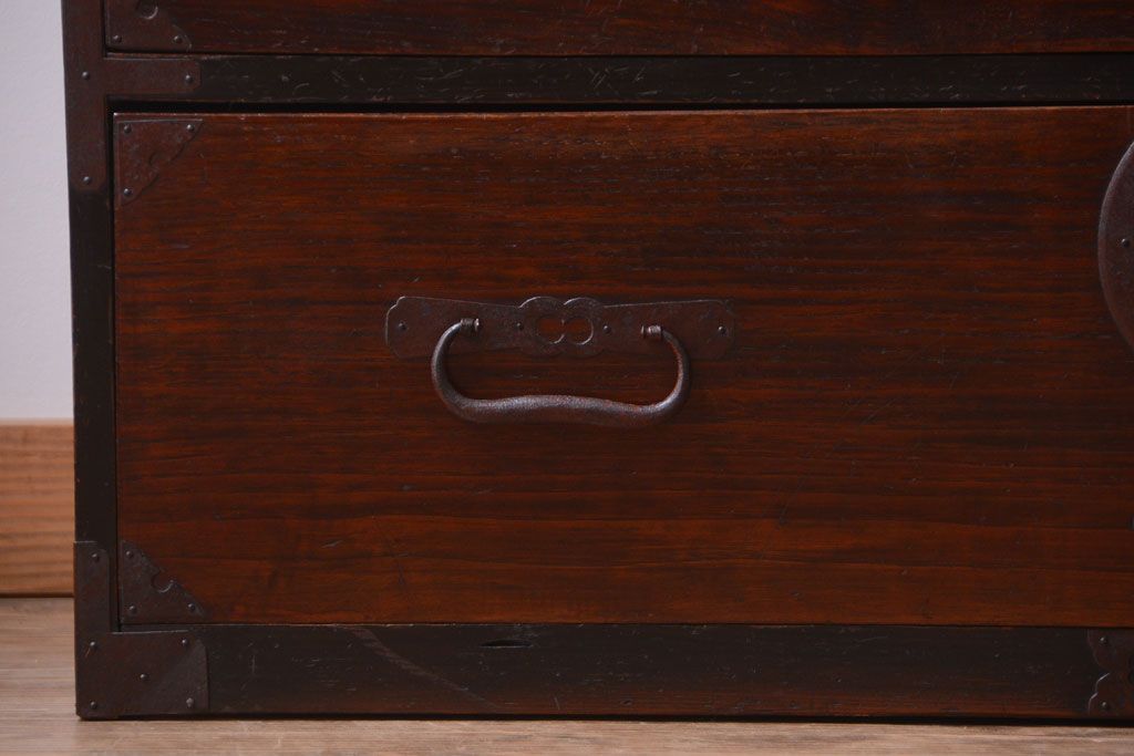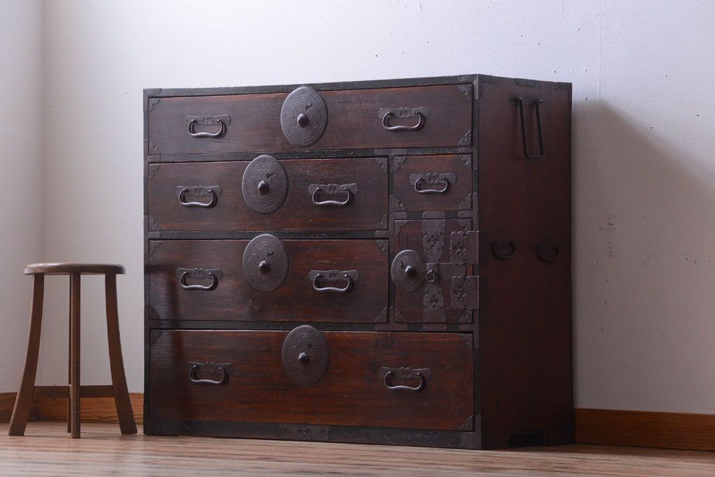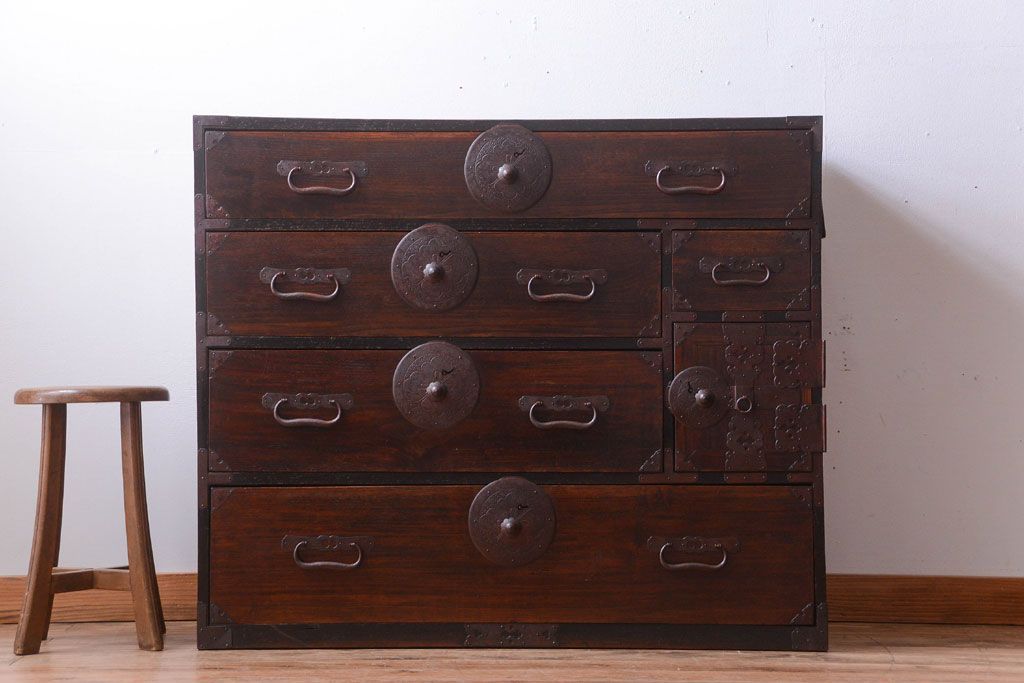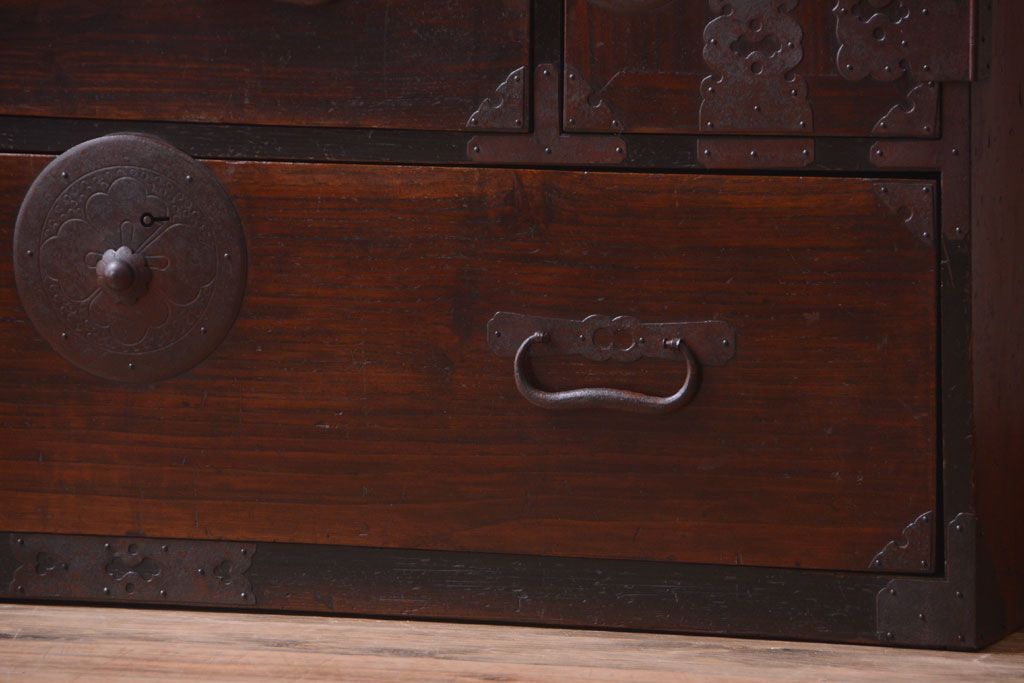 アンティーク家具 古民具・骨董 前面栗材!花菱紋金具の一本物アンティーク最上箪笥(衣装箪笥)