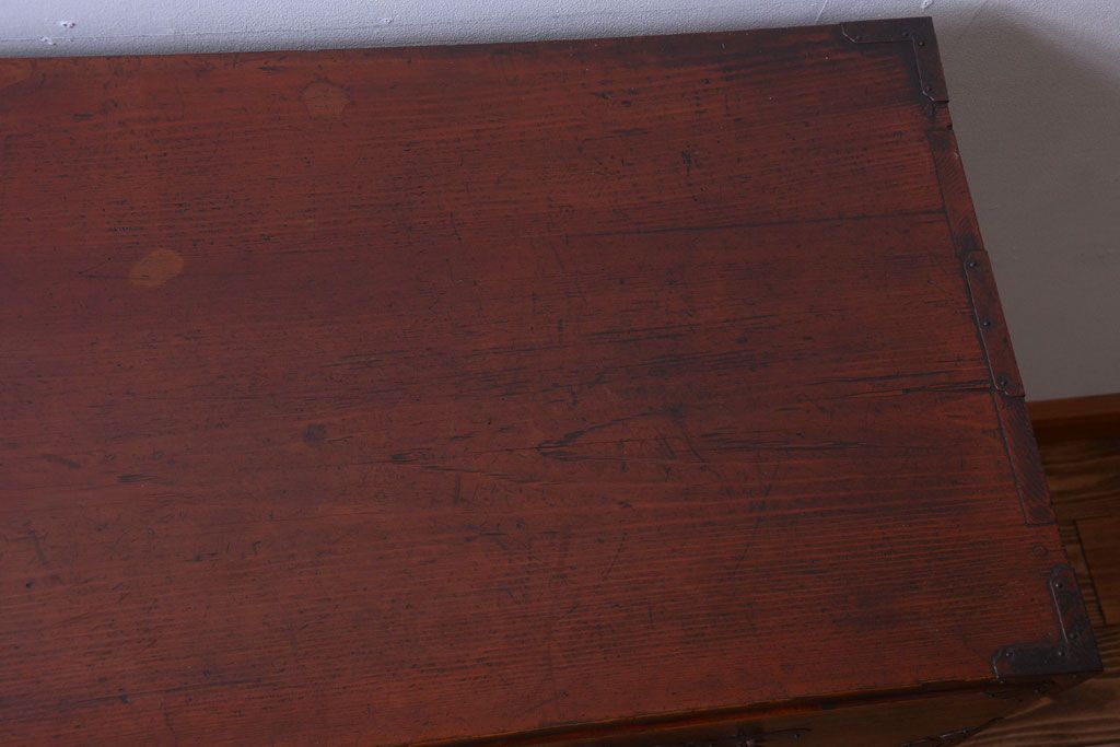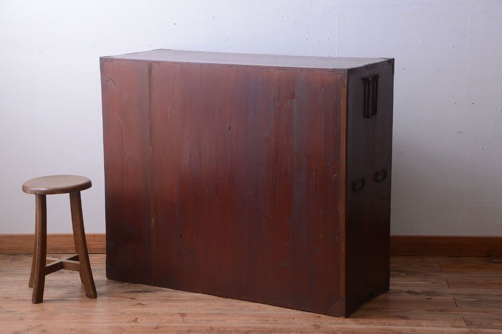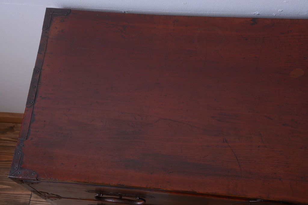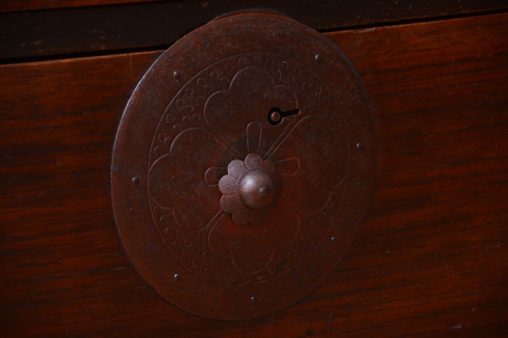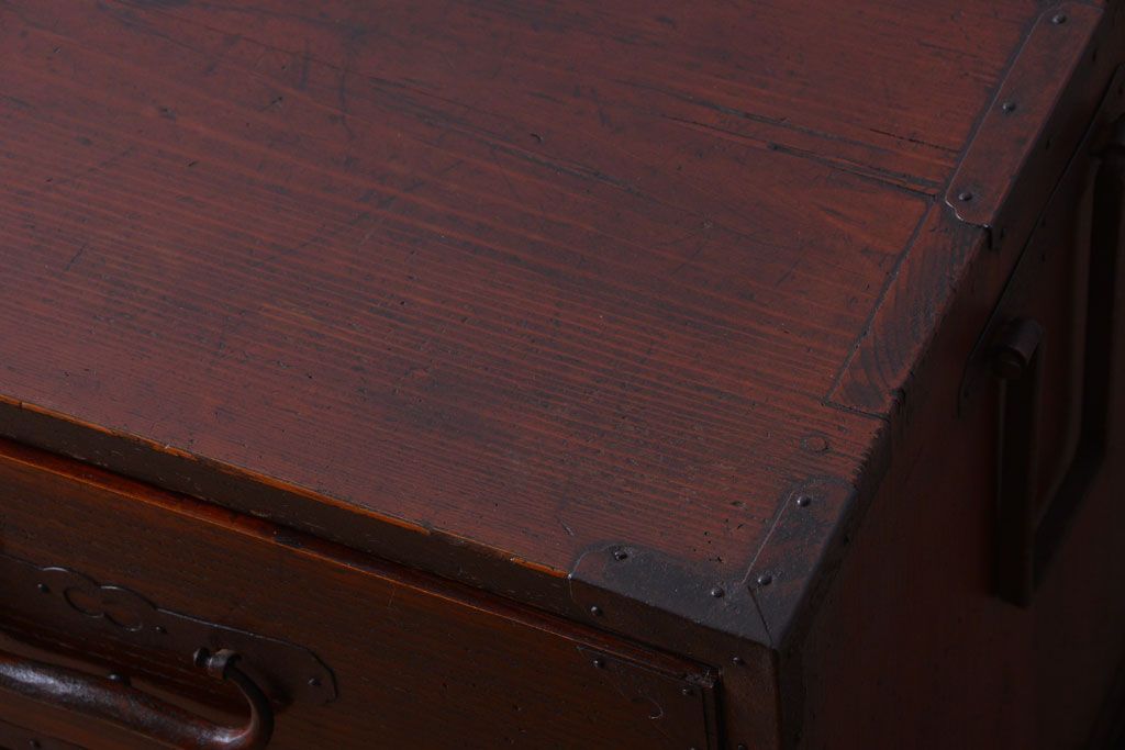 骨董・美術品 > アンティーク家具 古民具・骨董 前面栗材!花菱紋金具の一本物アンティーク最上箪笥(衣装箪笥)