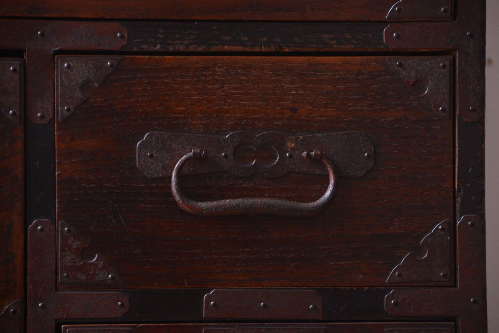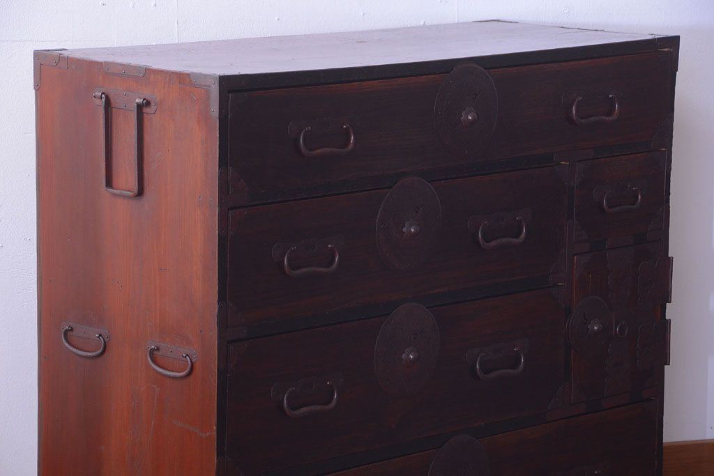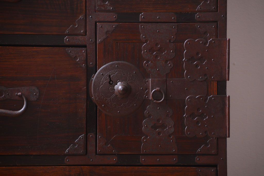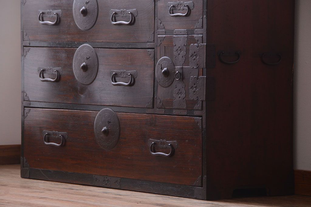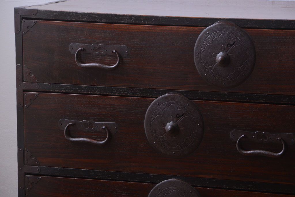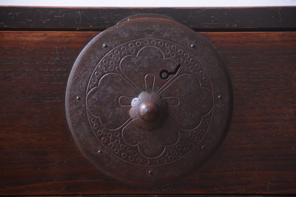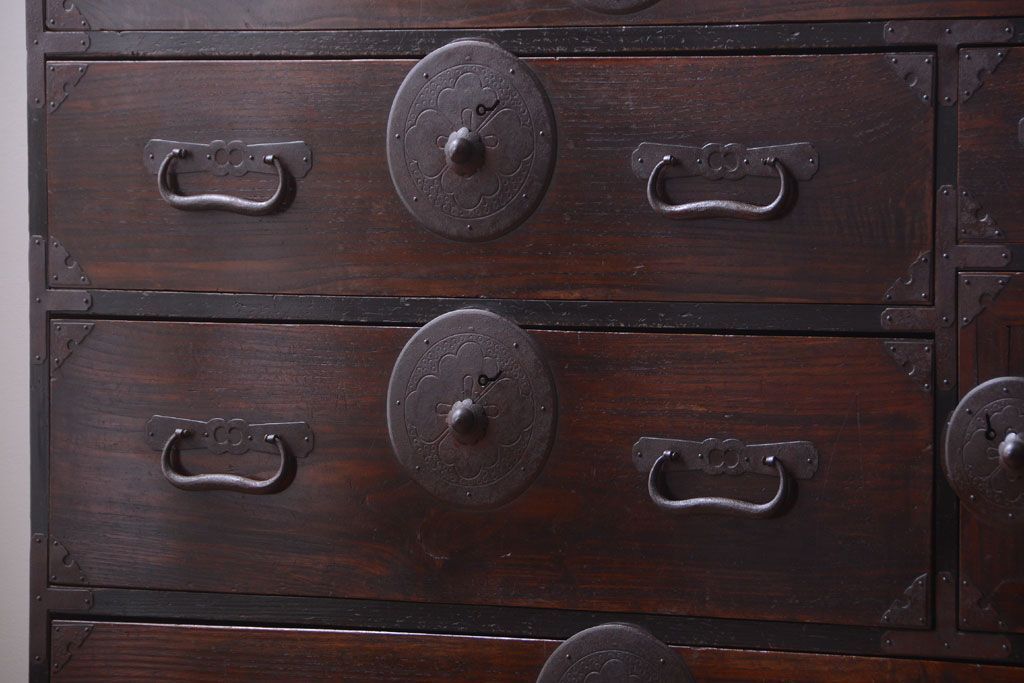 和箪笥> 衣装箪笥 > アンティーク家具 古民具・骨董 前面栗材!花菱紋金具の一本物アンティーク最上箪笥(衣装箪笥)