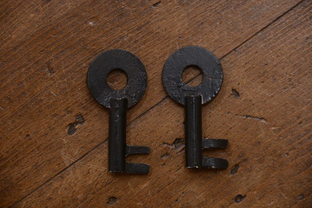 鍵は付属します。画像にありますように、袋に入れお付けします。スムーズに動くように調整していますが、あくまでも古いものや中古品ですので、長期の使用保証は出来かねます。ご購入後不具合が発生した場合は、当店でサポートさせていただきますので、お気軽にご相談くださいませ。