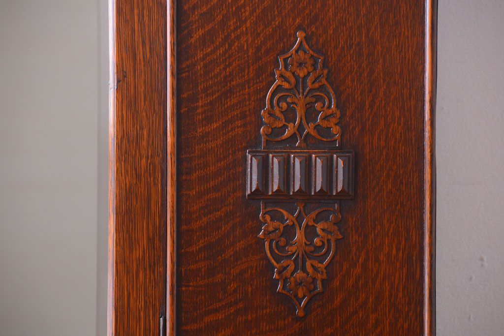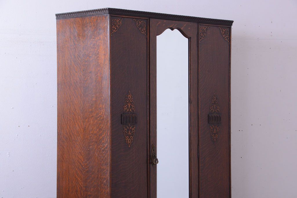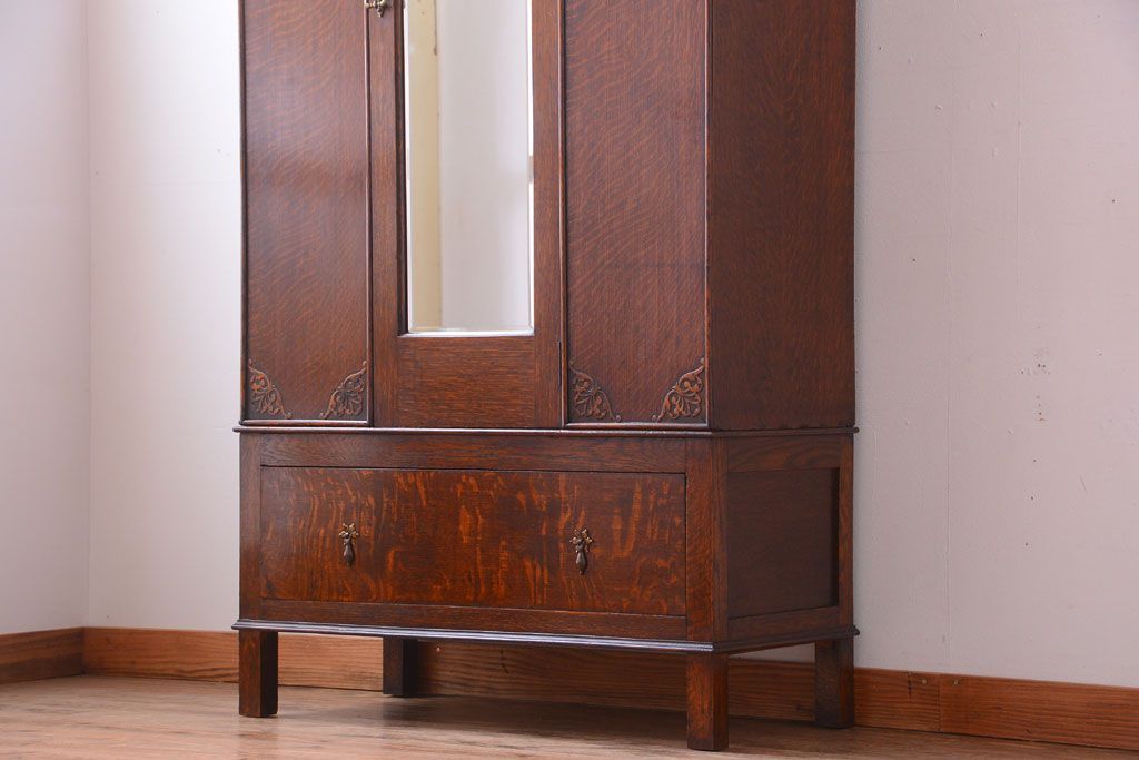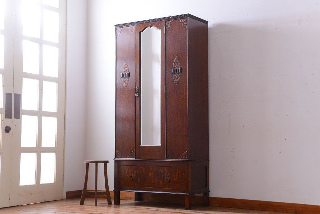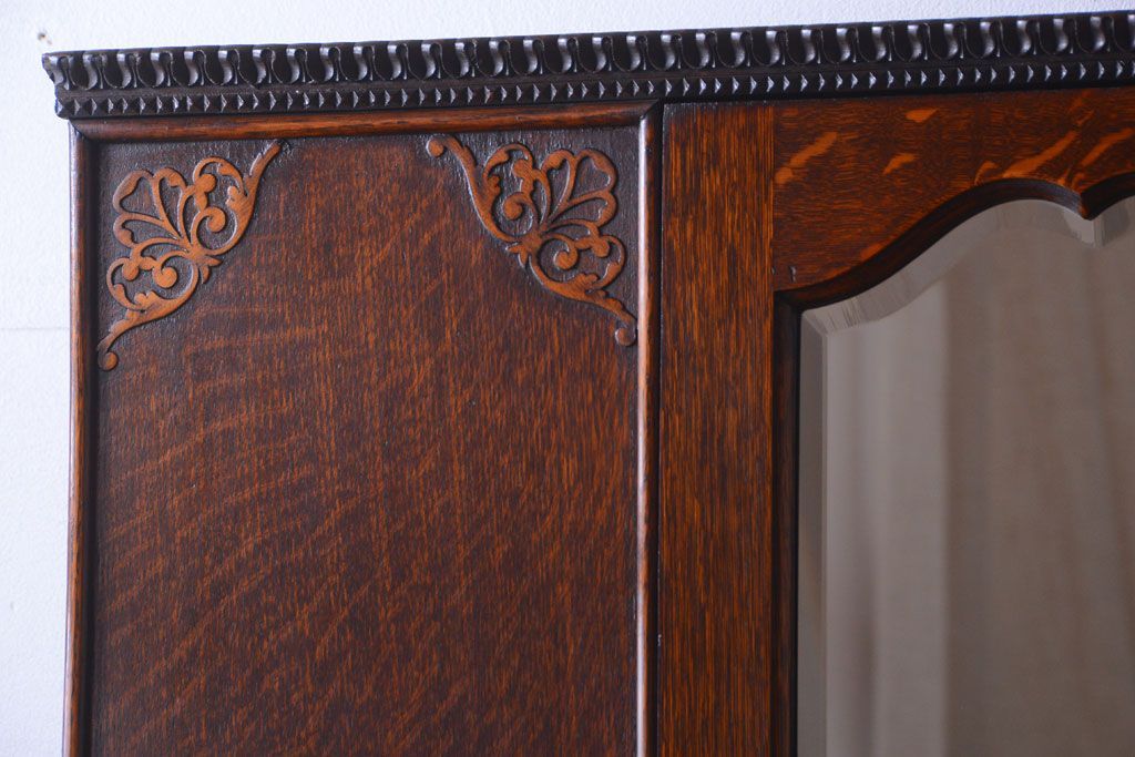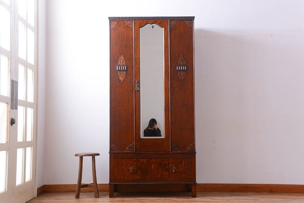 アンティーク家具 イギリスアンティーク 古いオーク製の彫刻が美しい鏡付きワードローブ