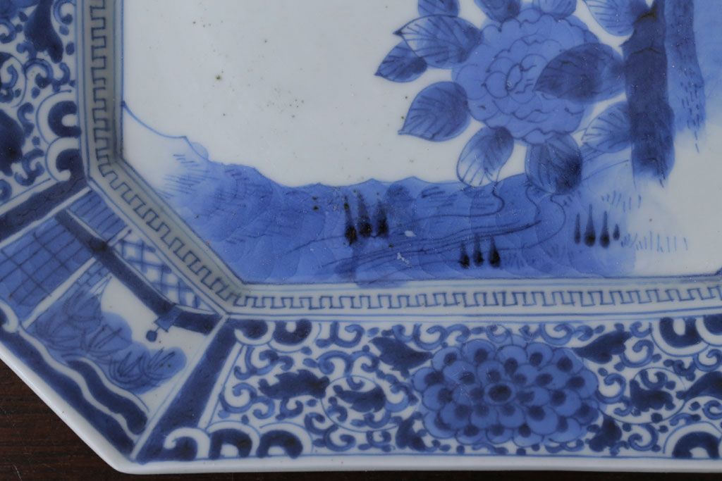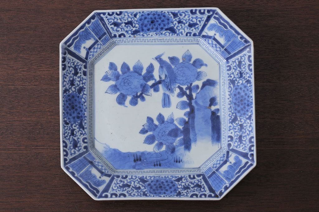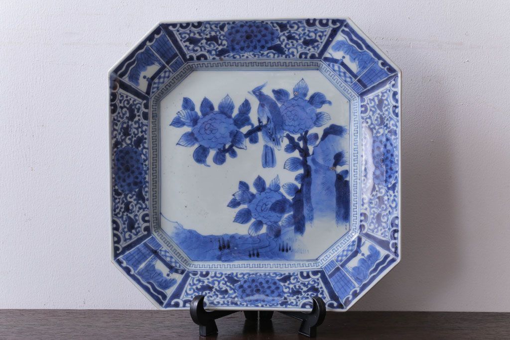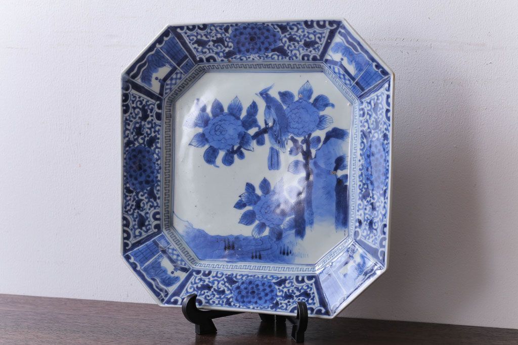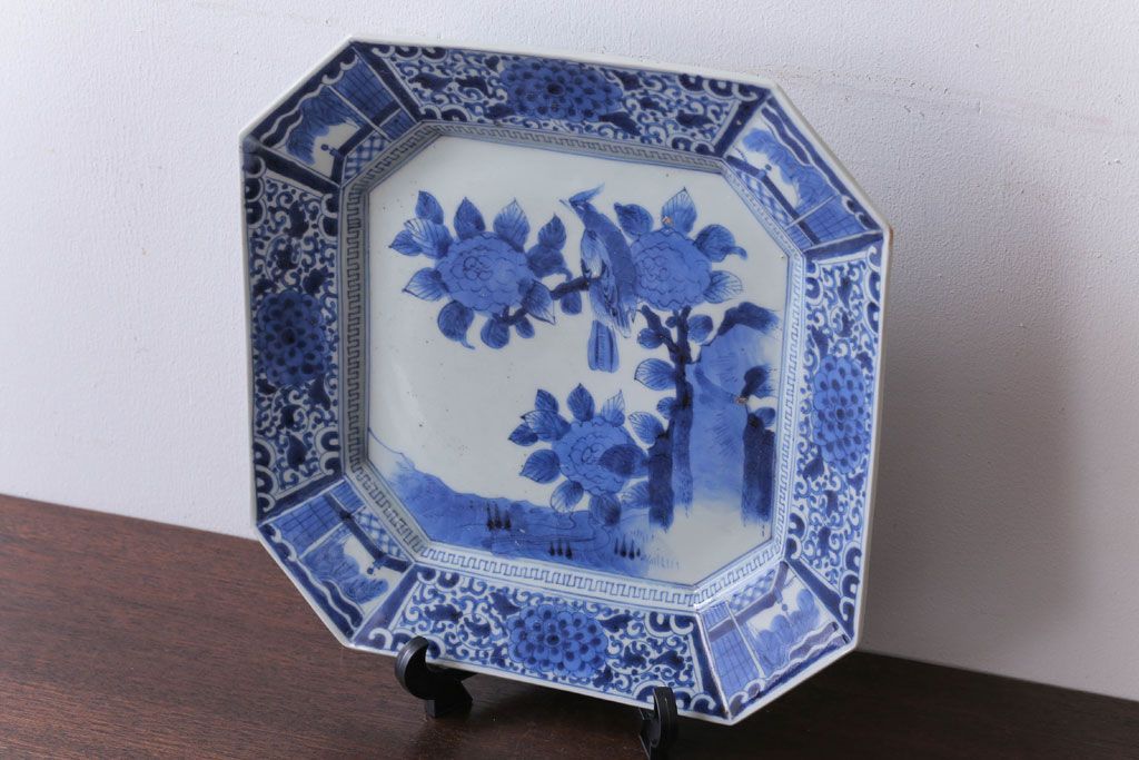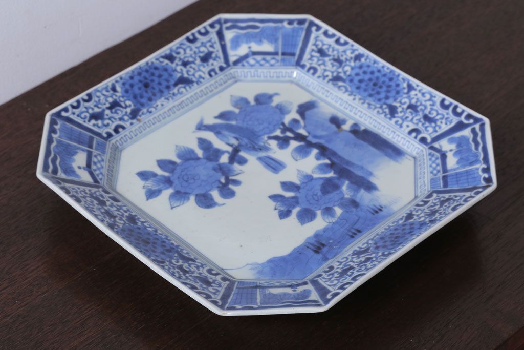 アンティーク雑貨 アンティーク 江戸〜明治 花鳥の図 染付八角皿(古伊万里)