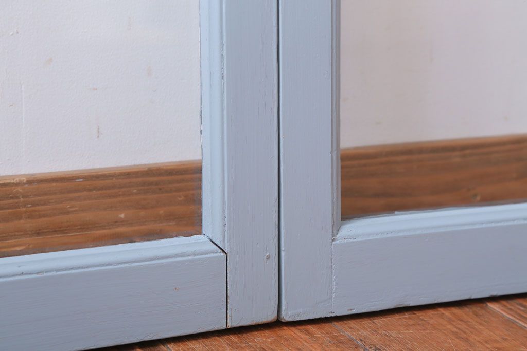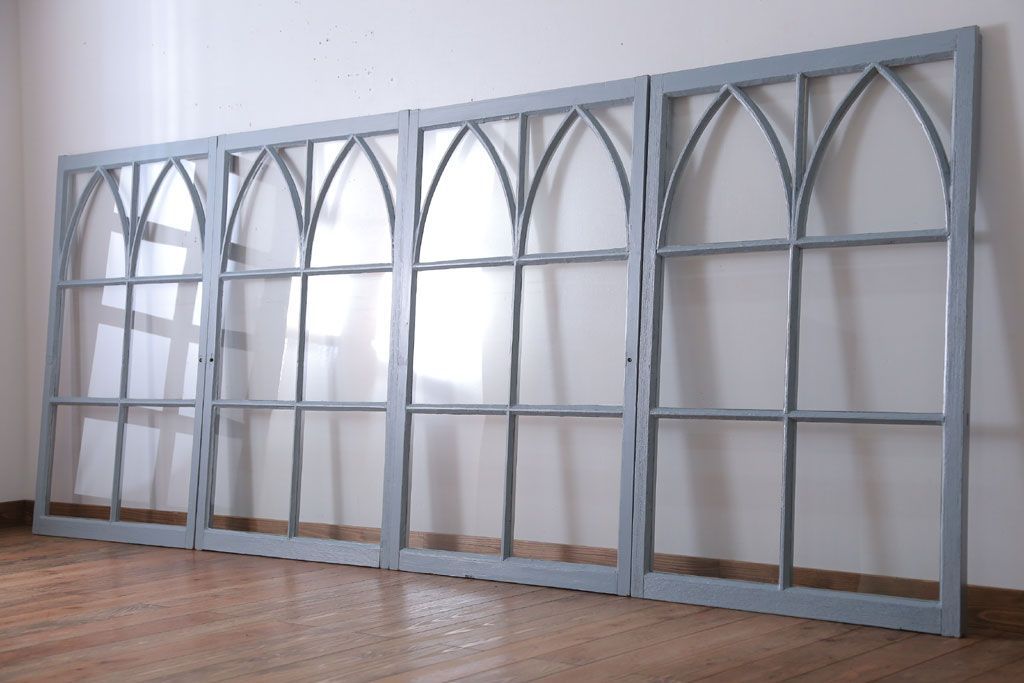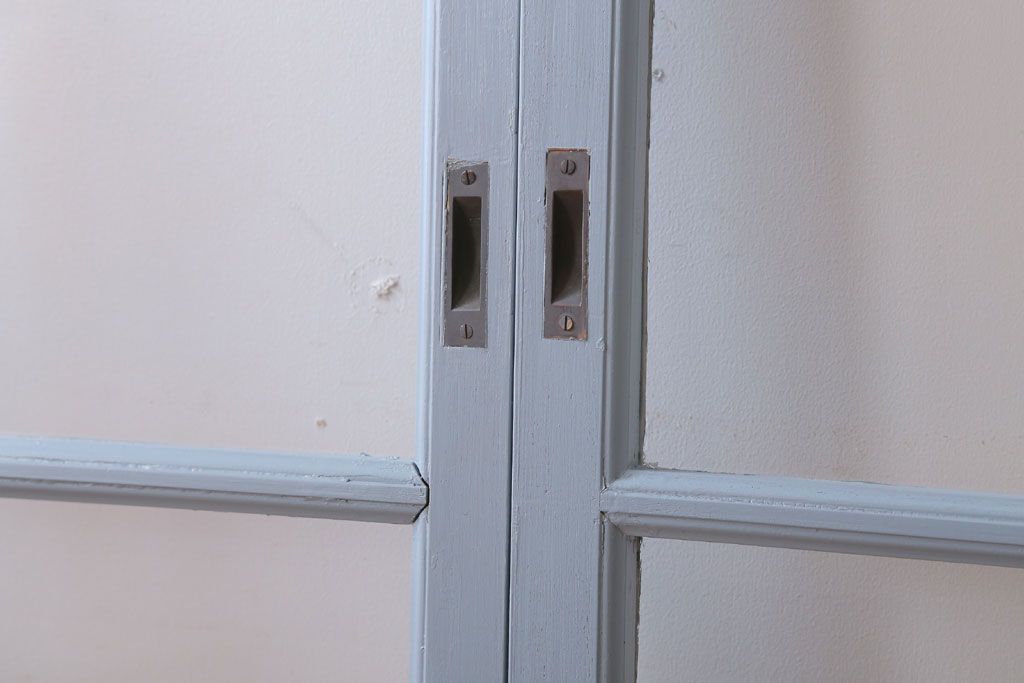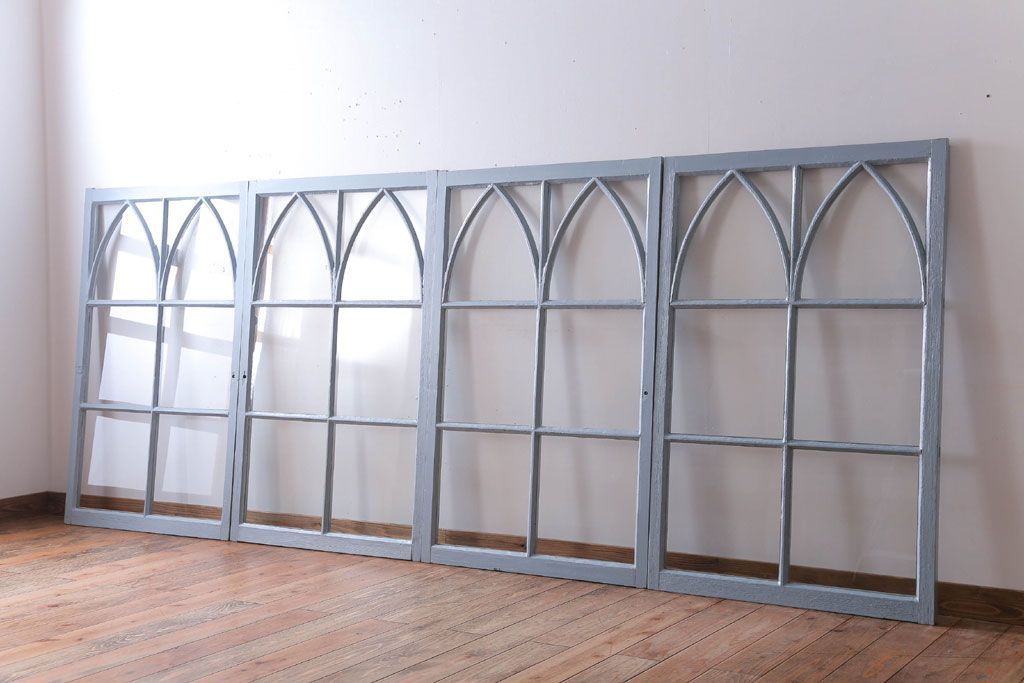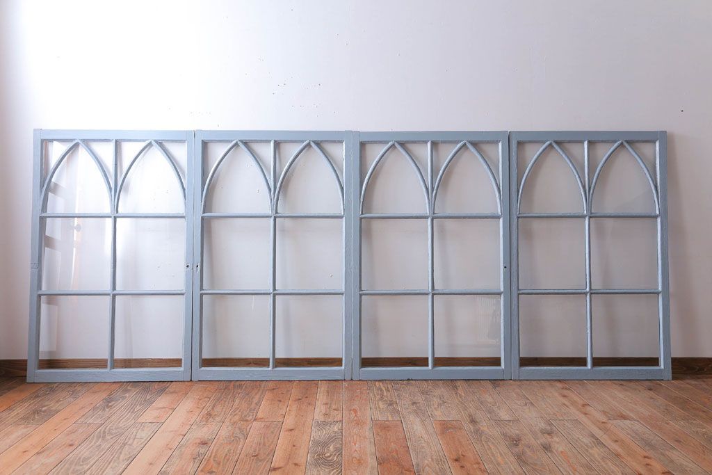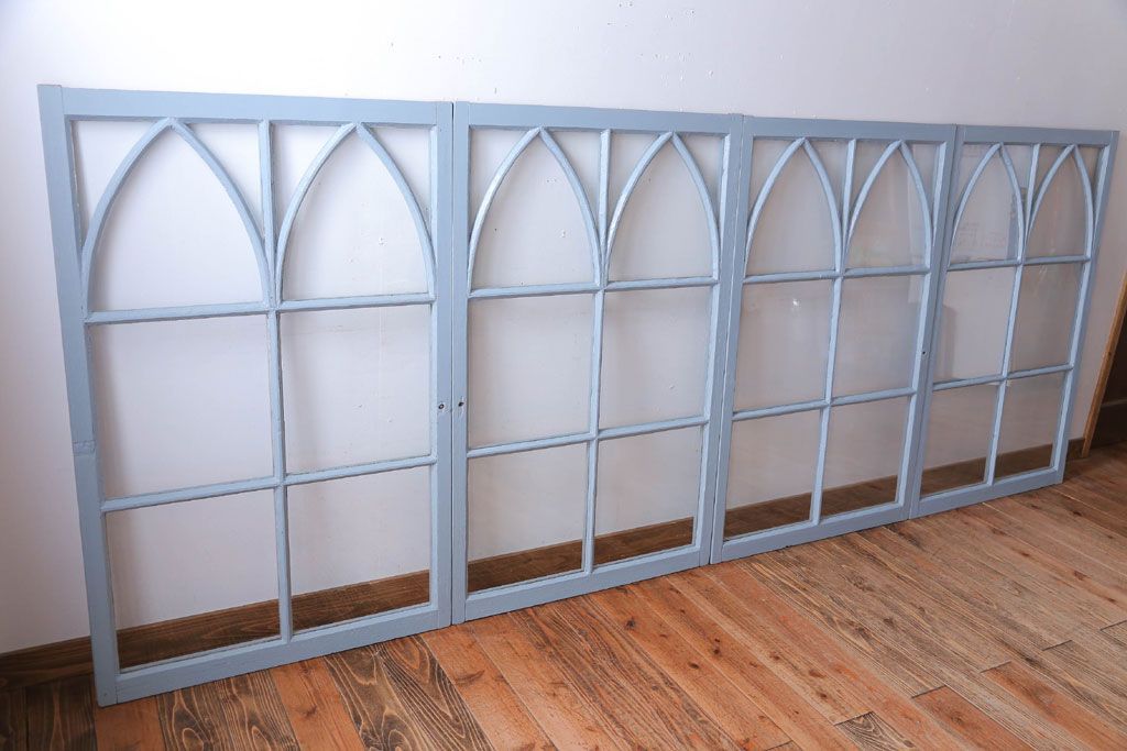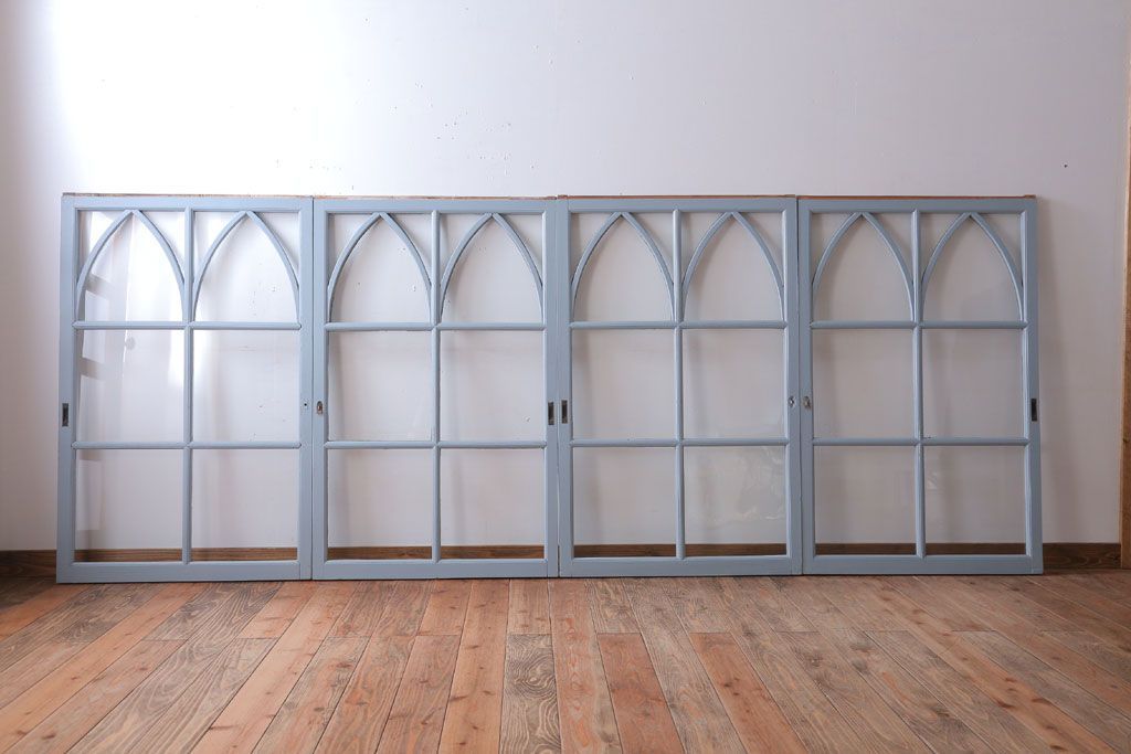 アンティーク ブルーグレーペイントのガラス戸4枚セット(窓)