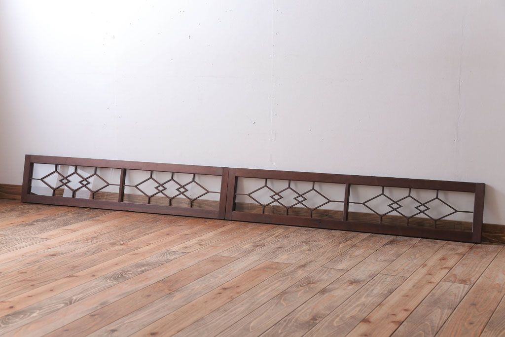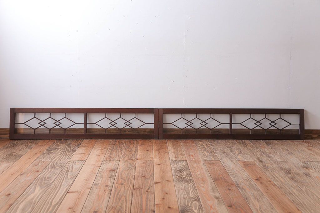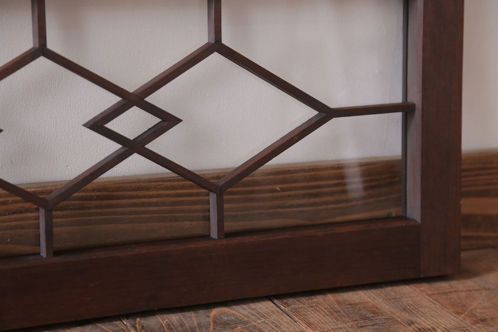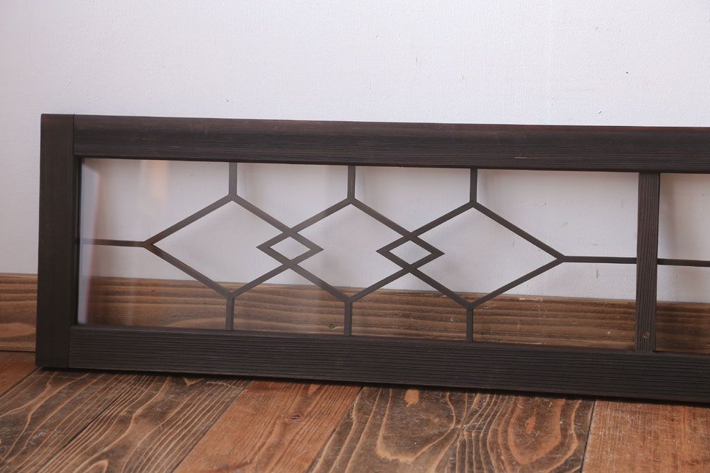 ----※ご注意ください※-------------------------------------- こちらの商品は、玄関先でのお渡しとなります。 また、お届けの際のお日にち指定・お時間指定・代金引換(コレクト)にも対応しておりません。 予めご了承ください。 ----------------------------------------------------------- アンティーク モダンな古い木製明り取り(欄間)です。 モダンなデザインがおしゃれな、 和製アンティークの明り取りです。 大正ロマンスタイルのインテリアにおすすめの、 雰囲気あふれる一品です。 背面にクリアガラスを使用したお品です。 左側のみ計測致しましたので、そちらをご参考ください。 使用上問題のあるダメージはありません。 ■重量 約3kg ■框サイズ 上40mm/左40mm/右40mm/下40mm