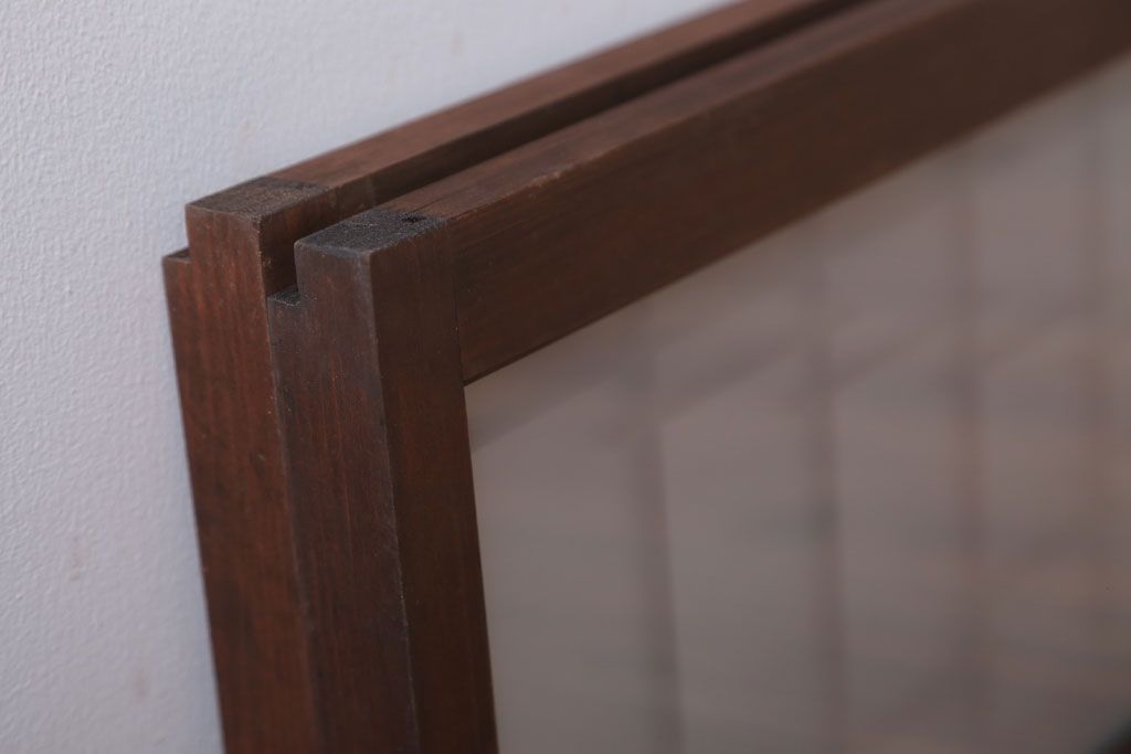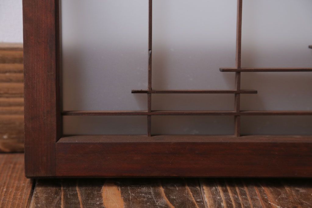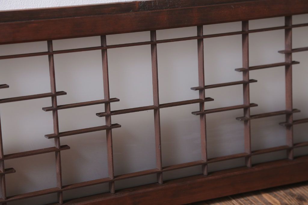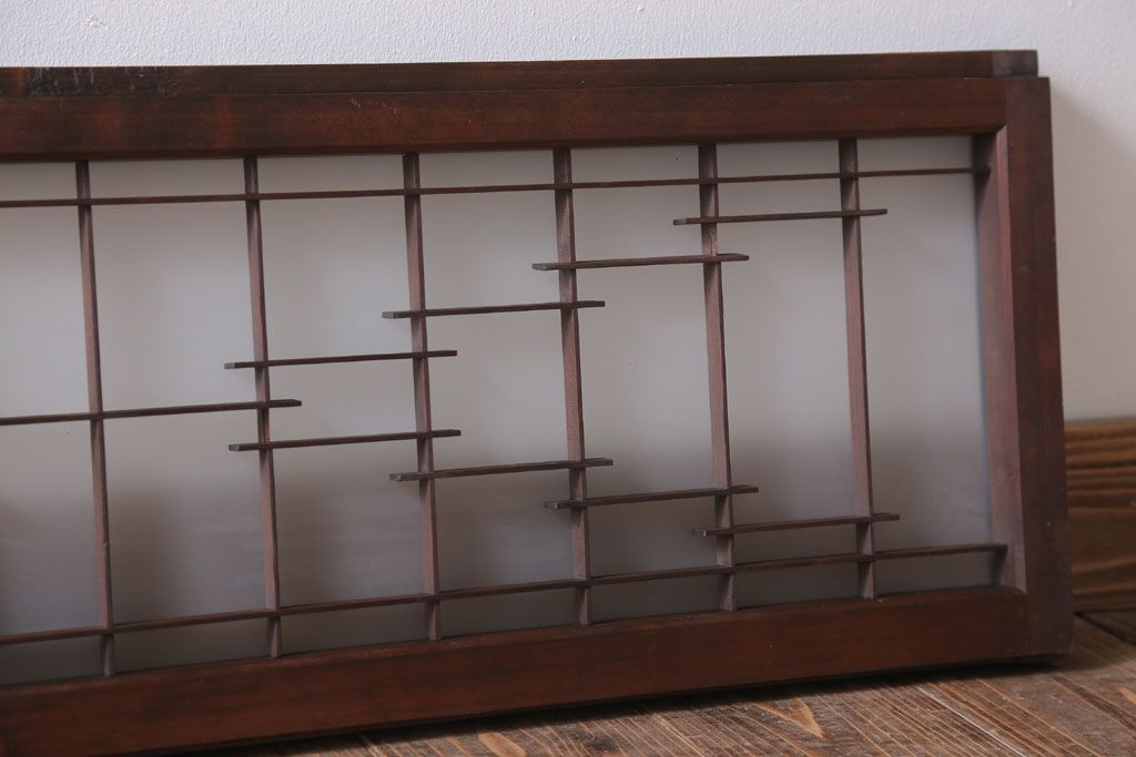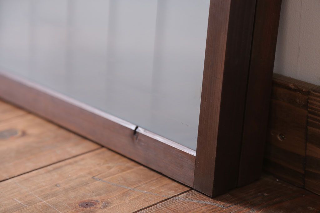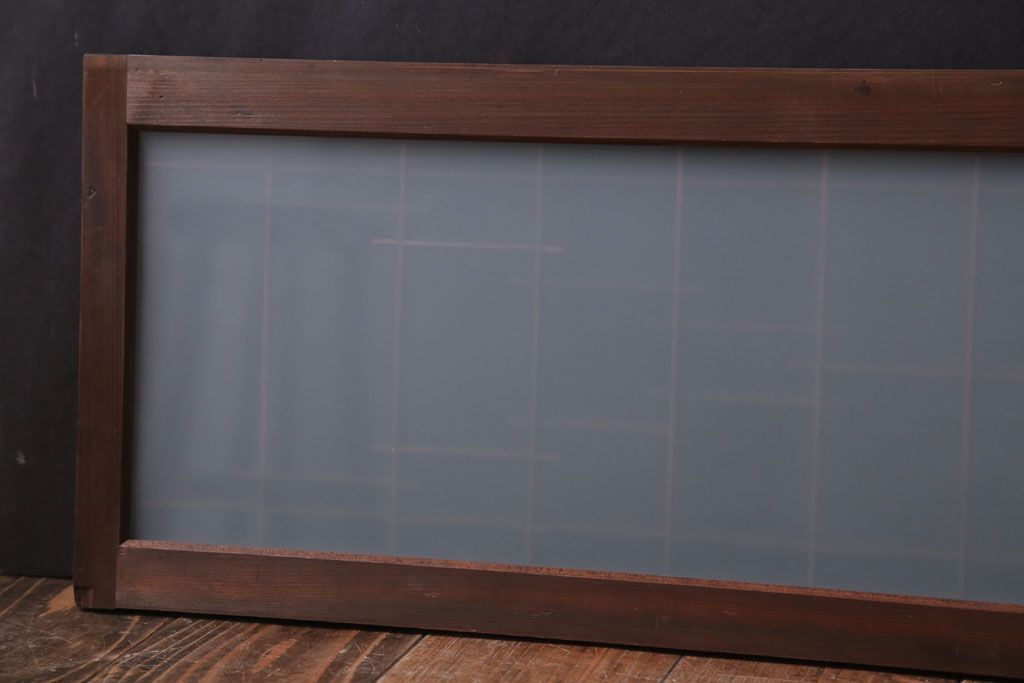 古民具・骨董 古い木製のモダンなすりガラス欄間2枚セット(明り取り)です。 古い木の質感が味わい深い、 和製アンティークの明り取り2枚セットです。 シンプルなデザインがモダンな雰囲気を醸し出す、 和モダンスタイルのインテリアにおすすめの一品です。 左側のみ計測致しましたので、そちらをご参考ください。 使用上問題のあるダメージはありません。 ■框サイズ 上20mm/左20mm/右20mm/下25mm