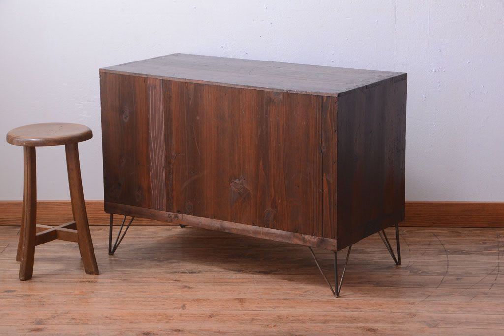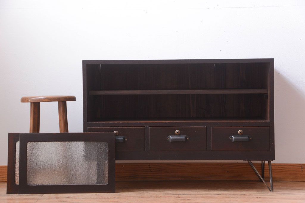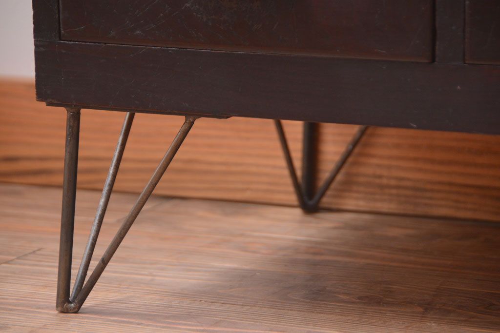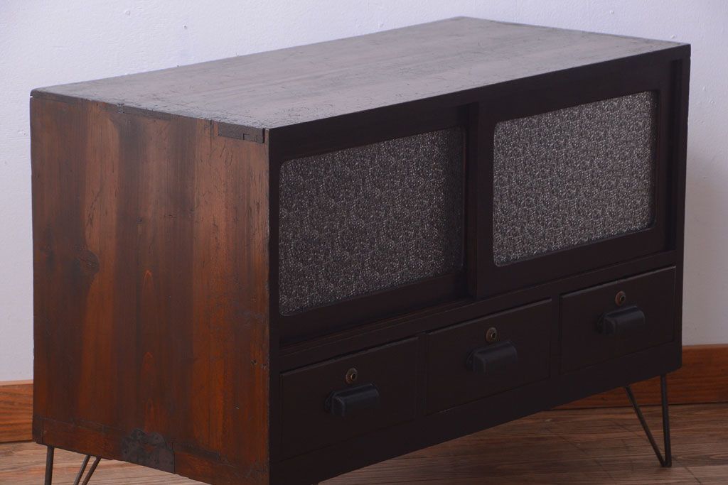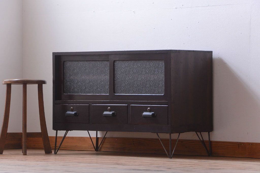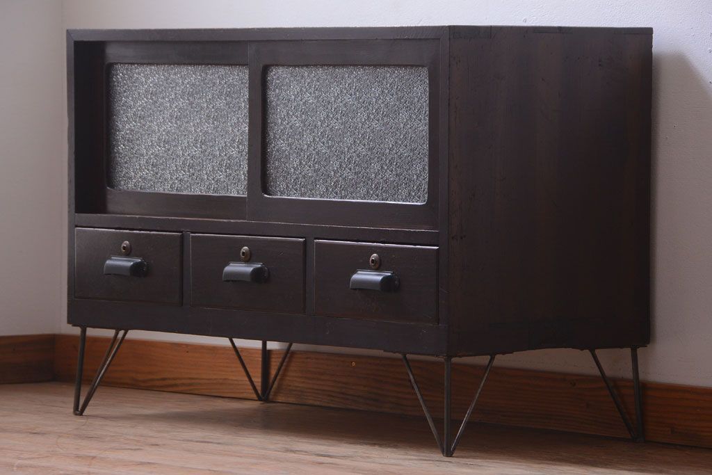 ラフジュ工房> キャビネット・戸棚> テレビ台・ローボード > アンティーク家具 アンティーク 前面栗材のダイヤガラス引き戸鉄脚ローボード
