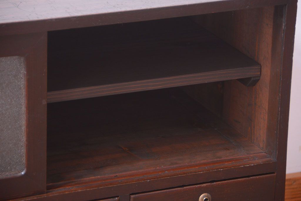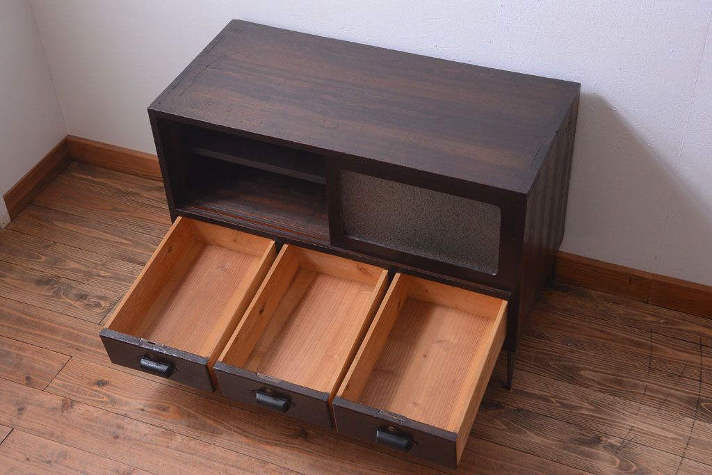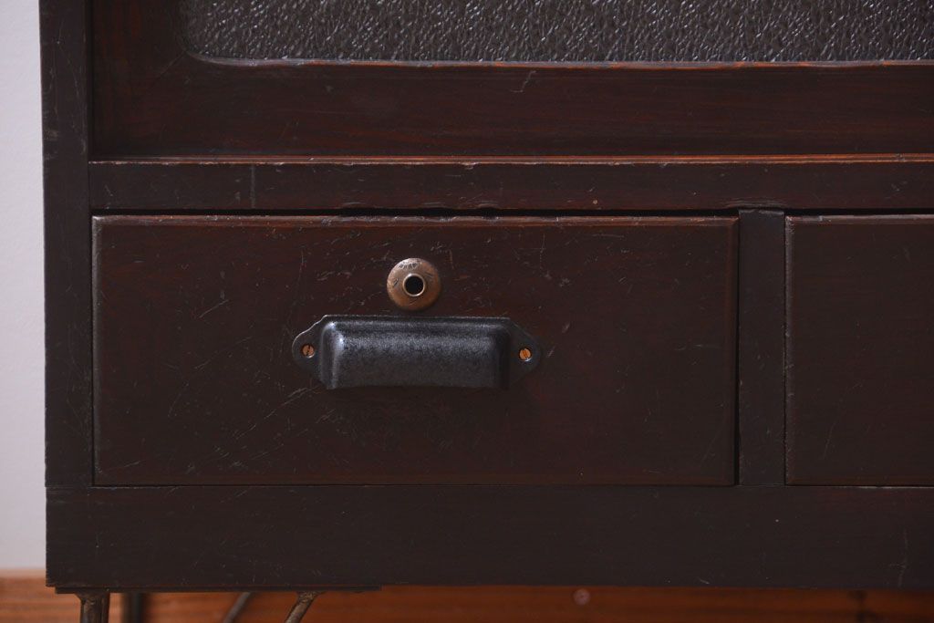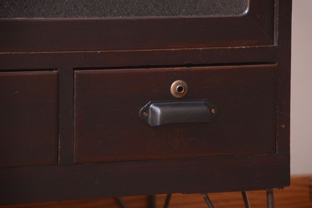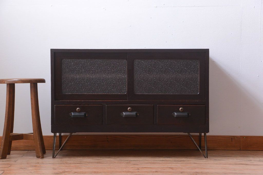 アンティーク家具 アンティーク 前面栗材のダイヤガラス引き戸鉄脚ローボード