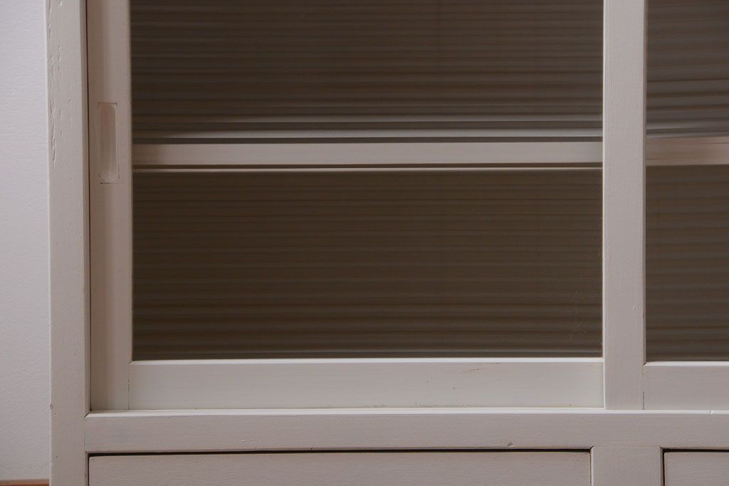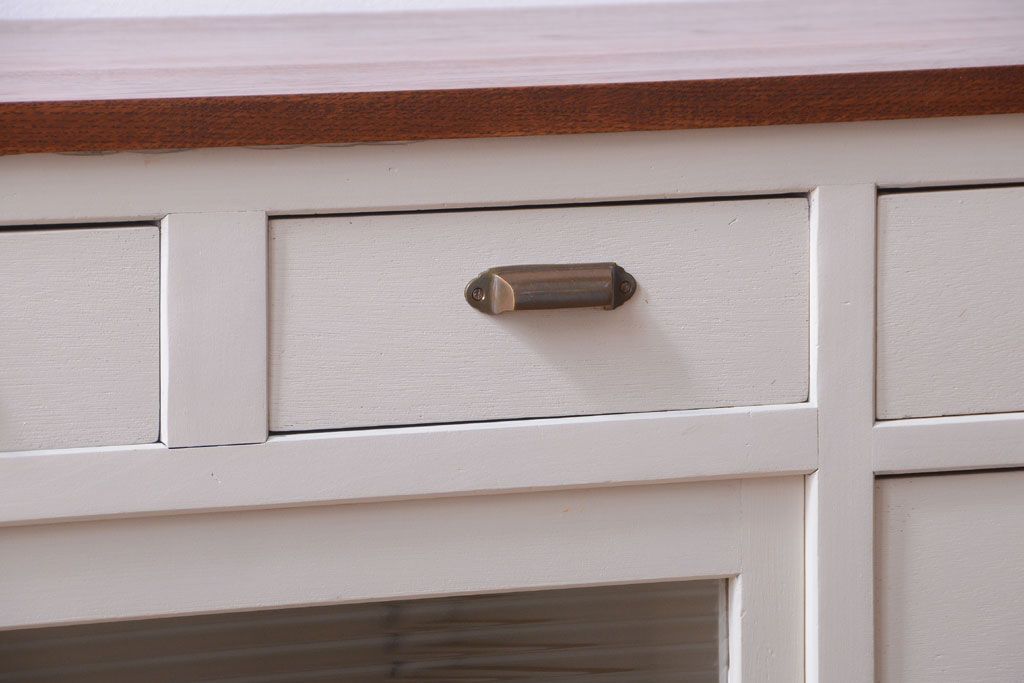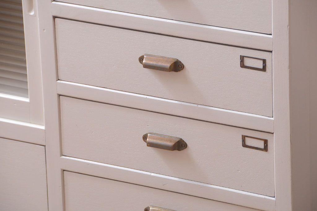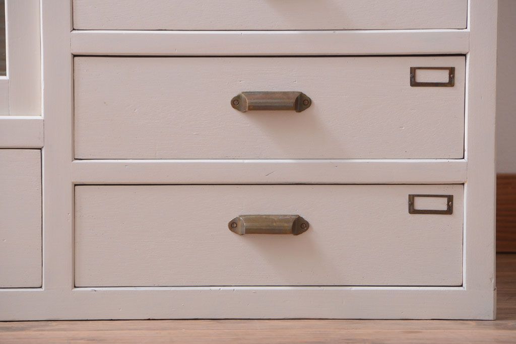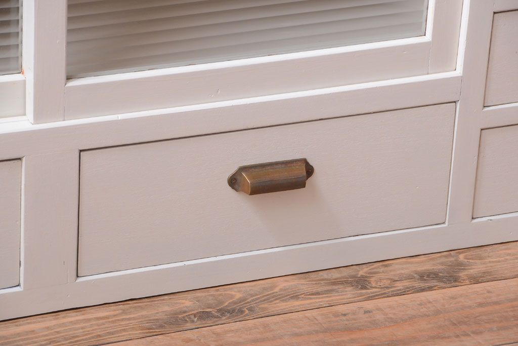 アンティークペイント ネームプレート付きモールガラス戸棚です。