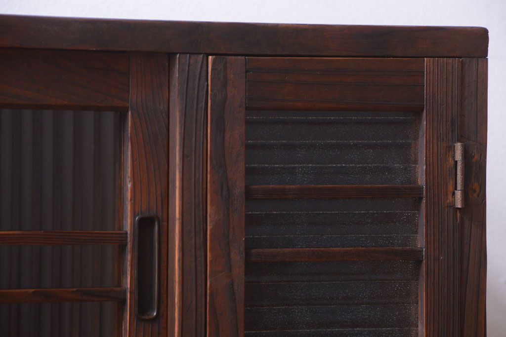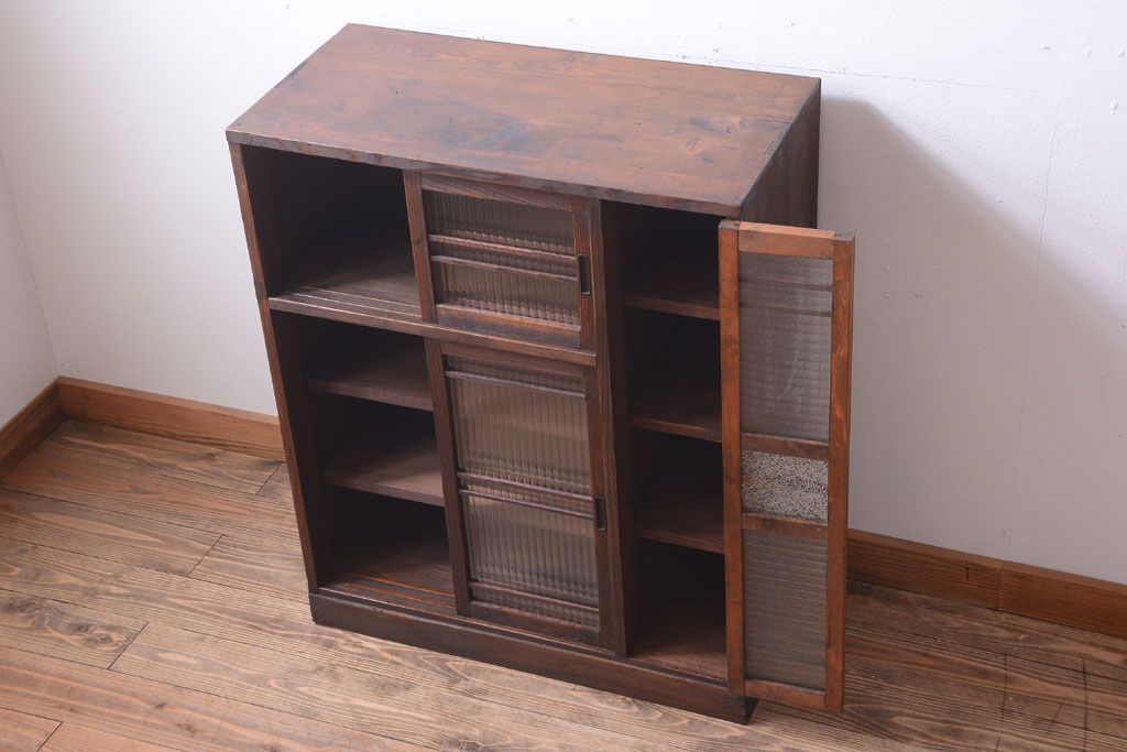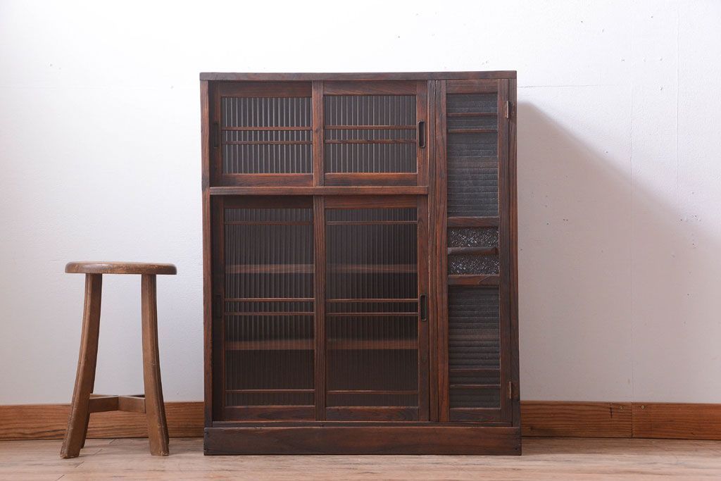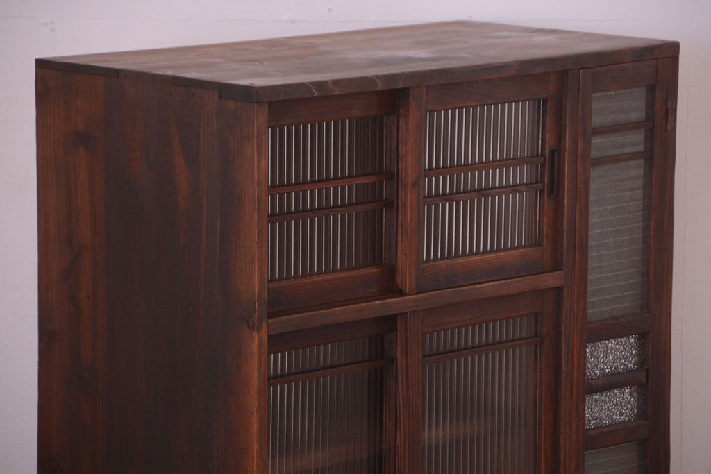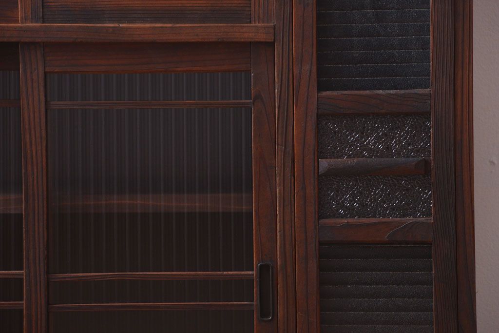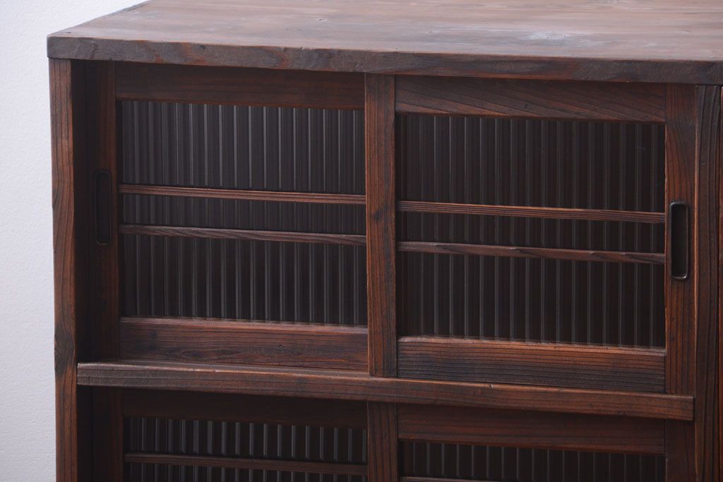 レトロ家具 和製アンティーク 3種のレトロガラス入り!古い木製の引き戸収納棚(下駄箱)