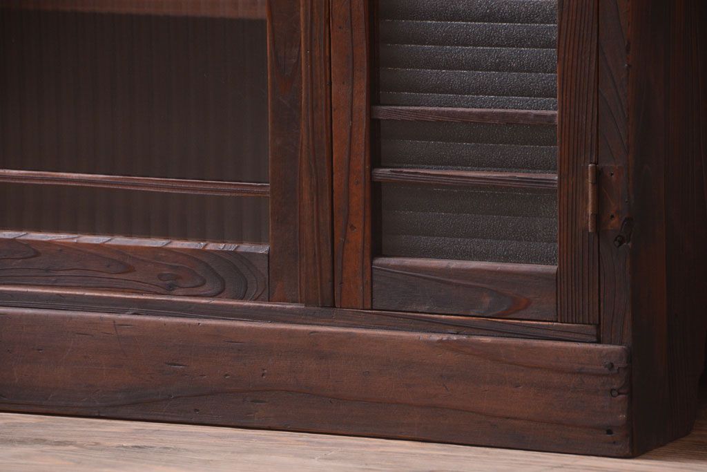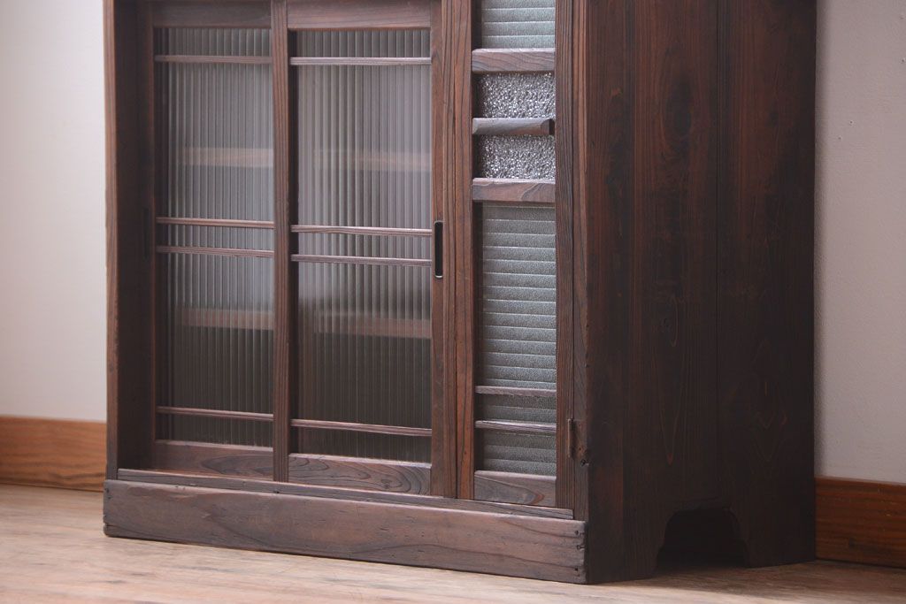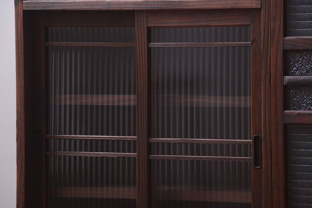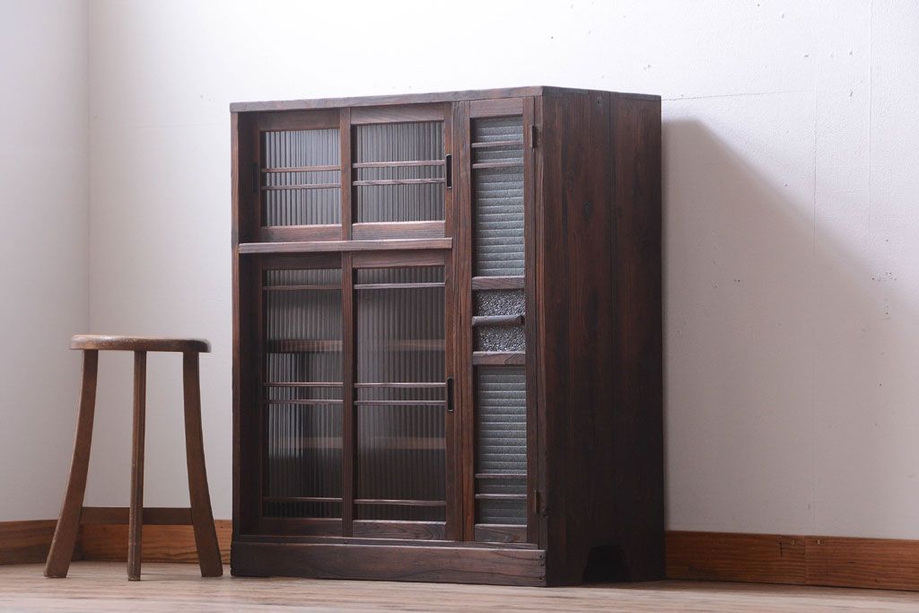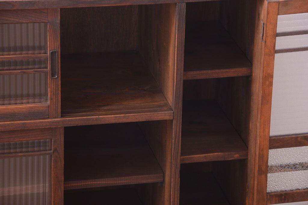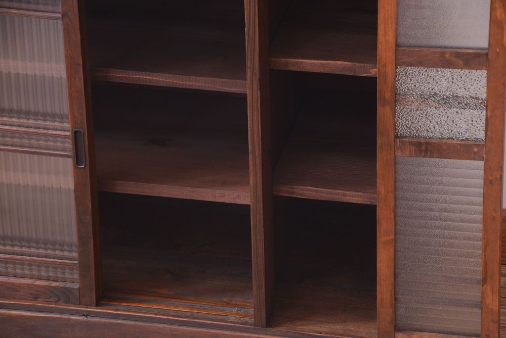 レトロ家具 和製アンティーク 3種のレトロガラス入り!古い木製の引き戸収納棚(下駄箱)