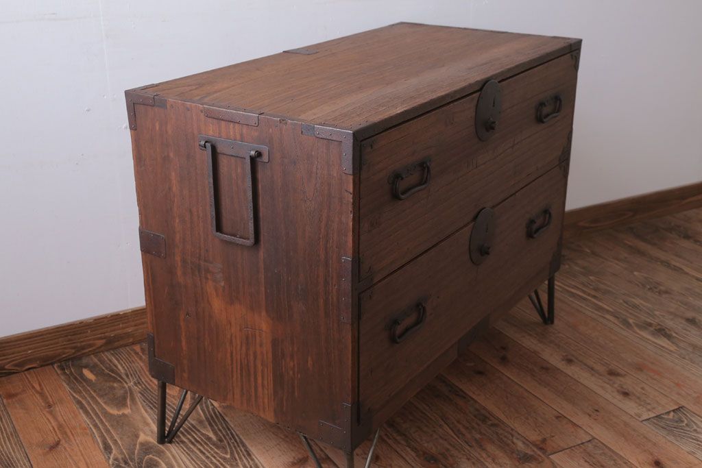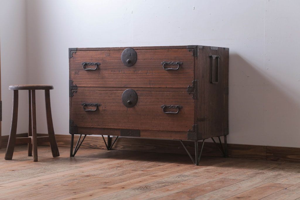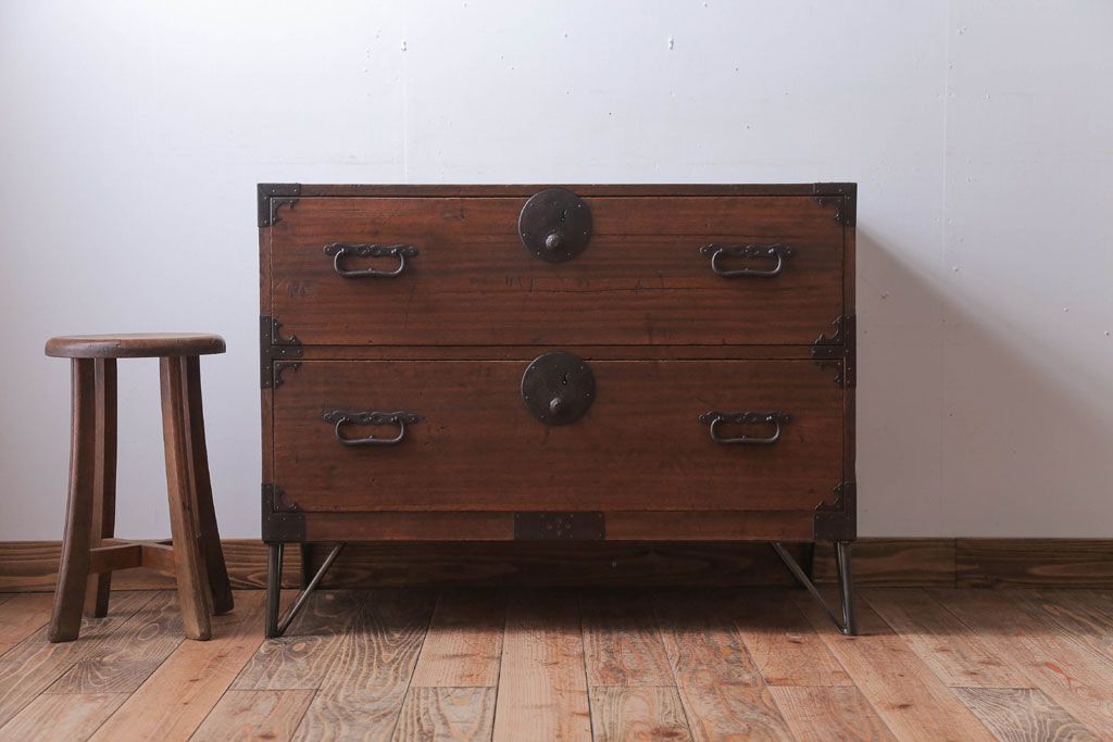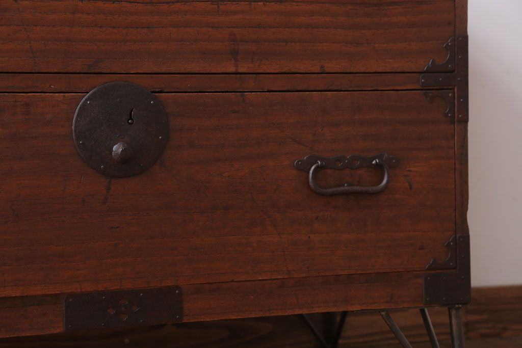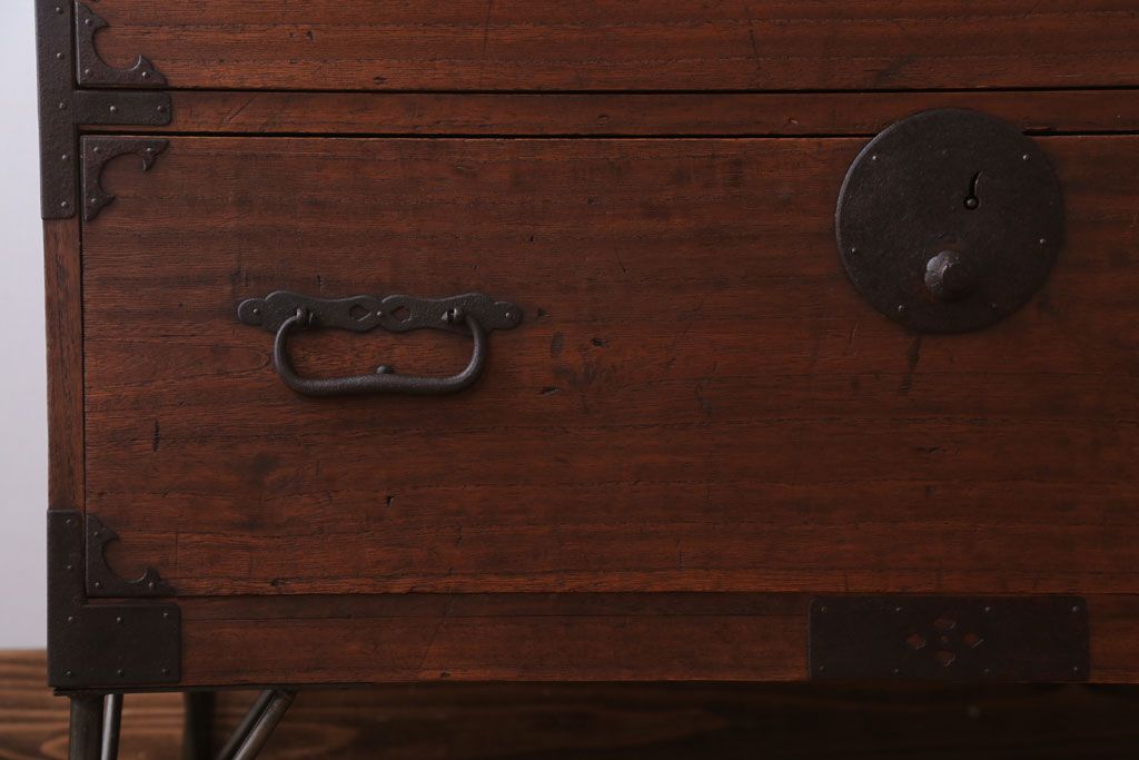 アンティーク家具 和製アンティーク 鉄脚付き!シンプルな丸金具の時代箪笥ローボード(1)