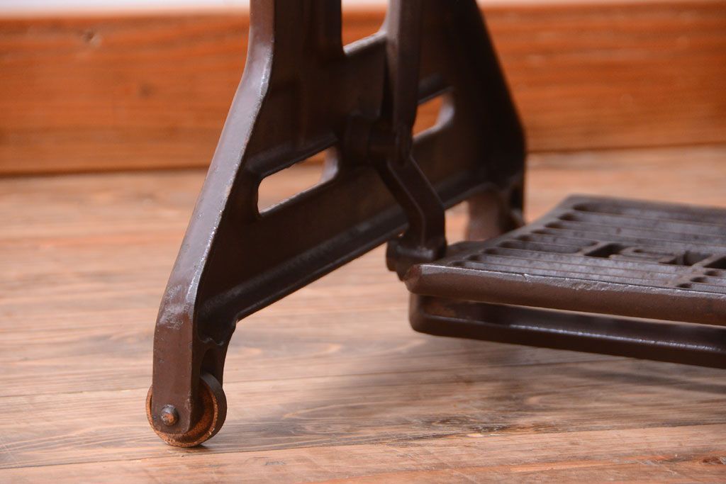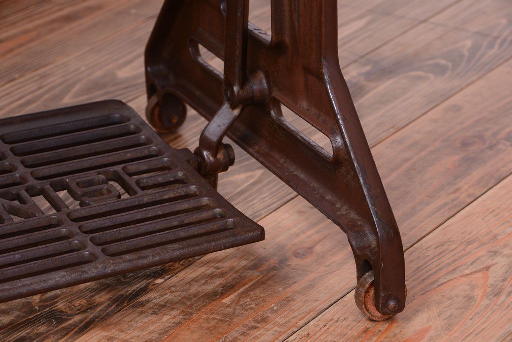古いアイアンと木の質感が味わい深いミシンテーブルです。