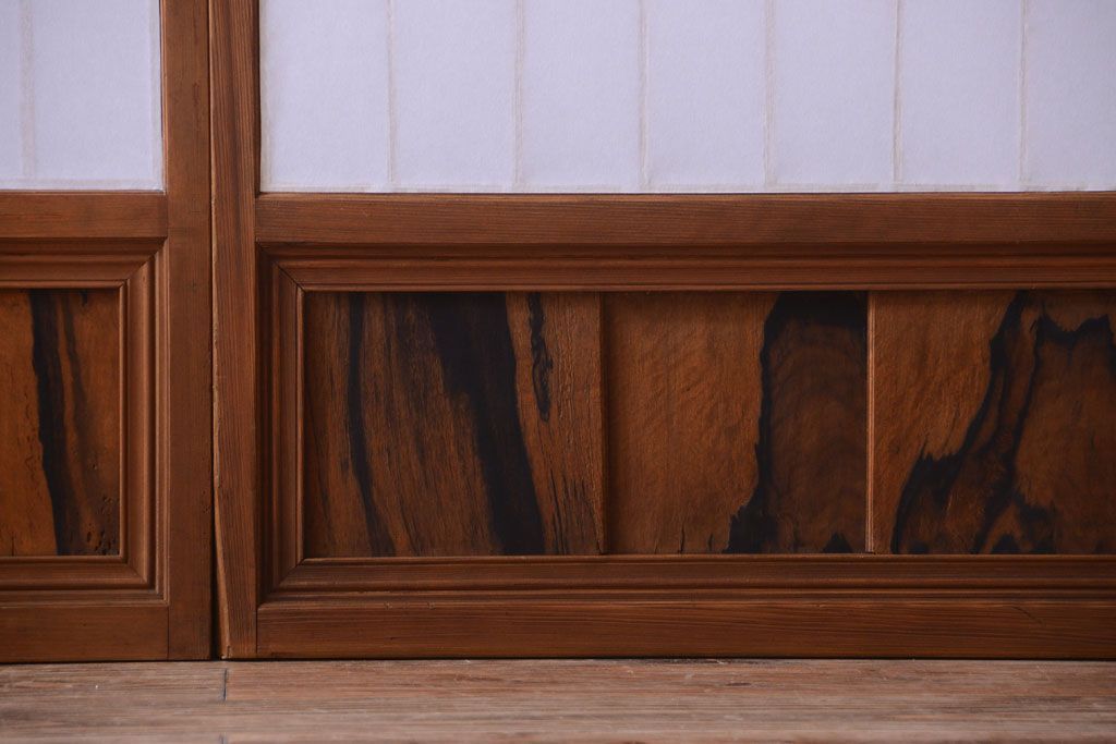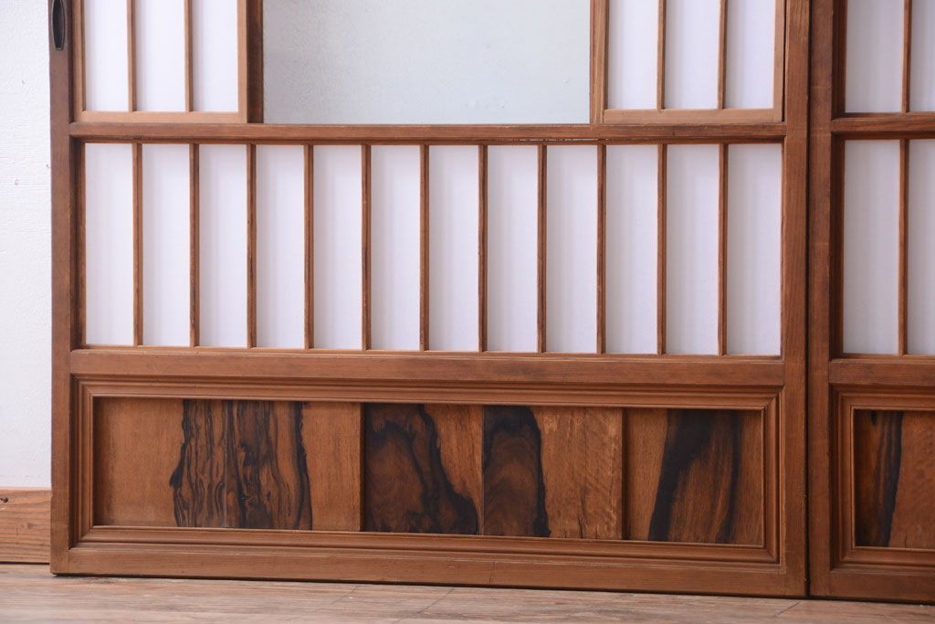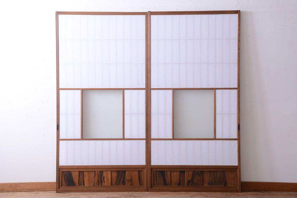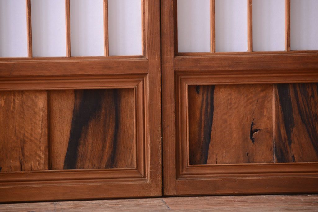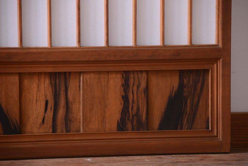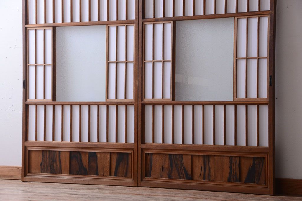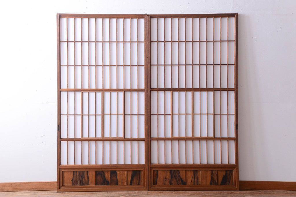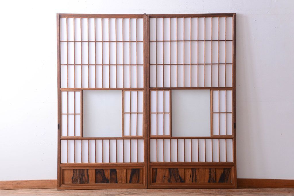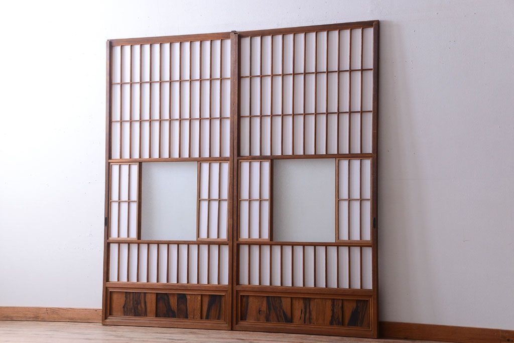 和製アンティーク 腰板黒柿材!古い雪見障子戸2枚セット(1)(引き戸、擦り上げ障子戸、擦上障子戸)