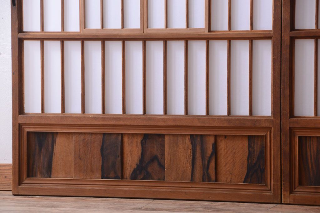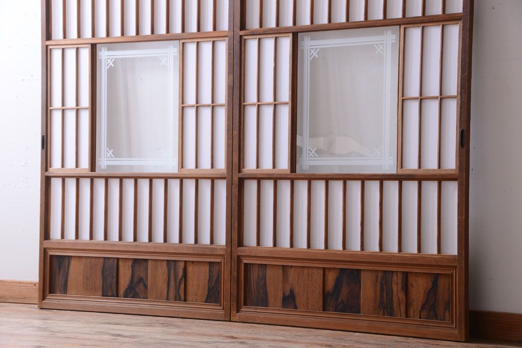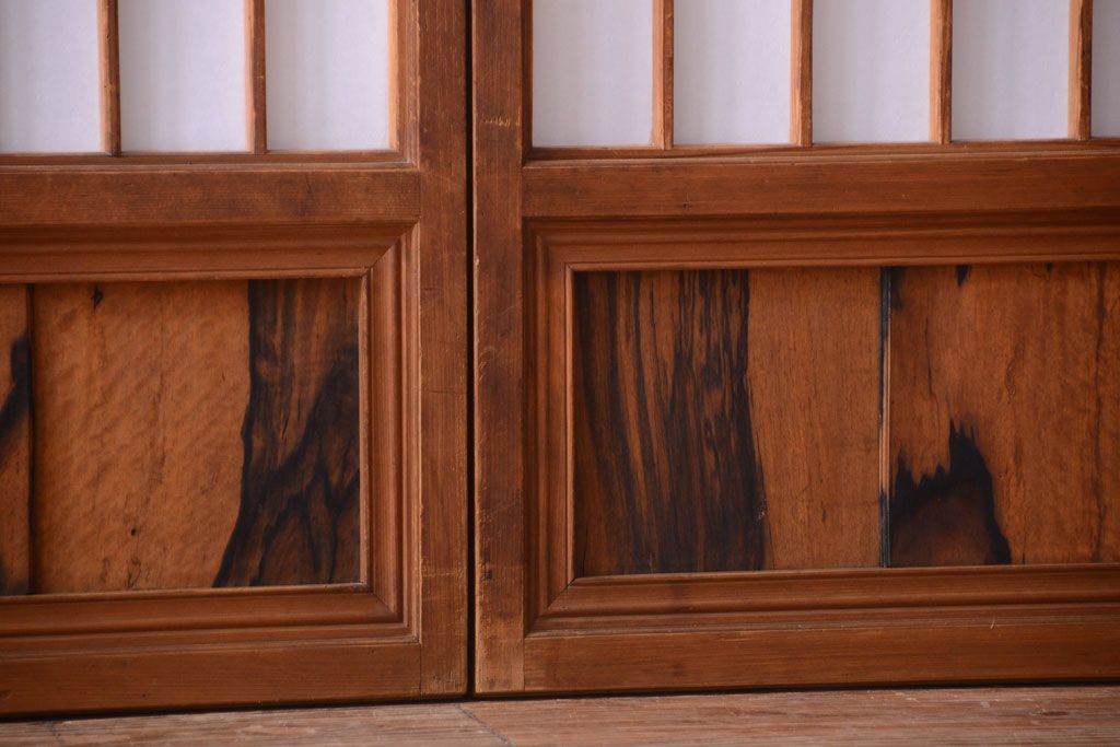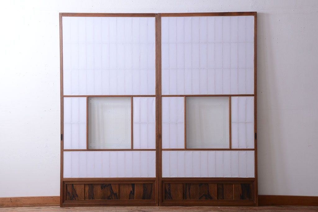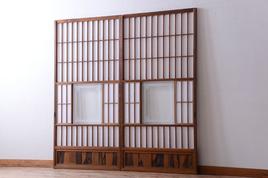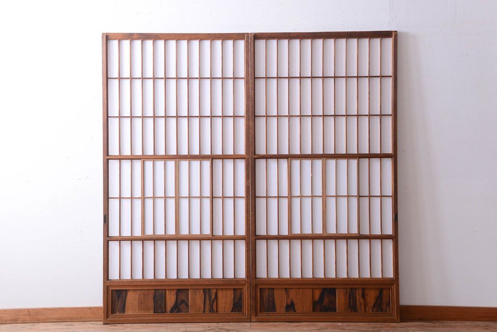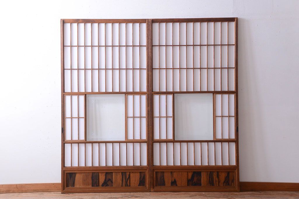 ラフジュ工房> ドア・建具> 障子戸 > 和製アンティーク 腰板黒柿材!古い雪見障子戸2枚セット(2)(引き戸、擦り上げ障子戸、擦上障子戸)