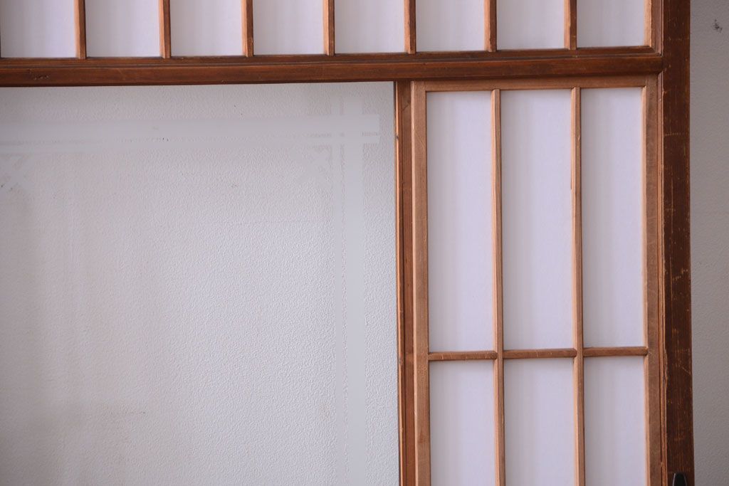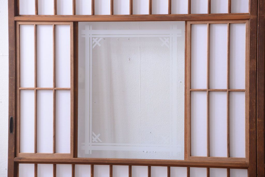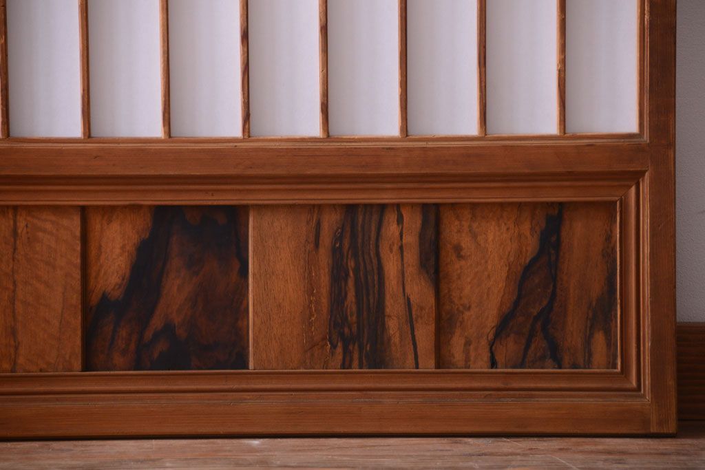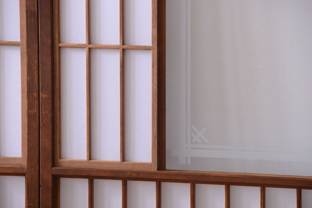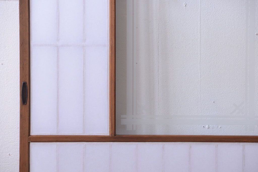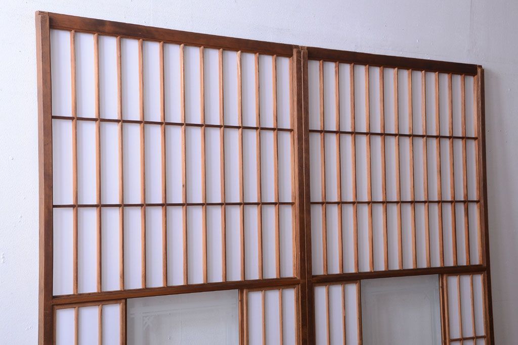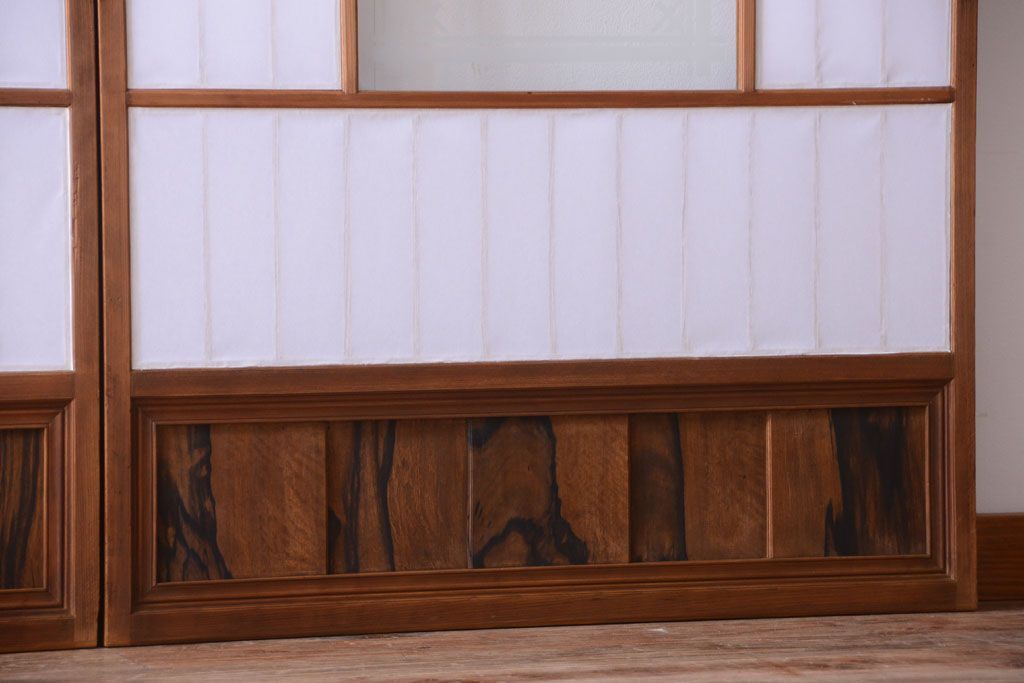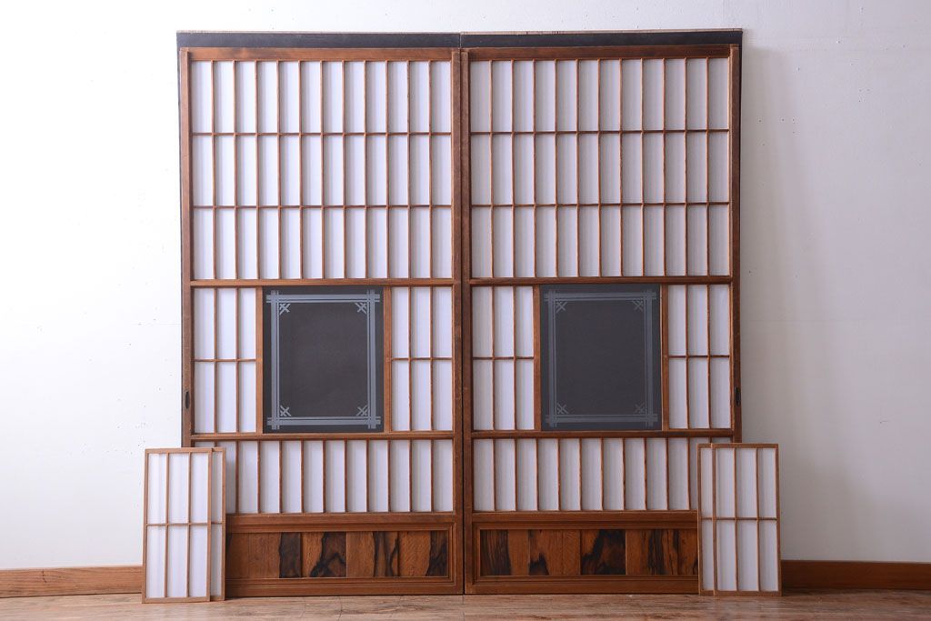 ラフジュ工房> ドア・建具> 障子戸 > 和製アンティーク 腰板黒柿材!古い雪見障子戸2枚セット(2)(引き戸、擦り上げ障子戸、擦上障子戸)