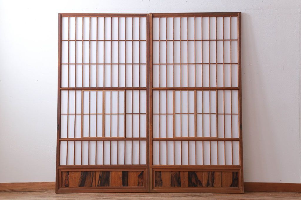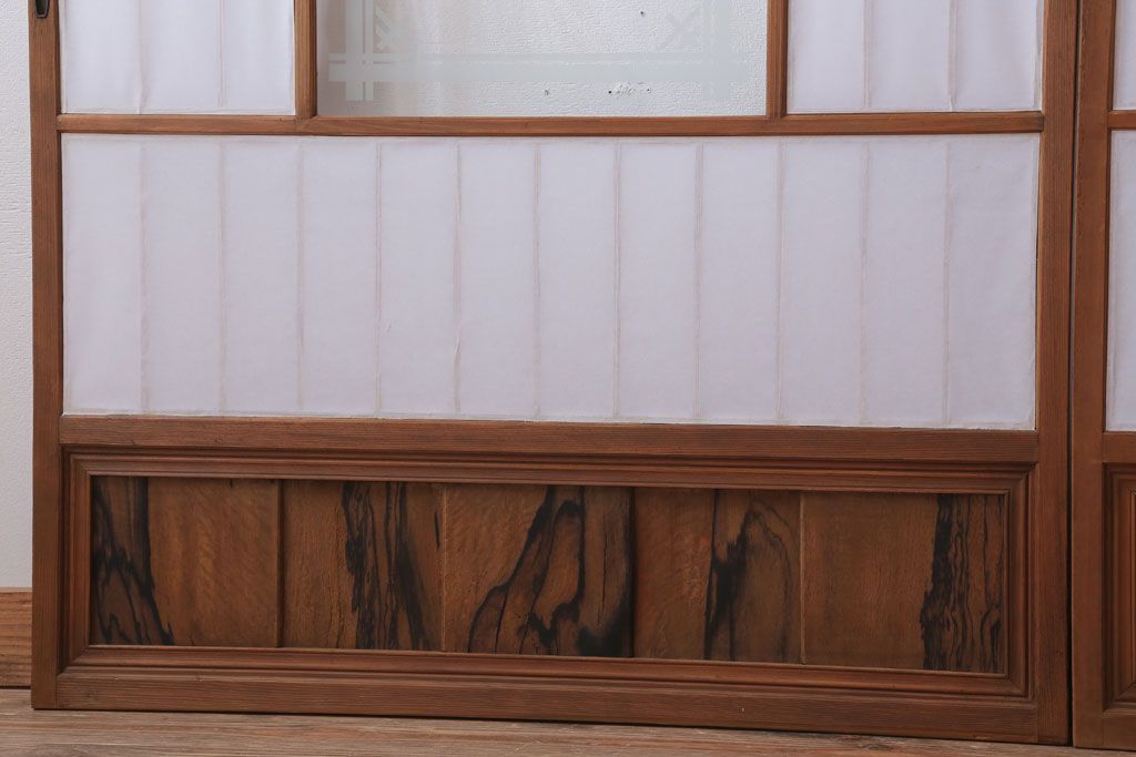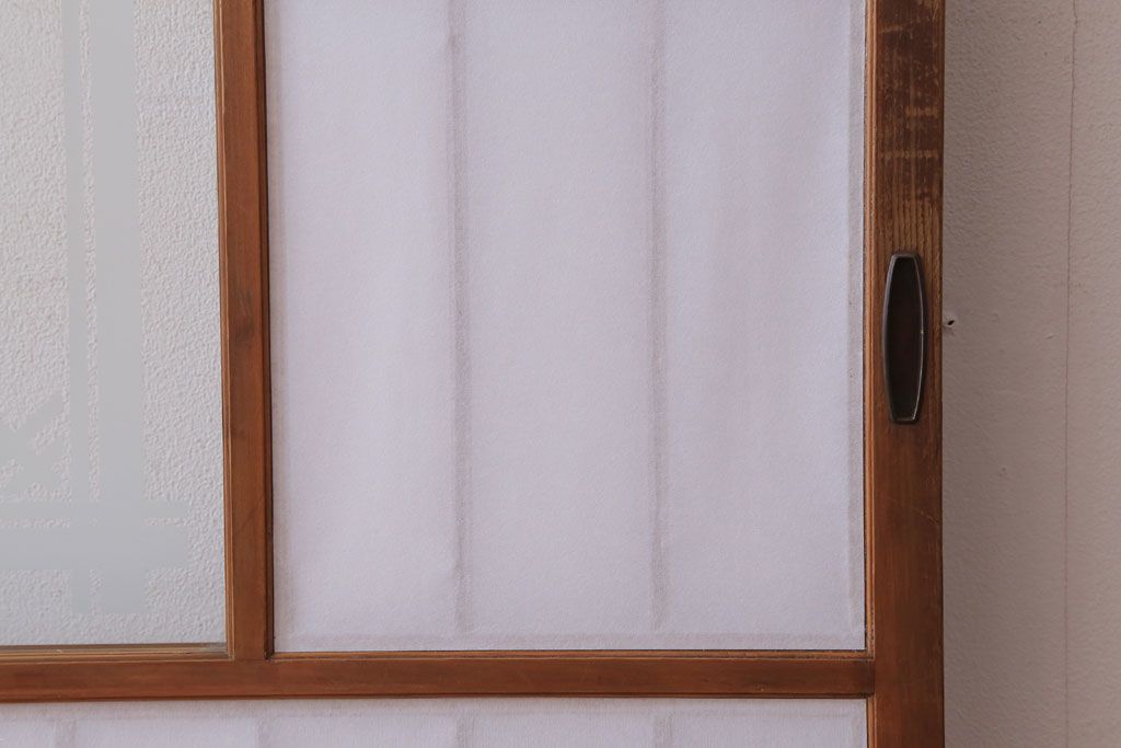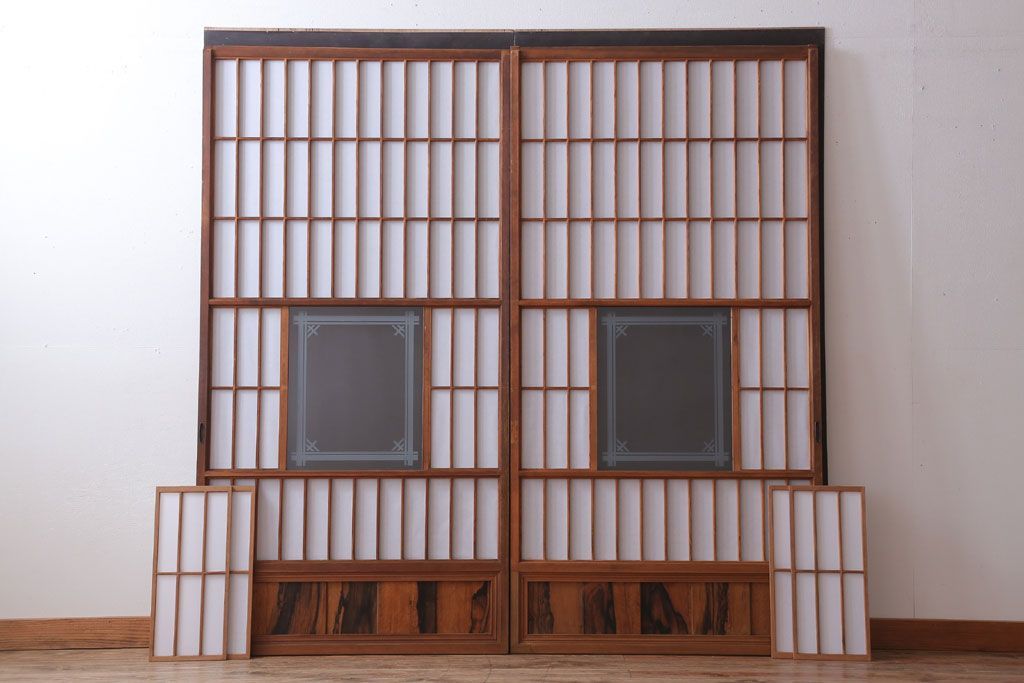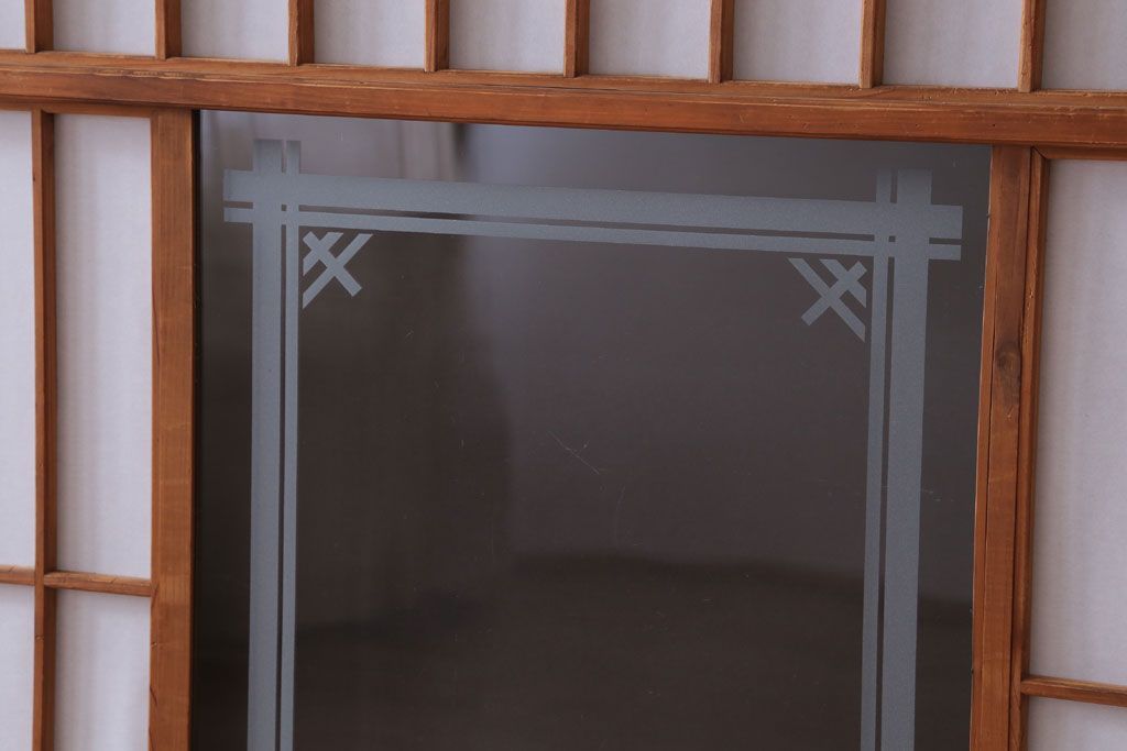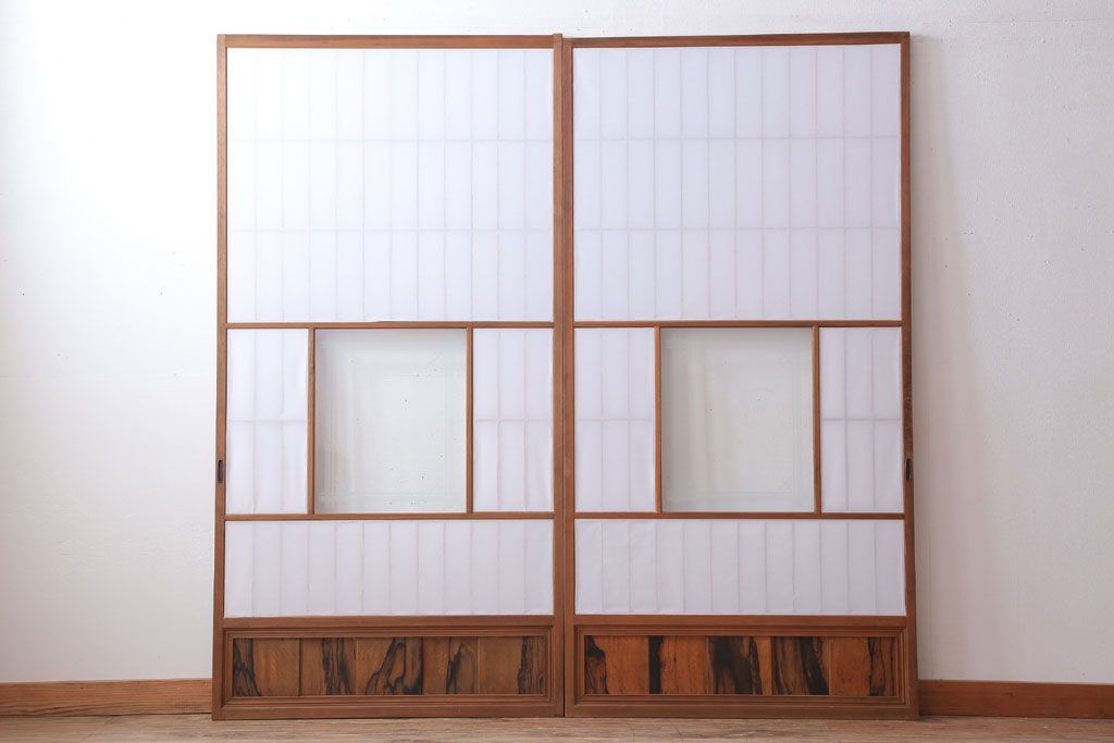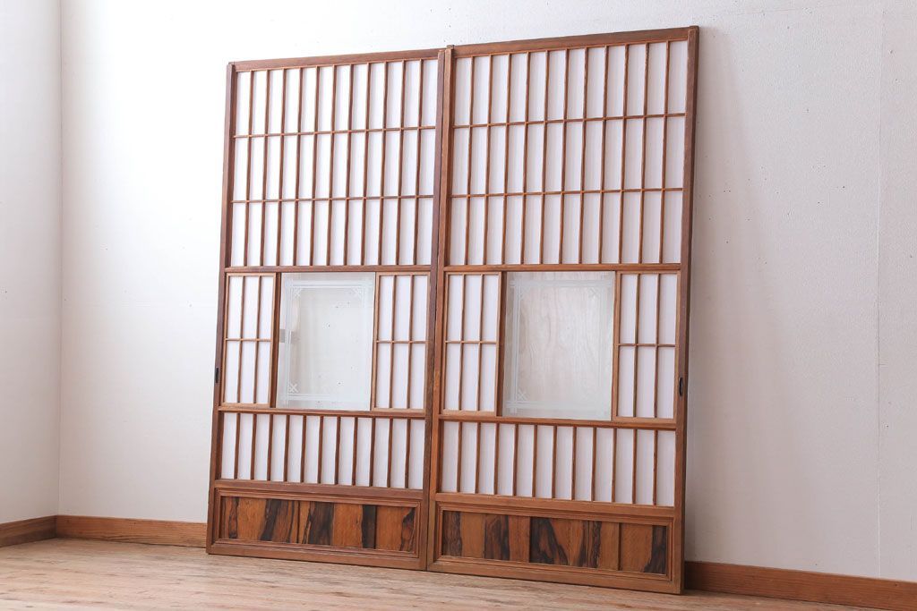 ラフジュ工房> ドア・建具> 障子戸 > 和製アンティーク 腰板黒柿材!デザインガラス入りの古い雪見障子戸2枚セット(2)(引き戸、擦り上げ障子戸、擦上障子戸)