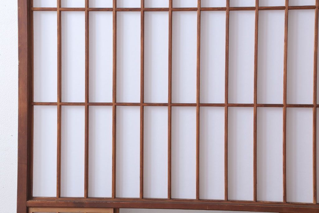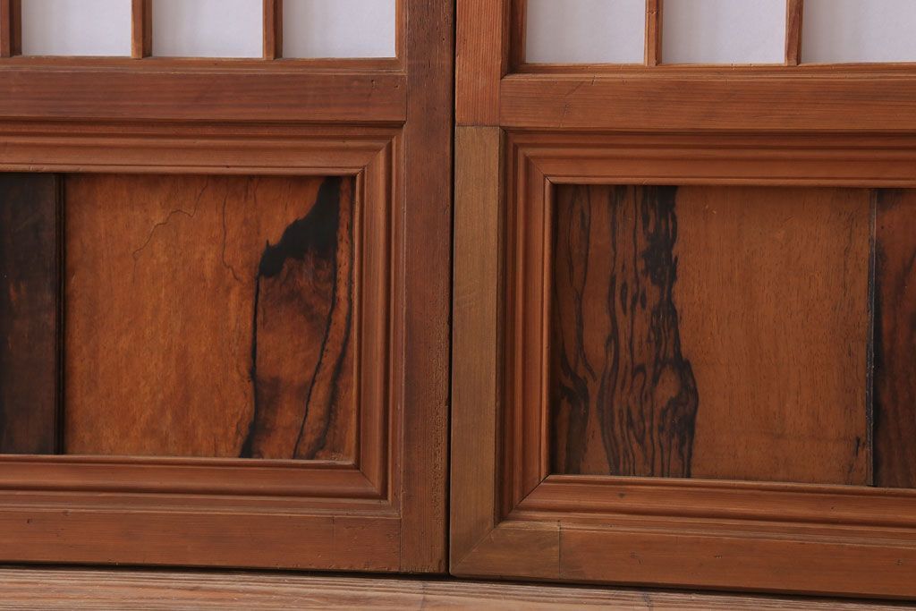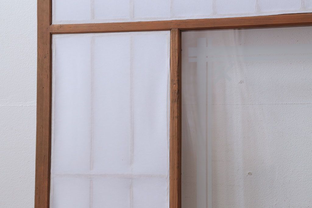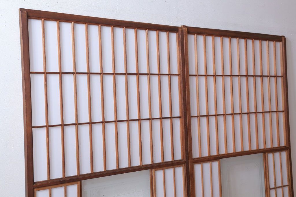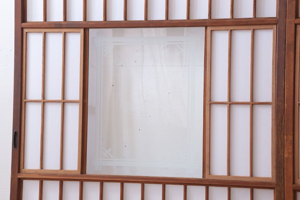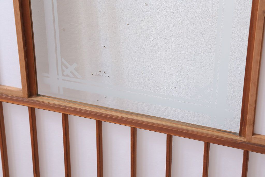 ラフジュ工房> ドア・建具> 障子戸 > 和製アンティーク 腰板黒柿材!デザインガラス入りの古い雪見障子戸2枚セット(2)(引き戸、擦り上げ障子戸、擦上障子戸)