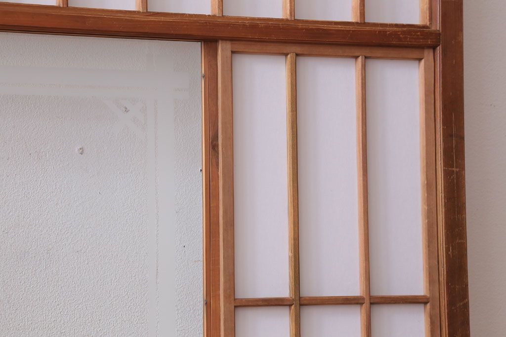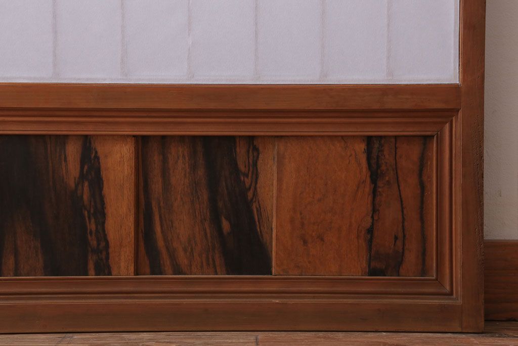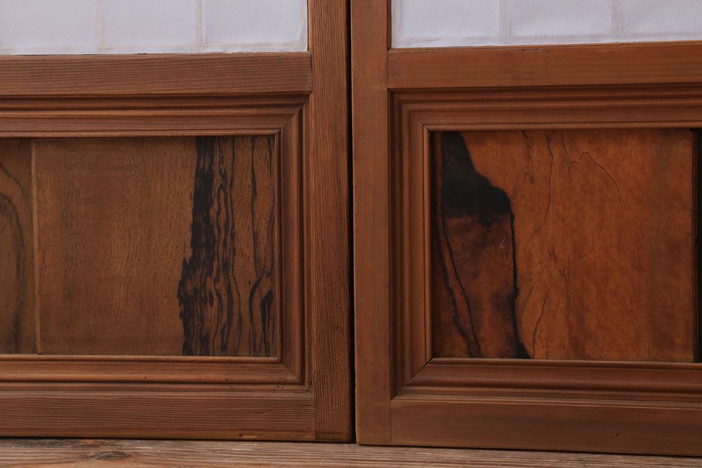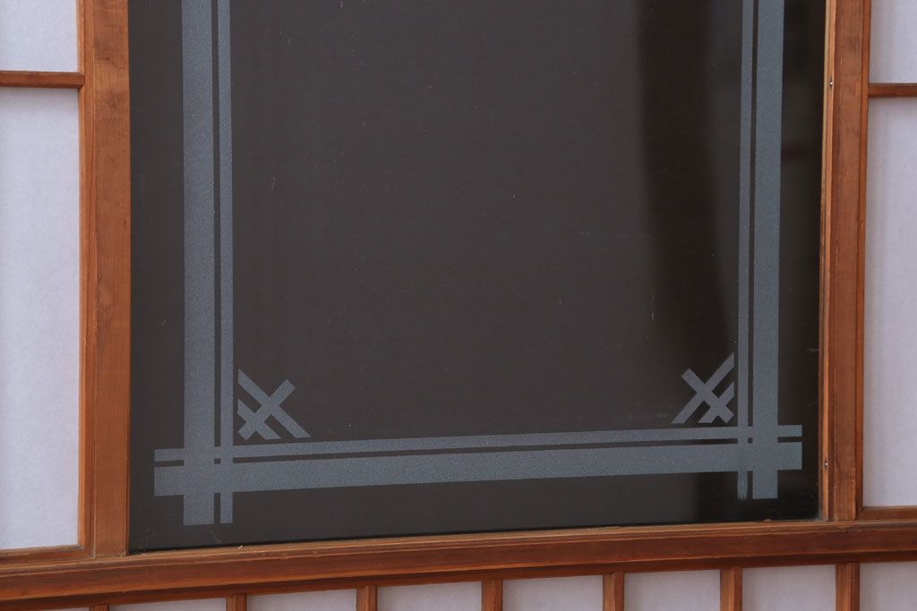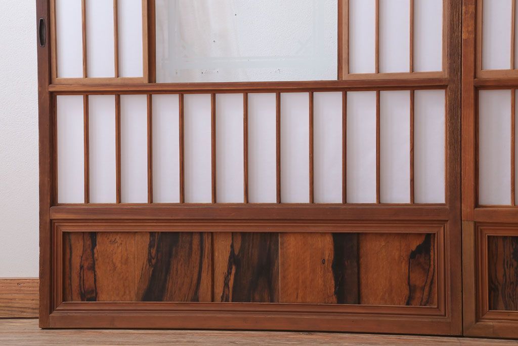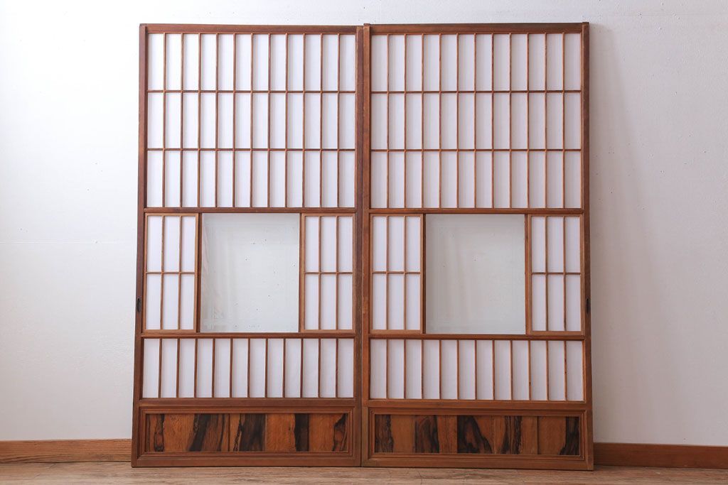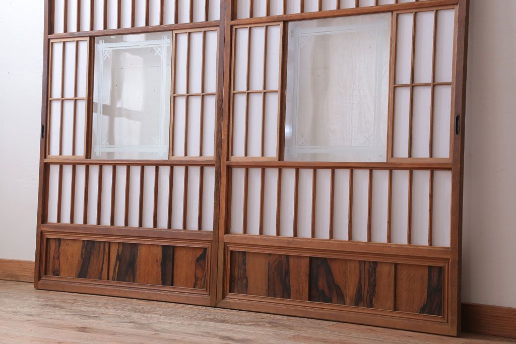 和製アンティーク 腰板黒柿材!デザインガラス入りの古い雪見障子戸2枚セット(2)(引き戸、擦り上げ障子戸、擦上障子戸)