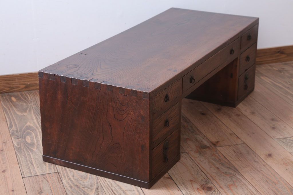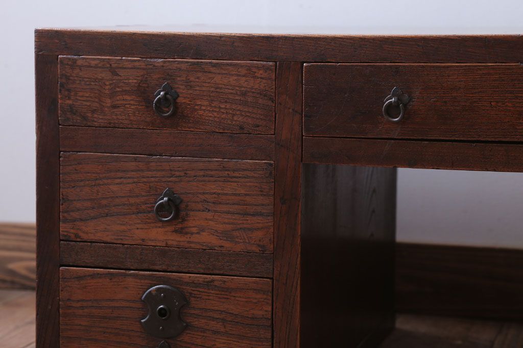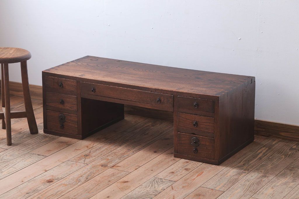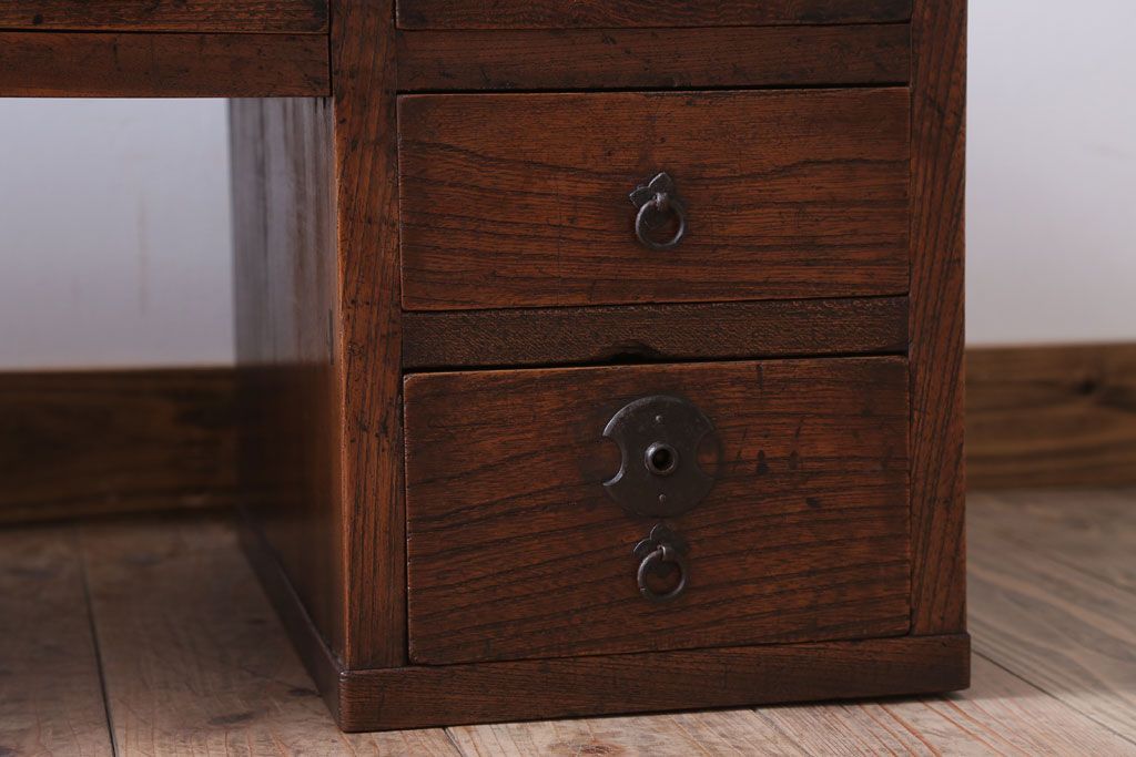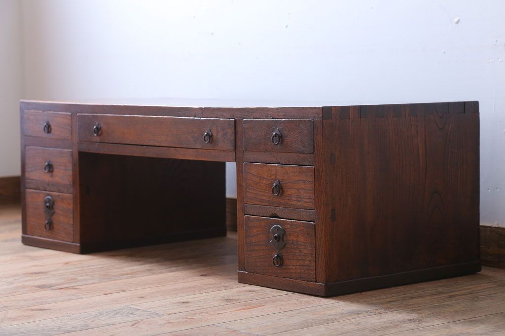 古民具・骨董 明治〜大正期!総欅材の高級アンティーク帳場机(両袖机・文机)です。
