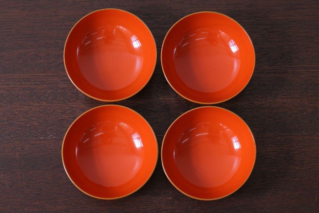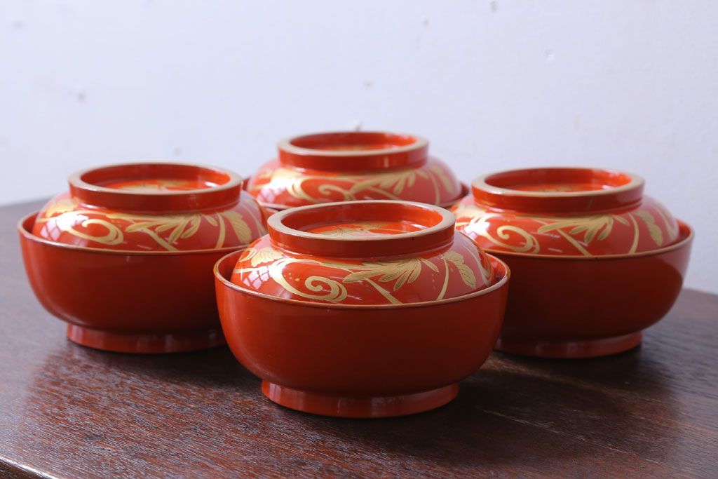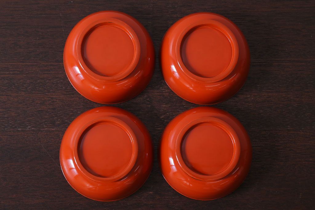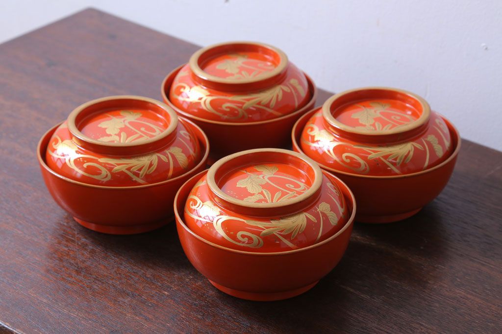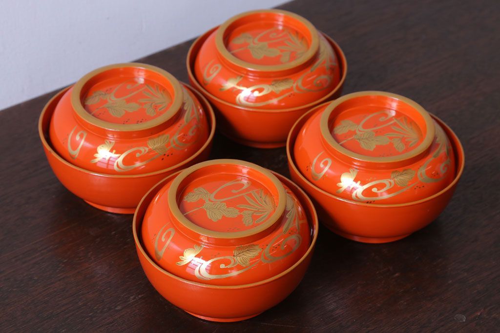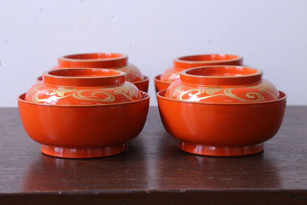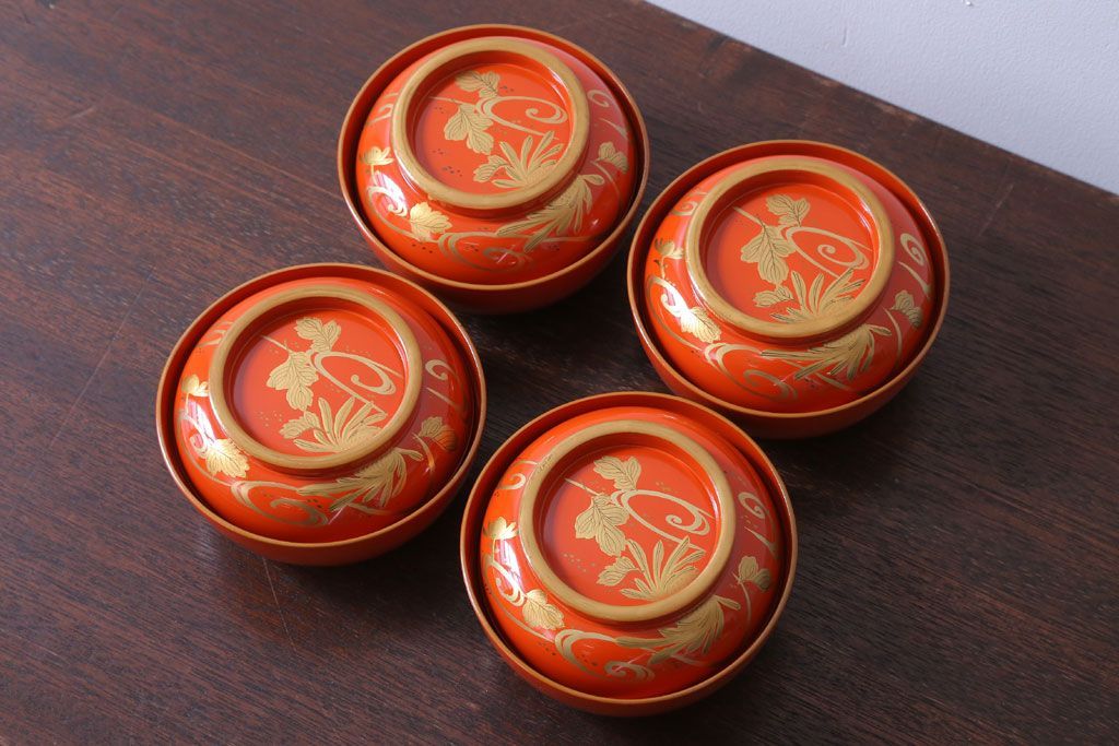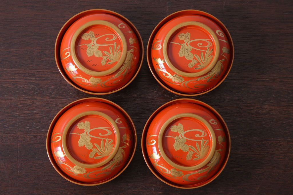 アンティーク雑貨 アンティーク 大正〜昭和初期 木製朱塗蒔絵椀4客セット(漆器)
