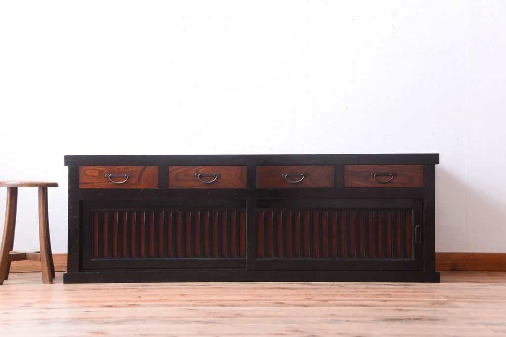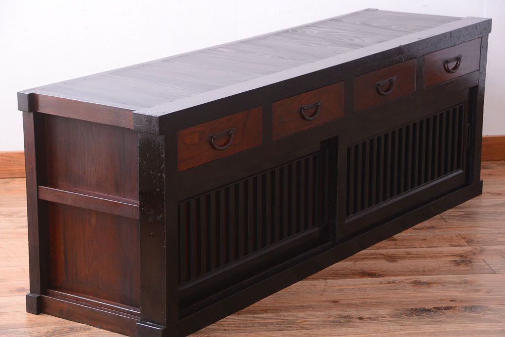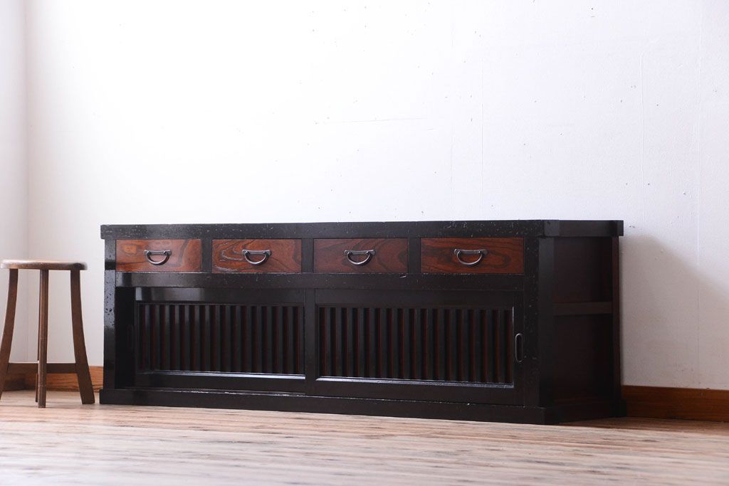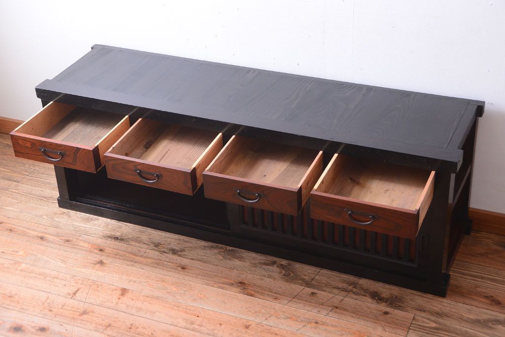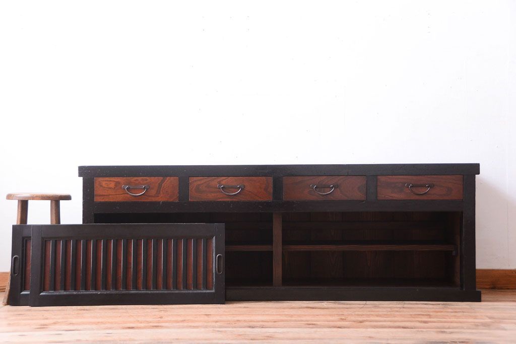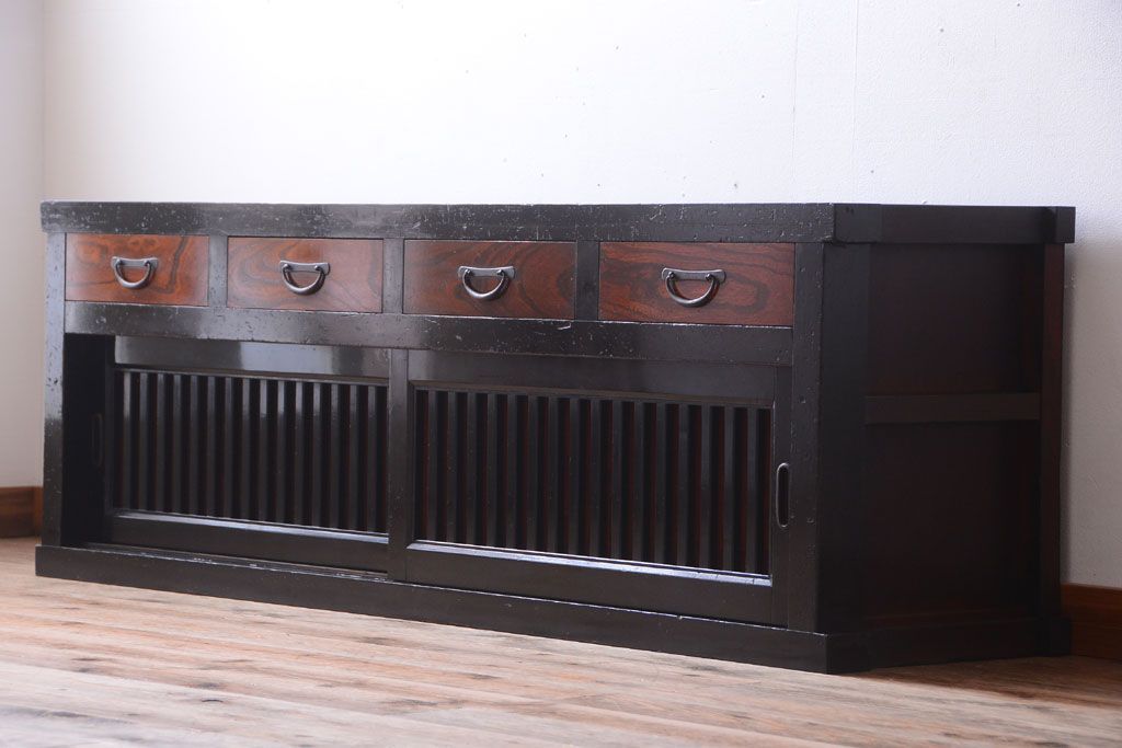 アンティーク家具 古民具・骨董 明治期 框が太く重厚なアンティーク引き出し付き時代箪笥ローボード(水屋箪笥、テレビ台、キャビネット、収納棚)