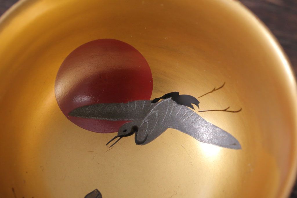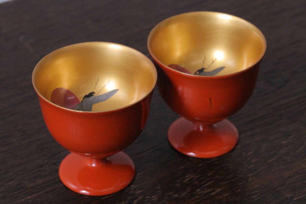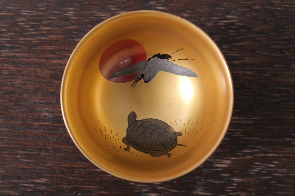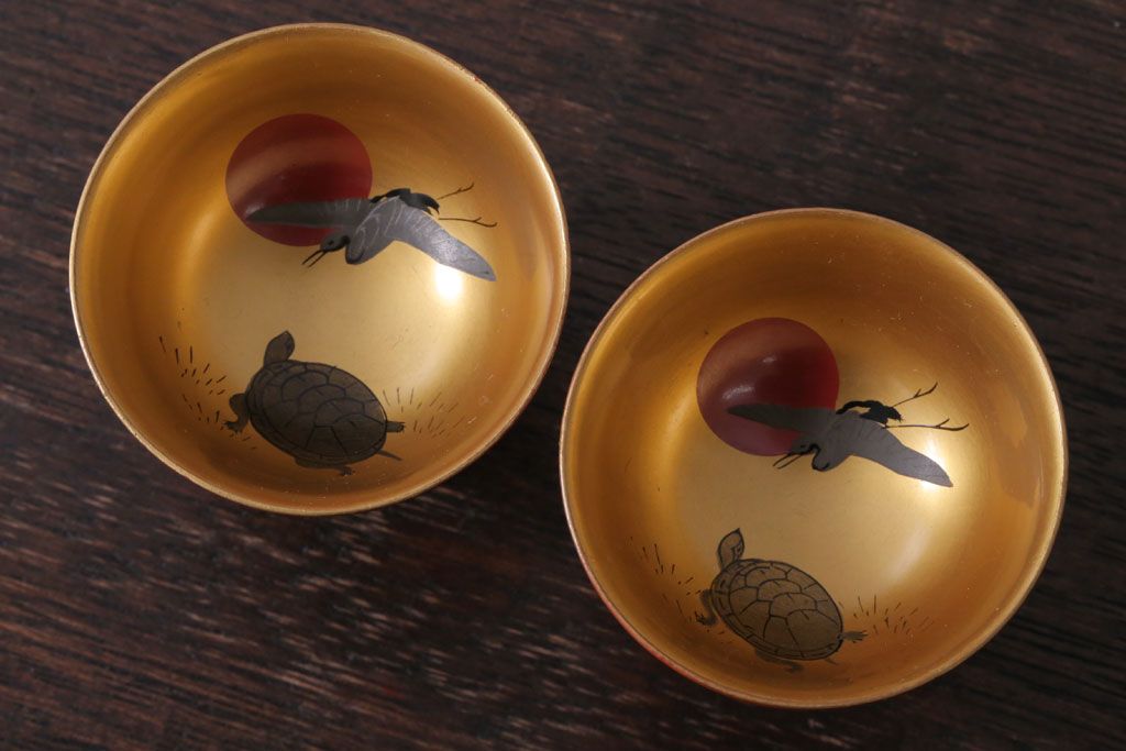 アンティーク雑貨 大正〜昭和初期 鶴亀の図 木製蒔絵盃2客(漆器・杯)
